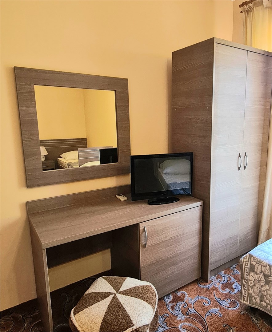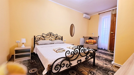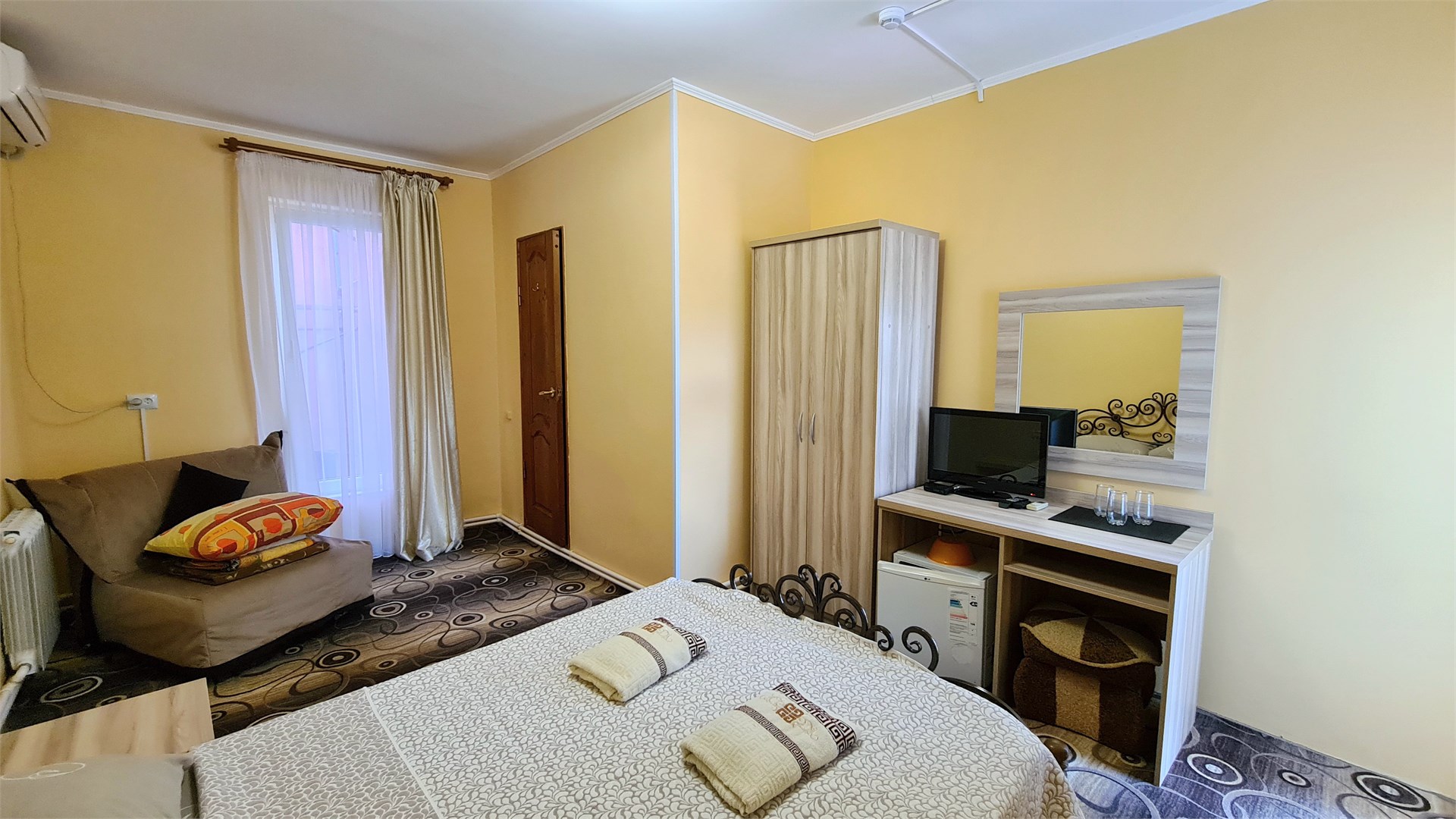 В номере: кресло-кровать, кровать двуспальная, прикроватные тумбочки, стол, шкаф, мини-холодильник, сплит-система, телевизор