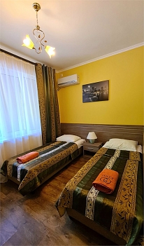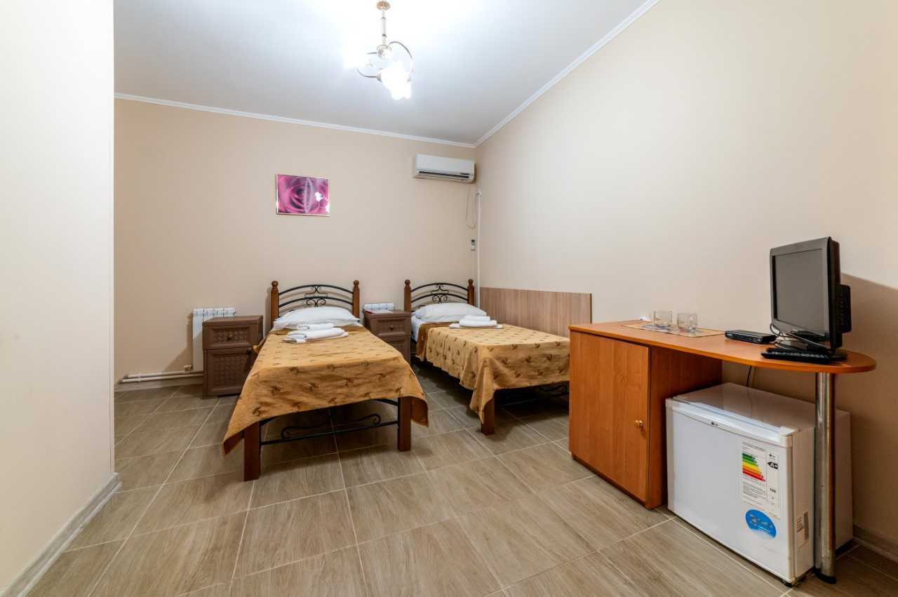 В номере: кровати односпальные, прикроватные тумбочки, пуфик, стол, шкаф, мини-холодильник, сплит-система, телевизор