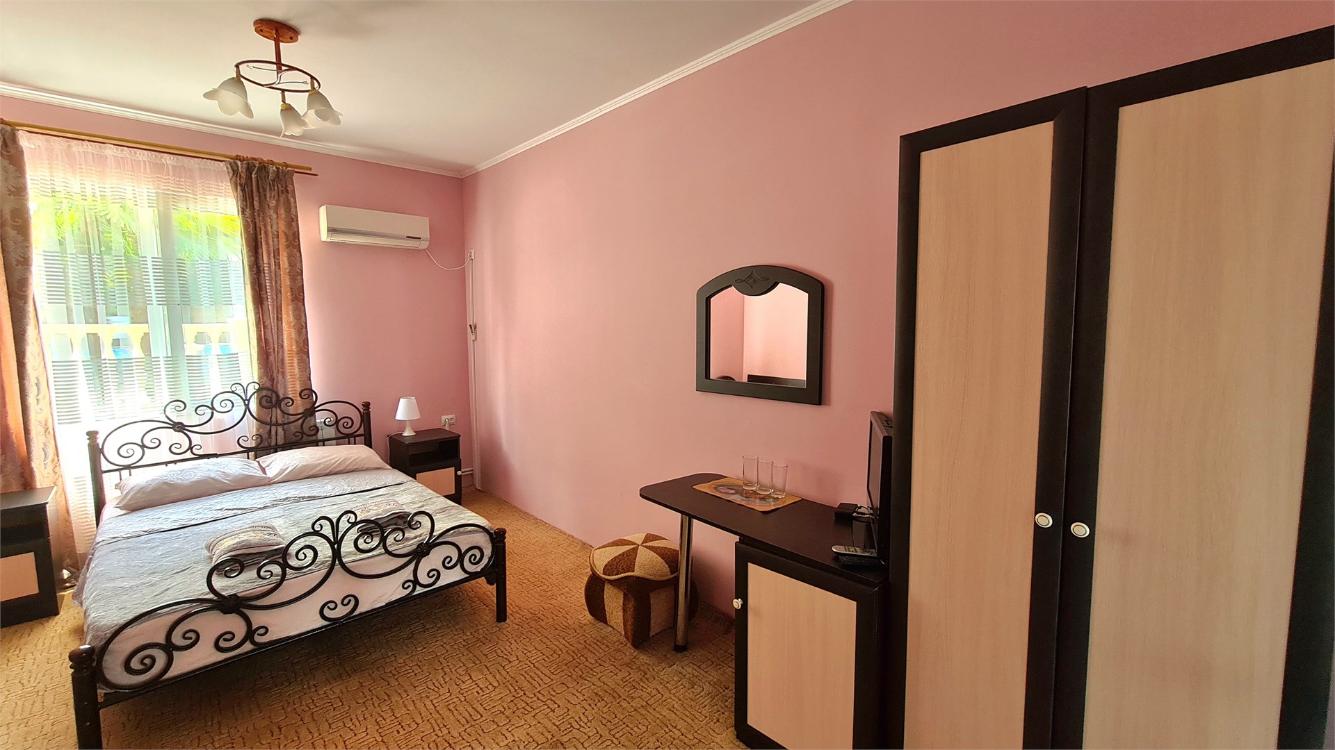 В номере: кровать двуспальная, прикроватные тумбочки, пуфик, стол, шкаф, мини-холодильник, сплит-система, телевизор