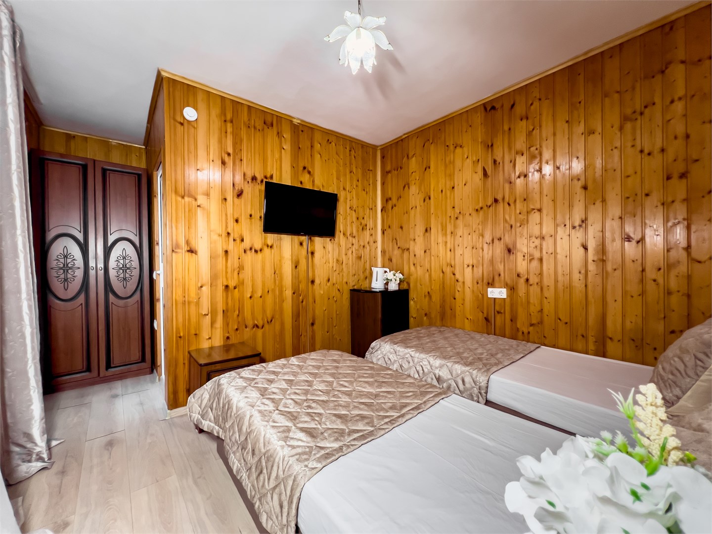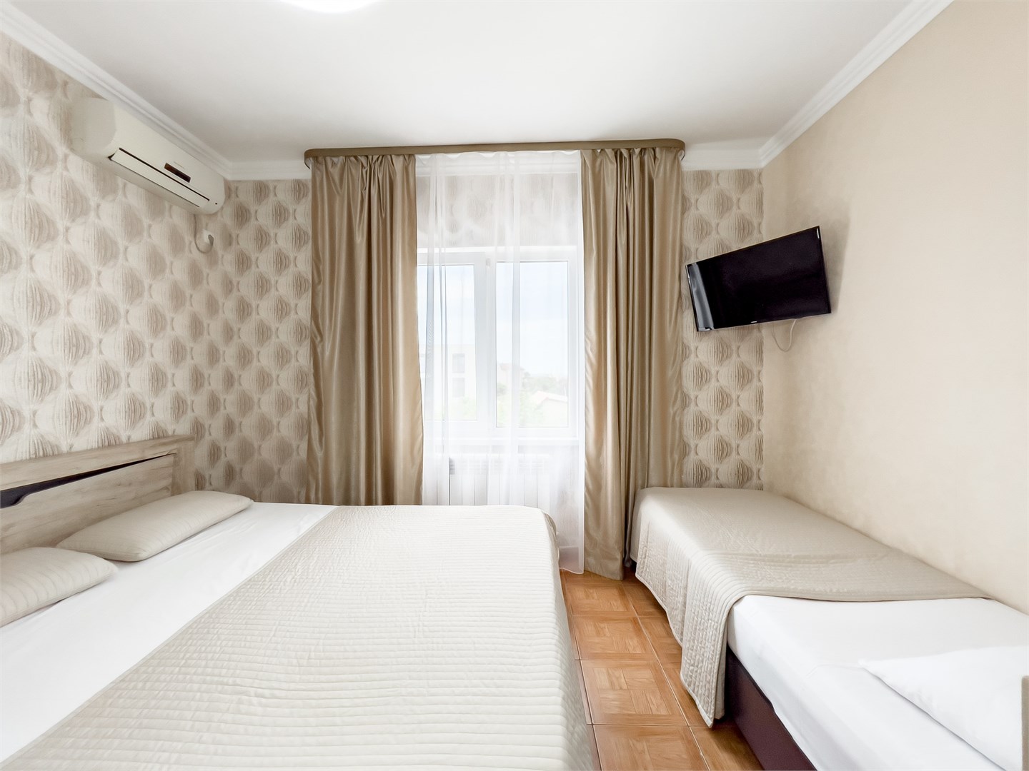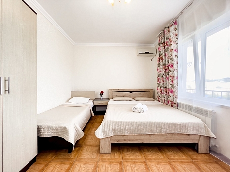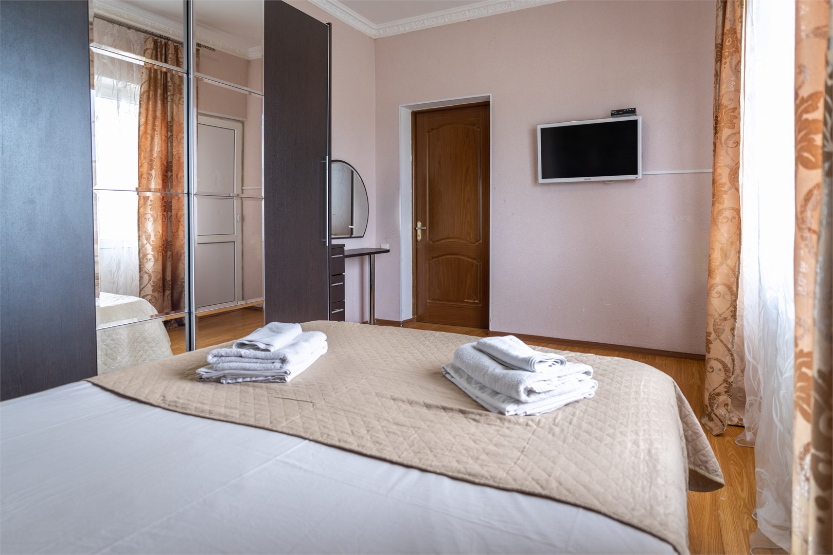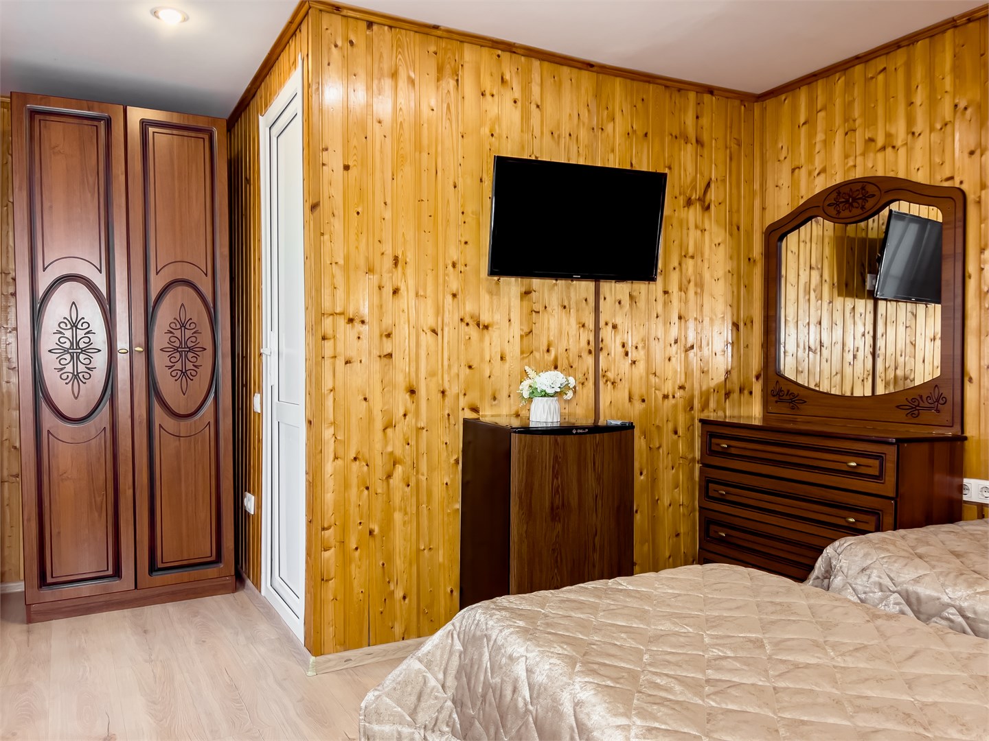 В номере: зеркало, кровать двуспальная, кровать односпальная, прикроватные тумбочки, шкаф, гладильная доска, кондиционер, телевизор, утюг, холодильник, чайный набор посуды, электрочайник