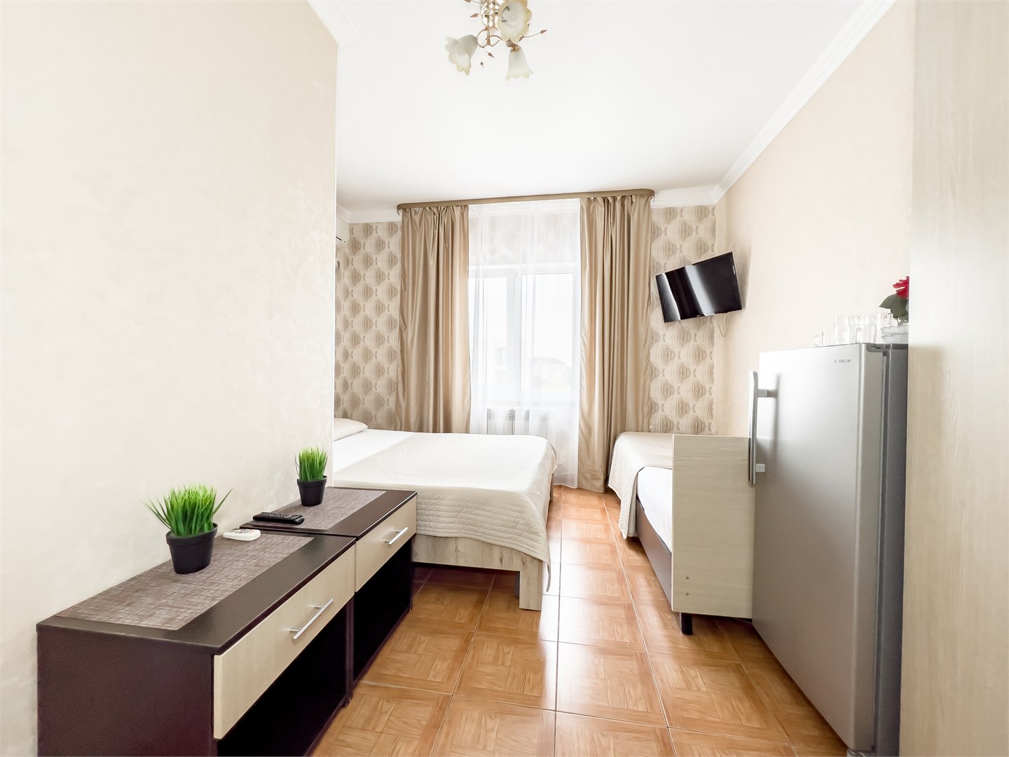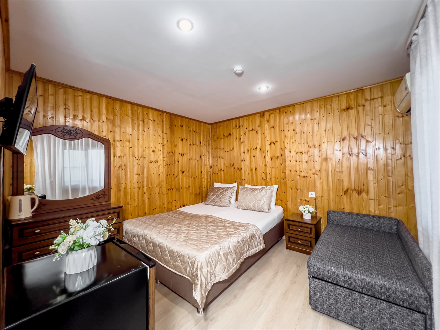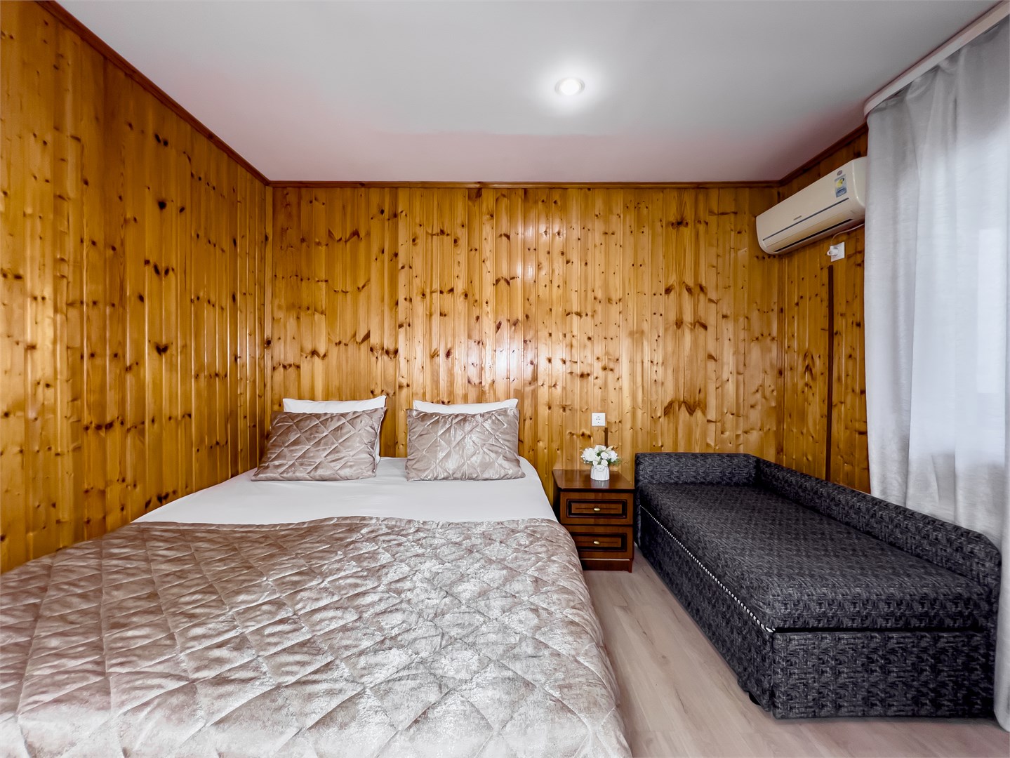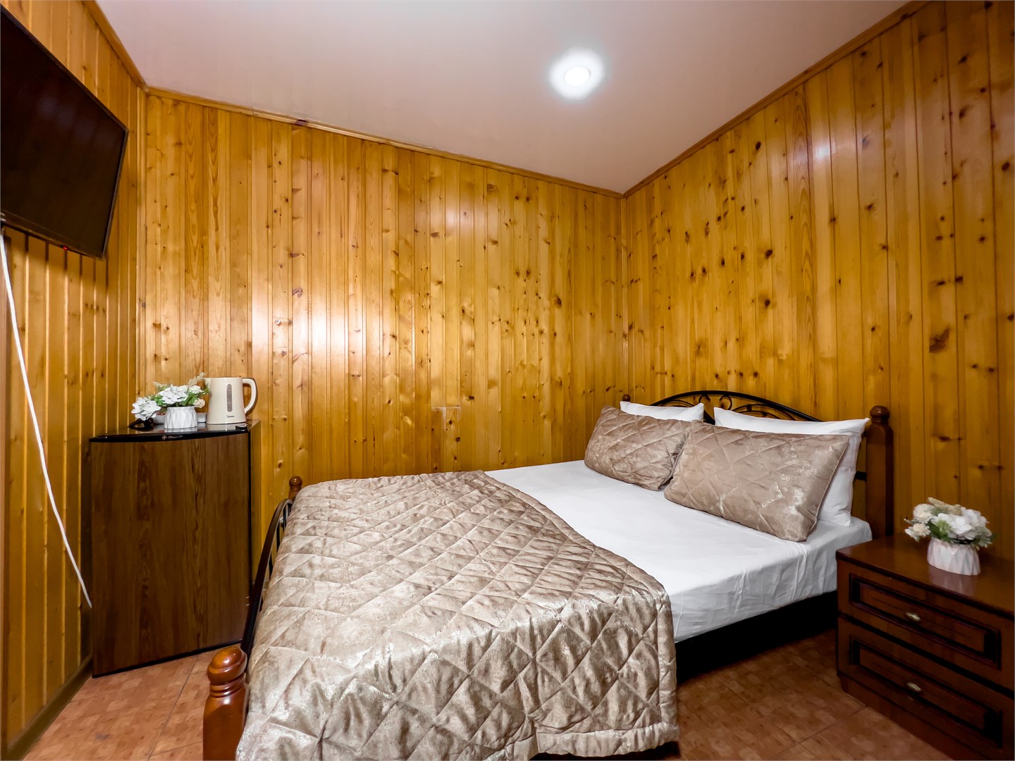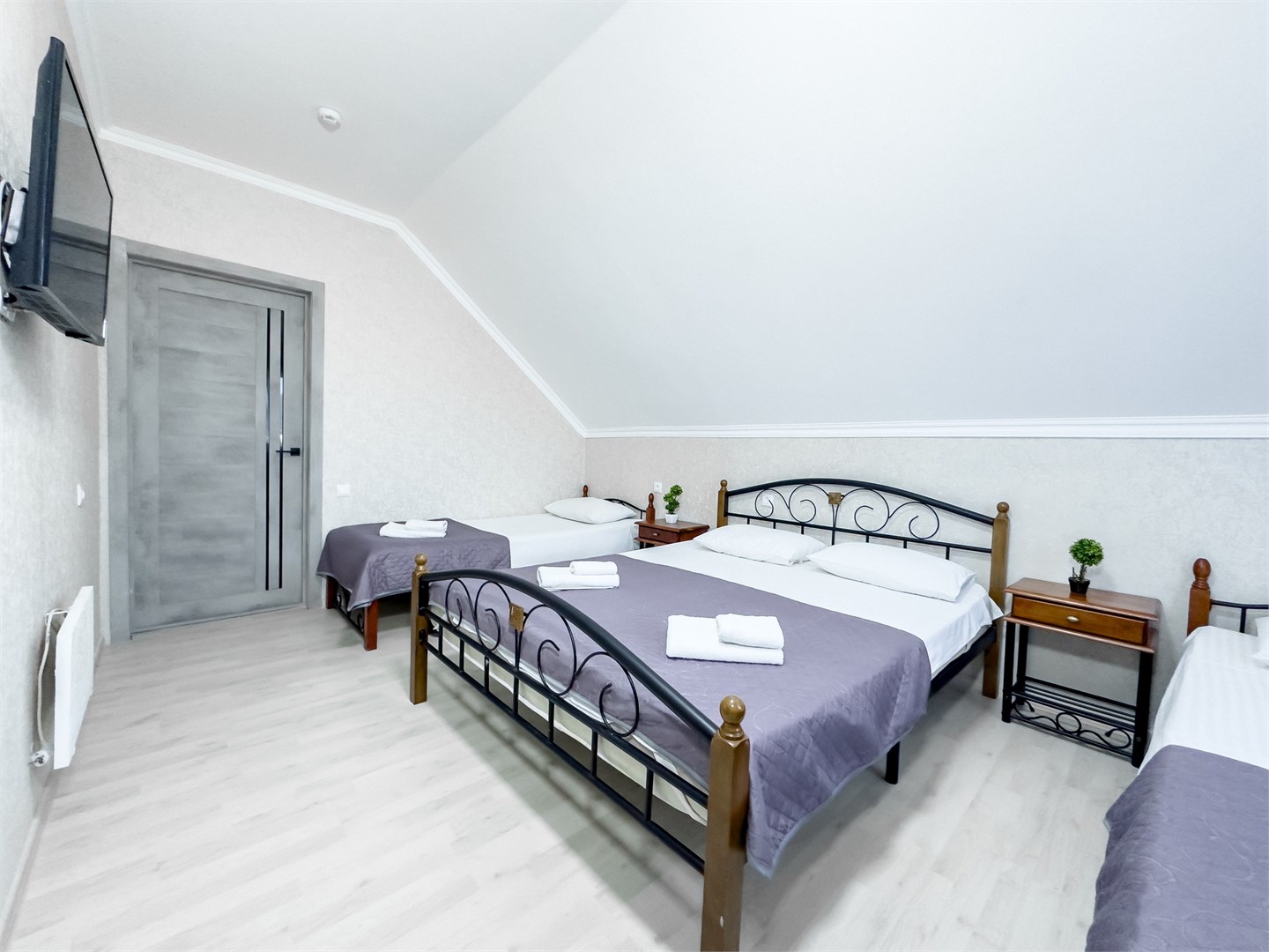 В номере: зеркало, кровать двуспальная, кровать односпальная, прикроватные тумбочки, шкаф, гладильная доска, кондиционер, телевизор, утюг, холодильник, чайный набор посуды, электрочайник