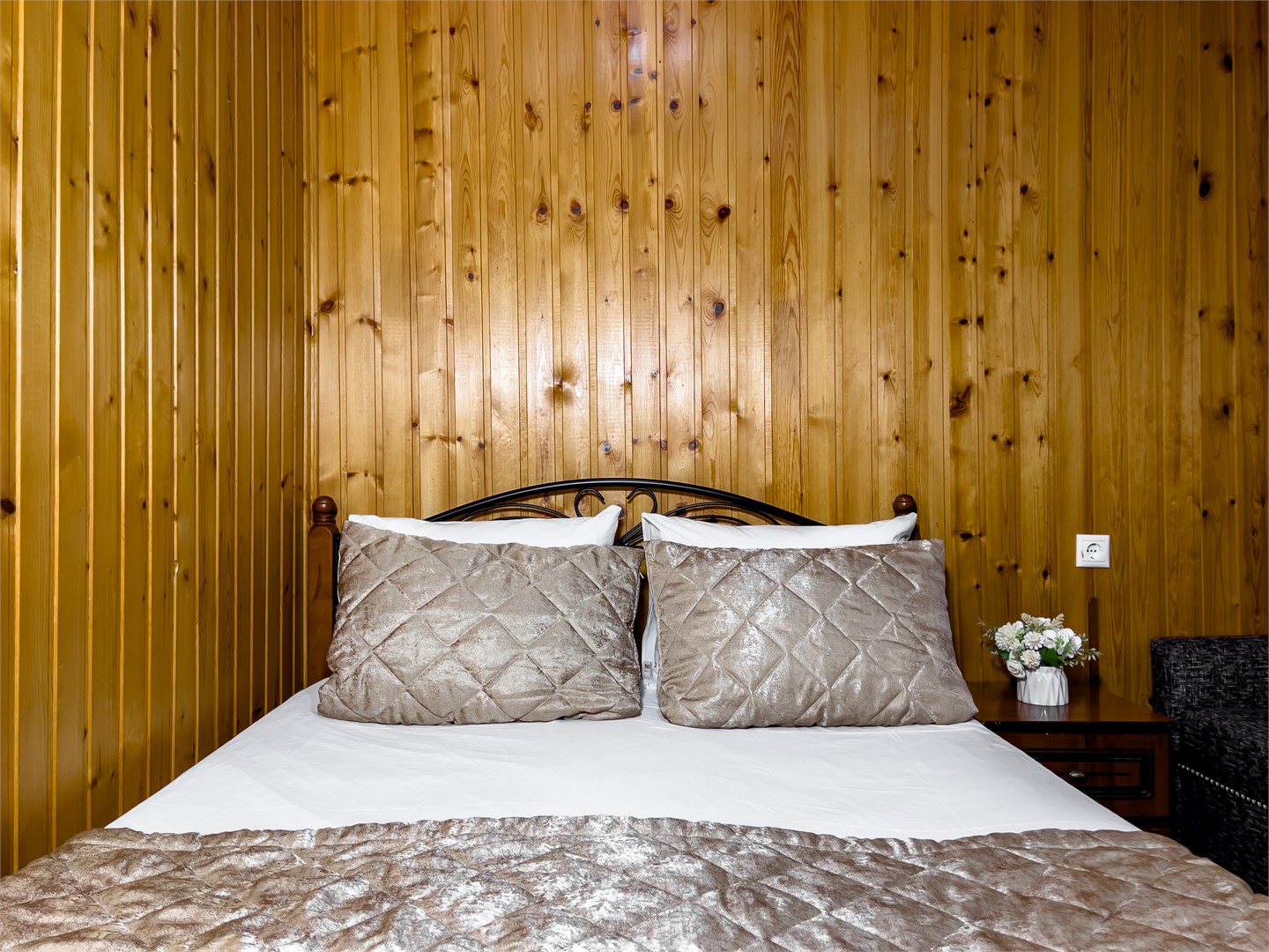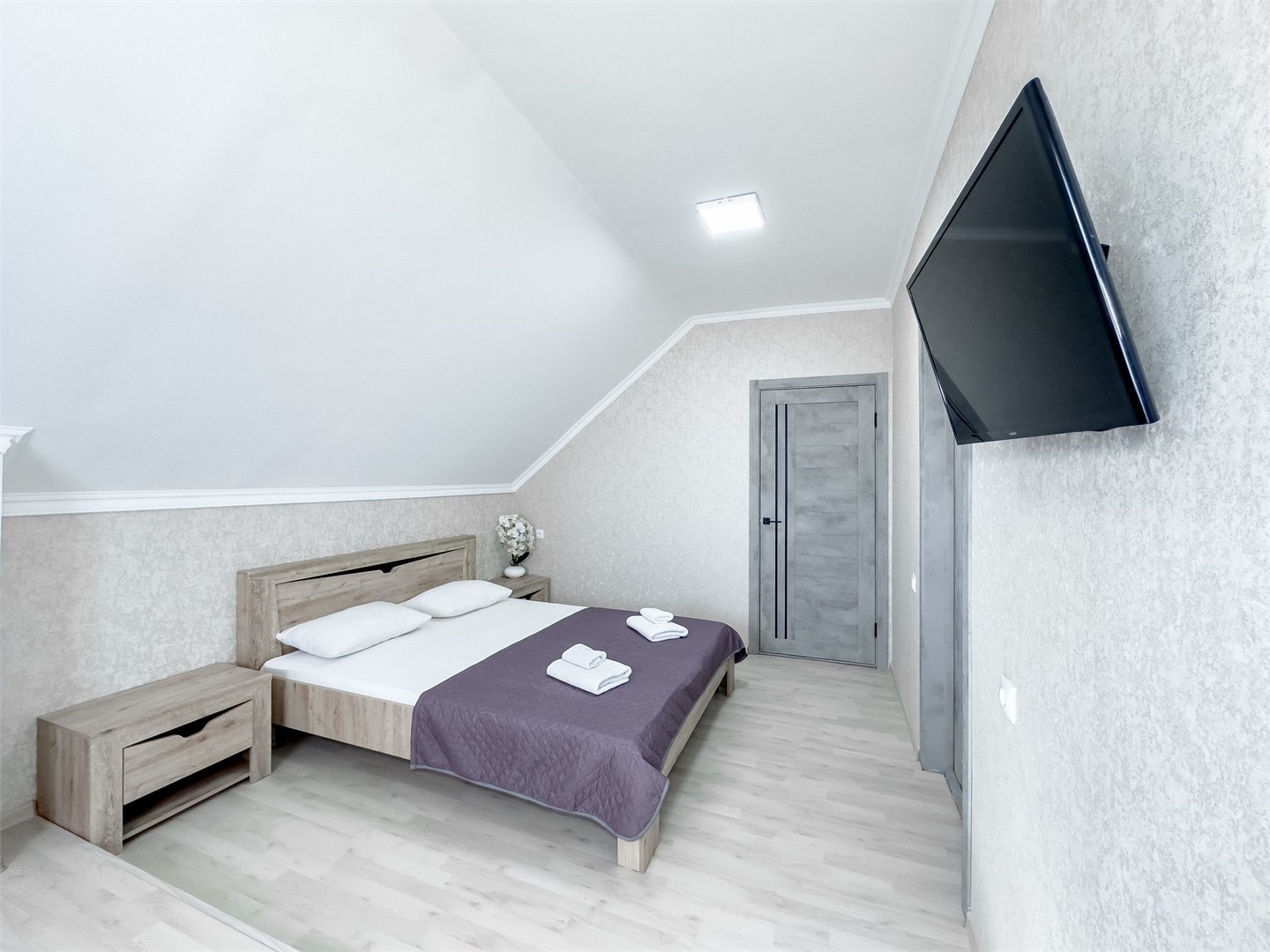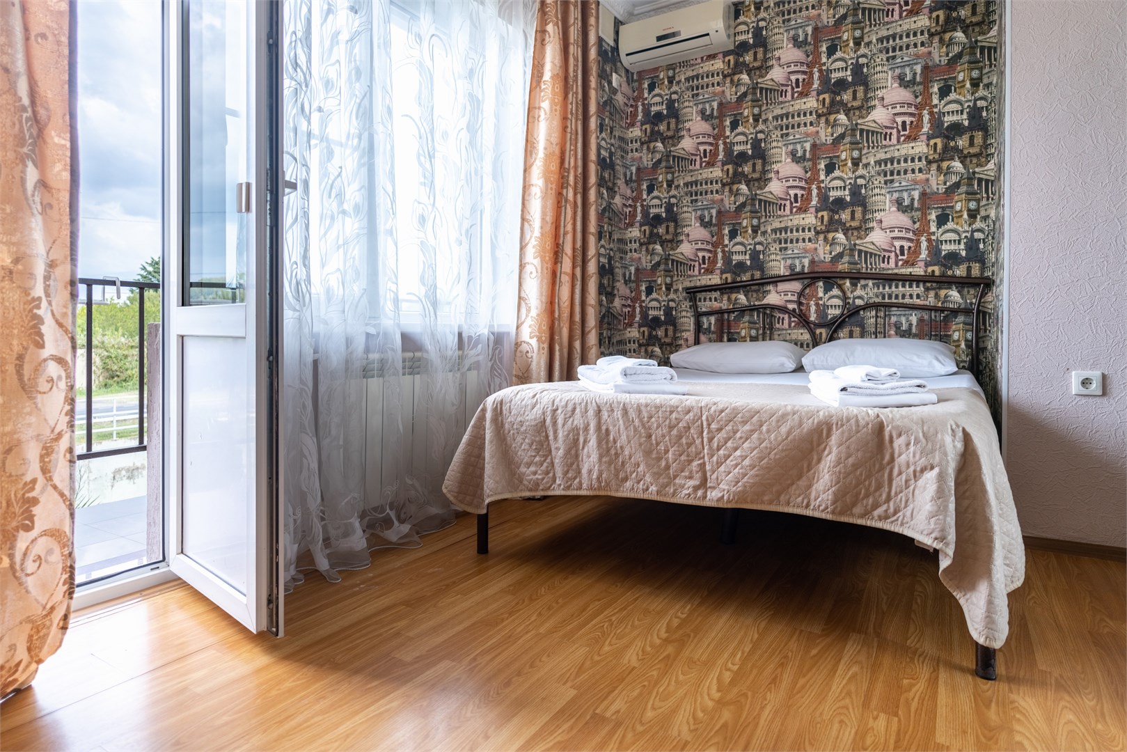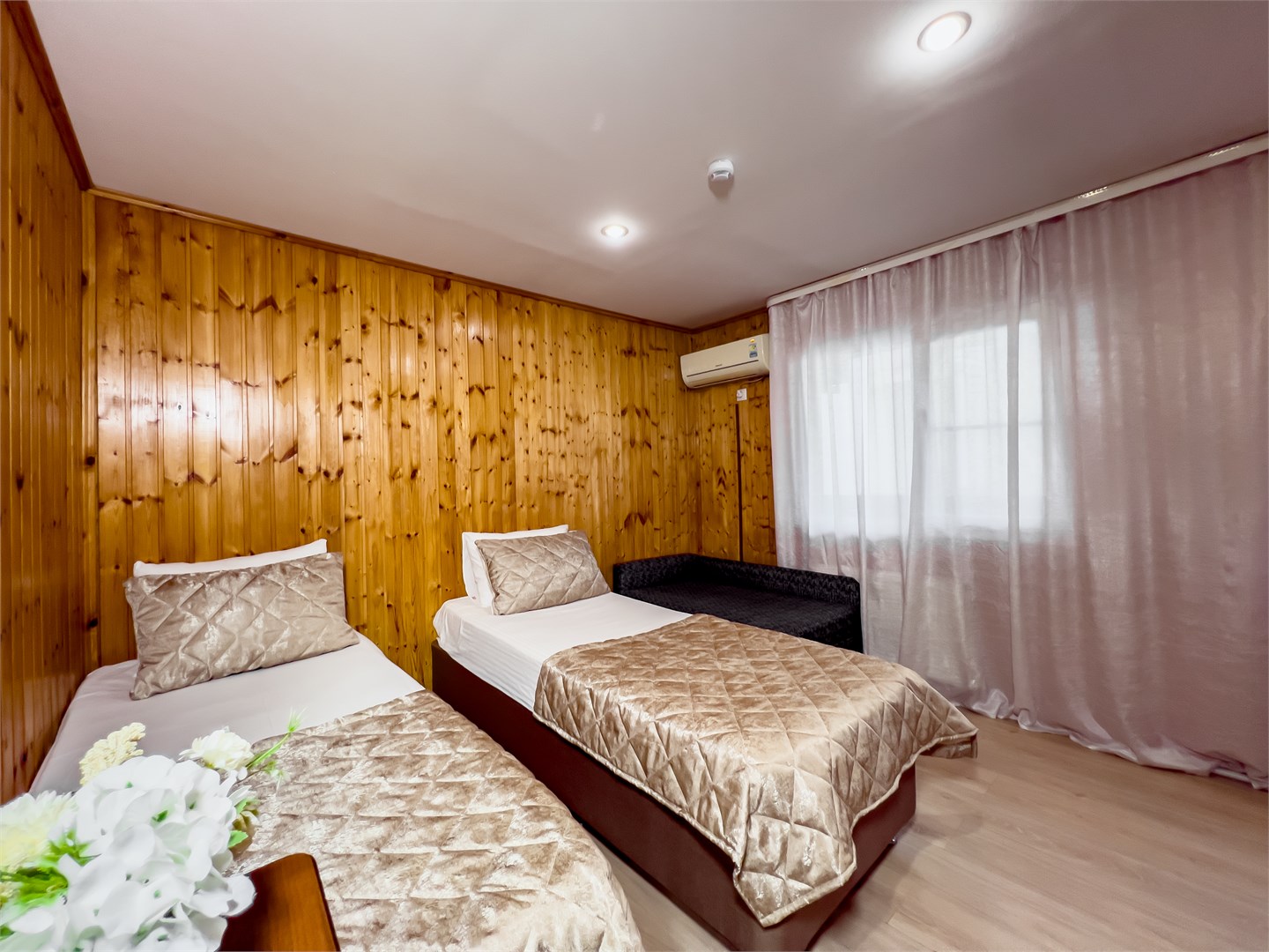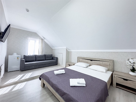 В номере: зеркало, кровать двуспальная, кровать односпальная, прикроватные тумбочки, шкаф, гладильная доска, кондиционер, телевизор, утюг, холодильник, чайный набор посуды, электрочайник
