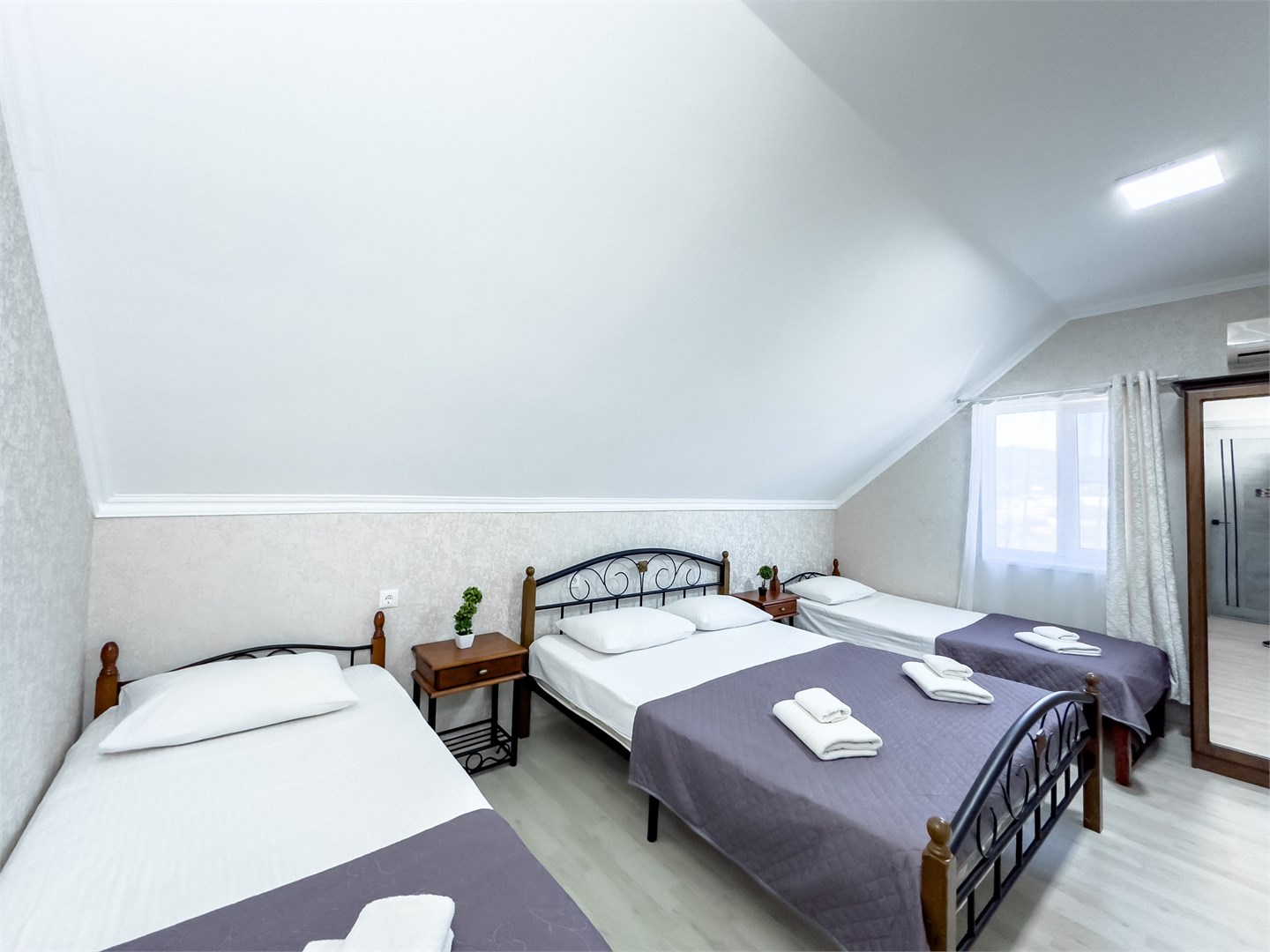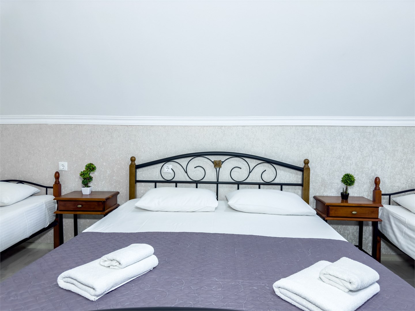 В номере: зеркало, кровати односпальные, кровать двуспальная, прикроватные тумбочки, стол, шкаф, гладильная доска, кондиционер, сушилка для белья, телевизор, утюг, холодильник, чайный набор посуды, электрочайник