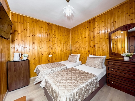 В номере: зеркало, комод, кровати односпальные /одна двуспальная кровать, прикроватная тумбочка, шкаф, гладильная доска, кондиционер, телевизор, утюг, холодильник, чайный набор посуды, электрочайник
