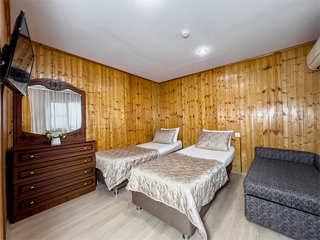 В номере: зеркало, комод, кресло-кровать, кровати односпальные /одна двуспальная кровать, прикроватная тумбочка, шкаф, гладильная доска, кондиционер, телевизор, утюг, холодильник, чайный набор посуды, электрочайник