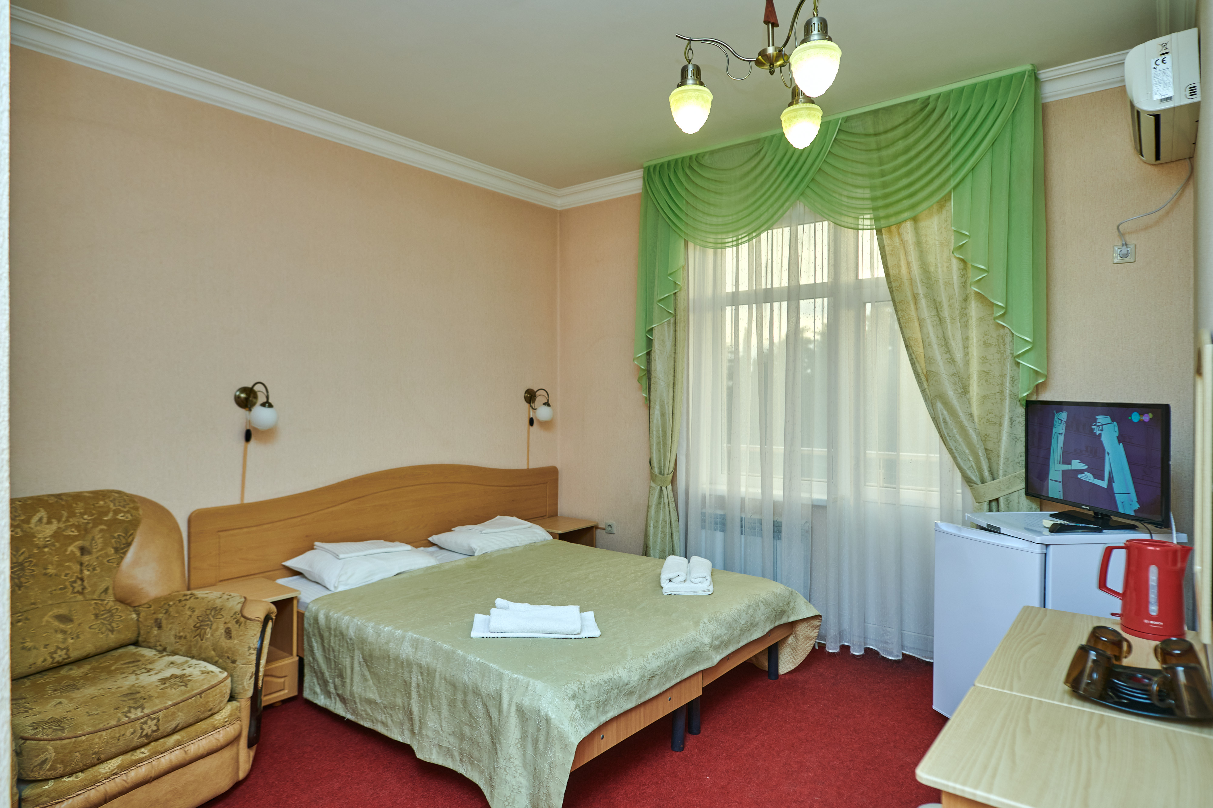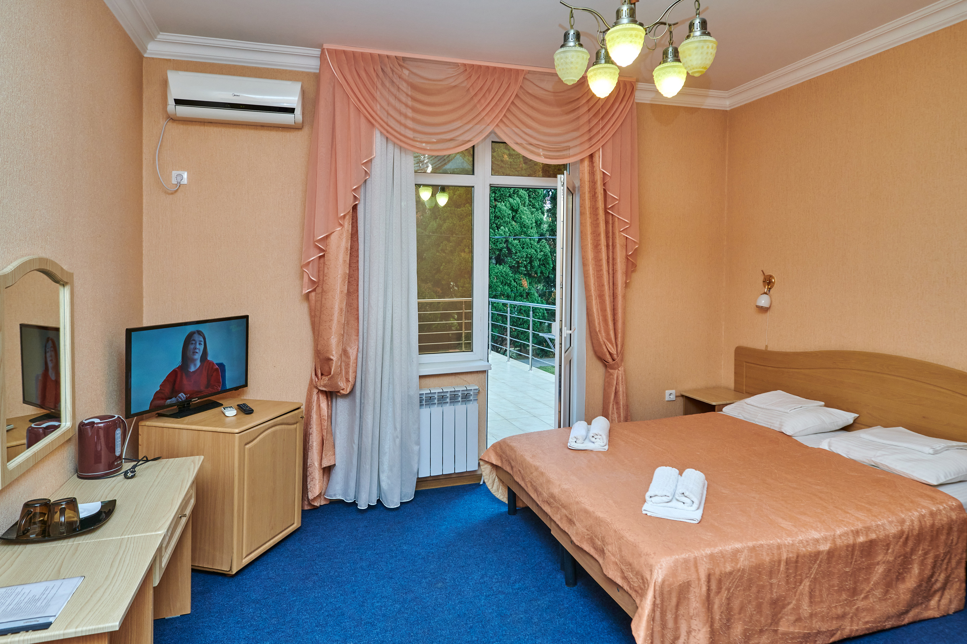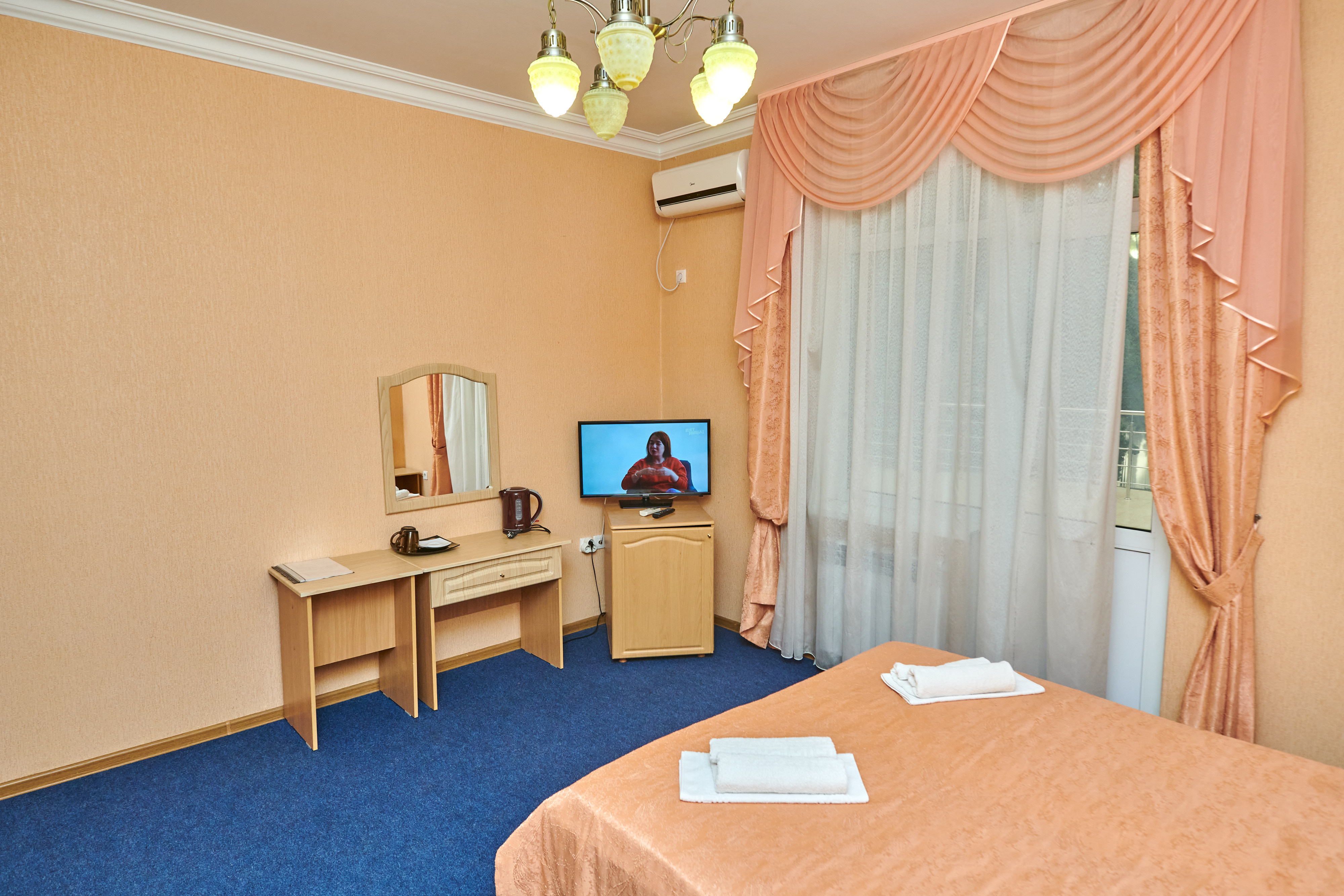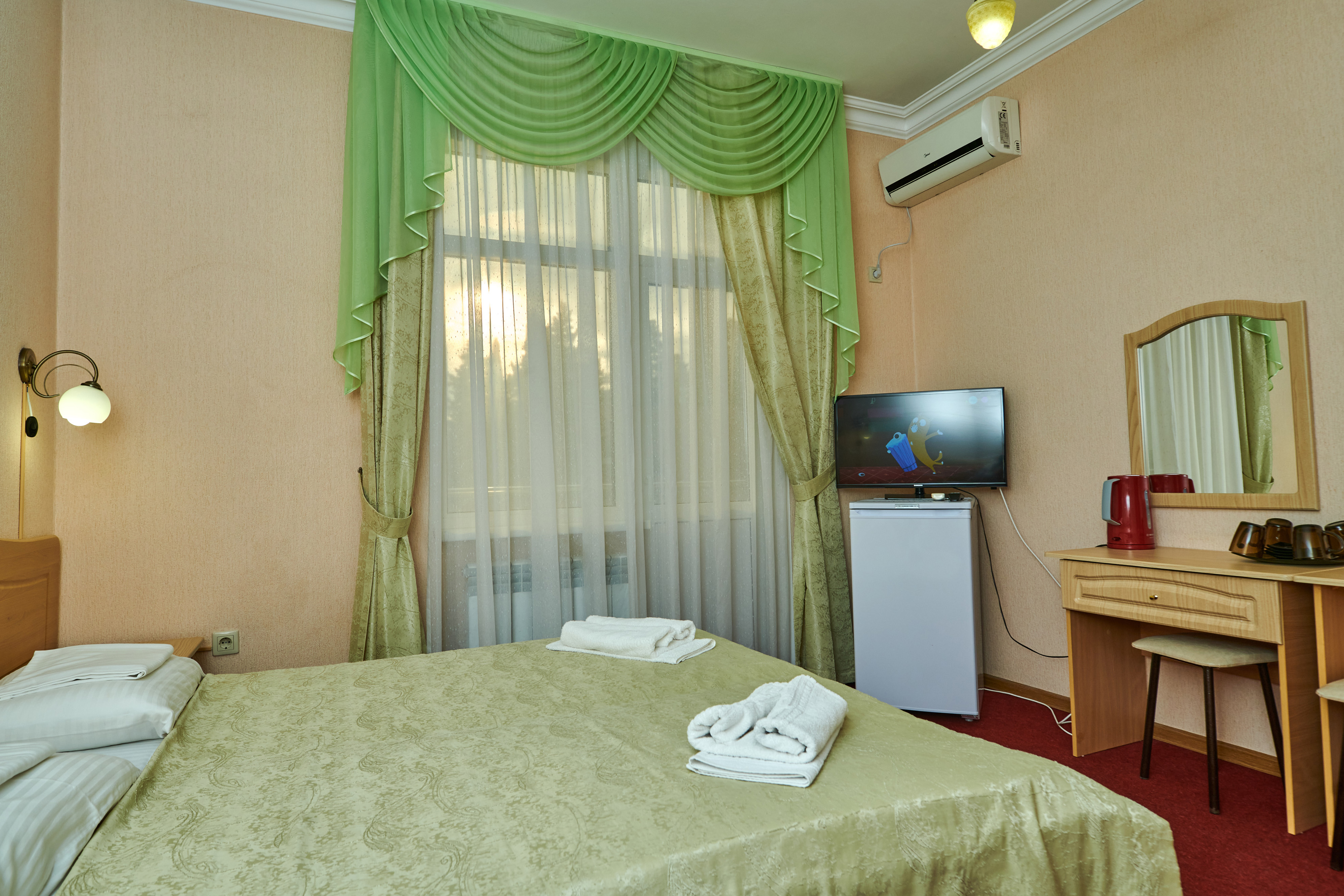В номере: вешалка, зеркало, кровать двуспальная, прикроватные тумбочки, шкаф, сплит-система, телевизор, холодильник, чайный набор посуды, электрочайник