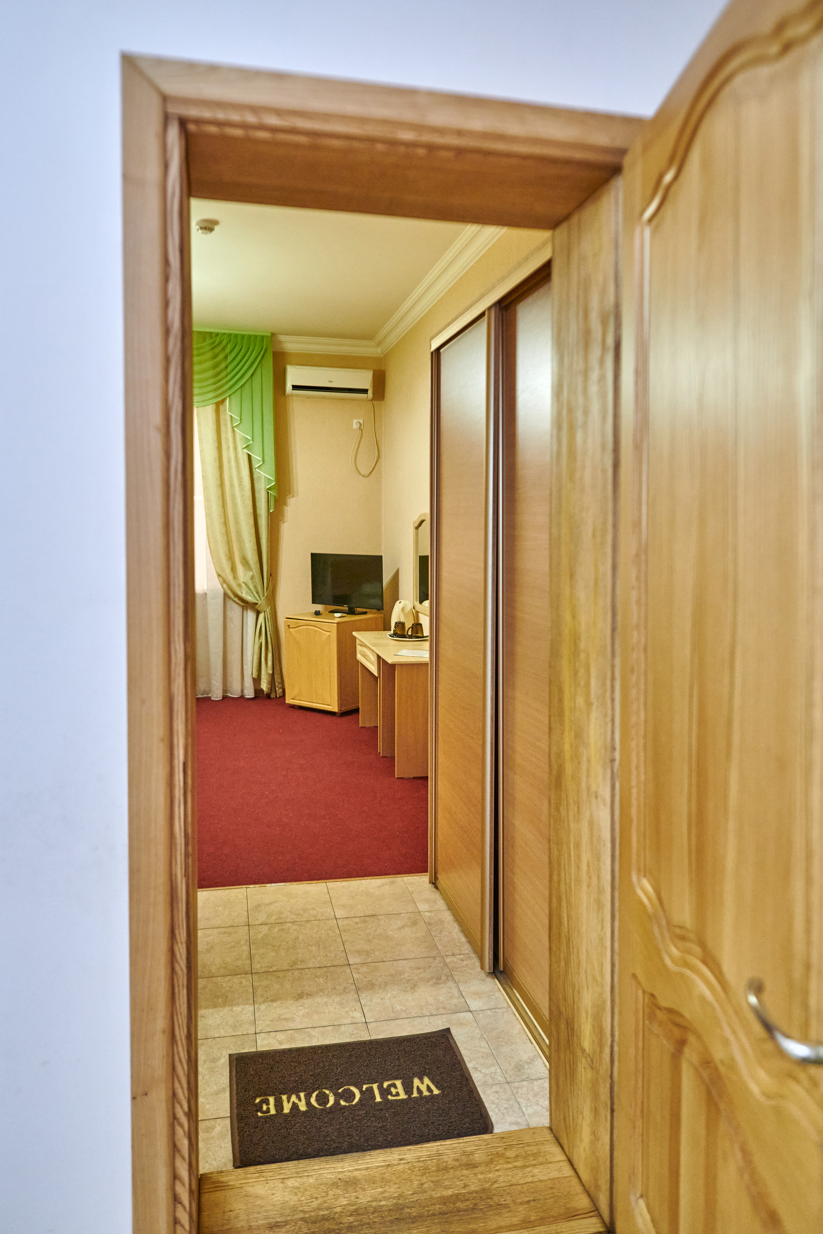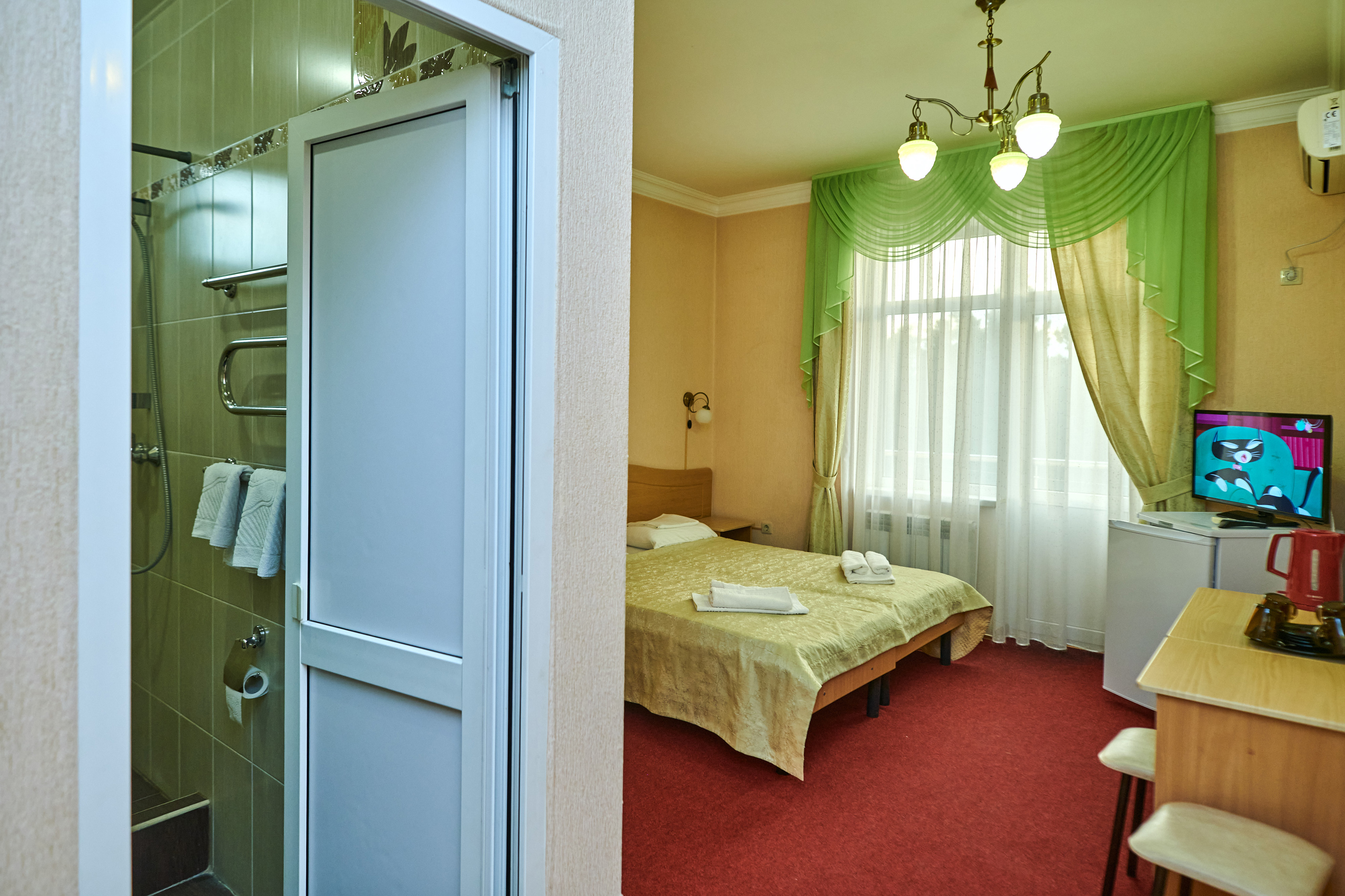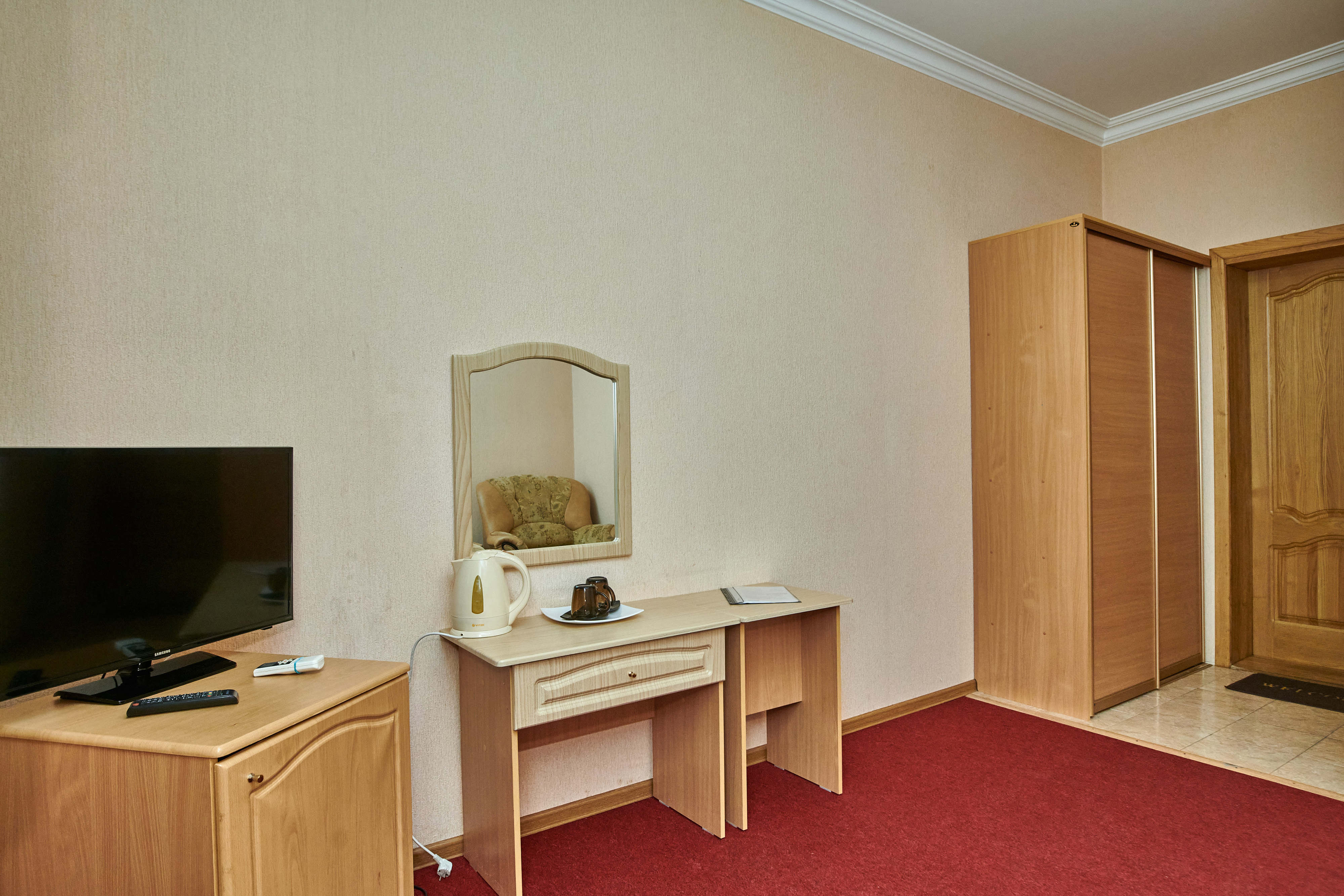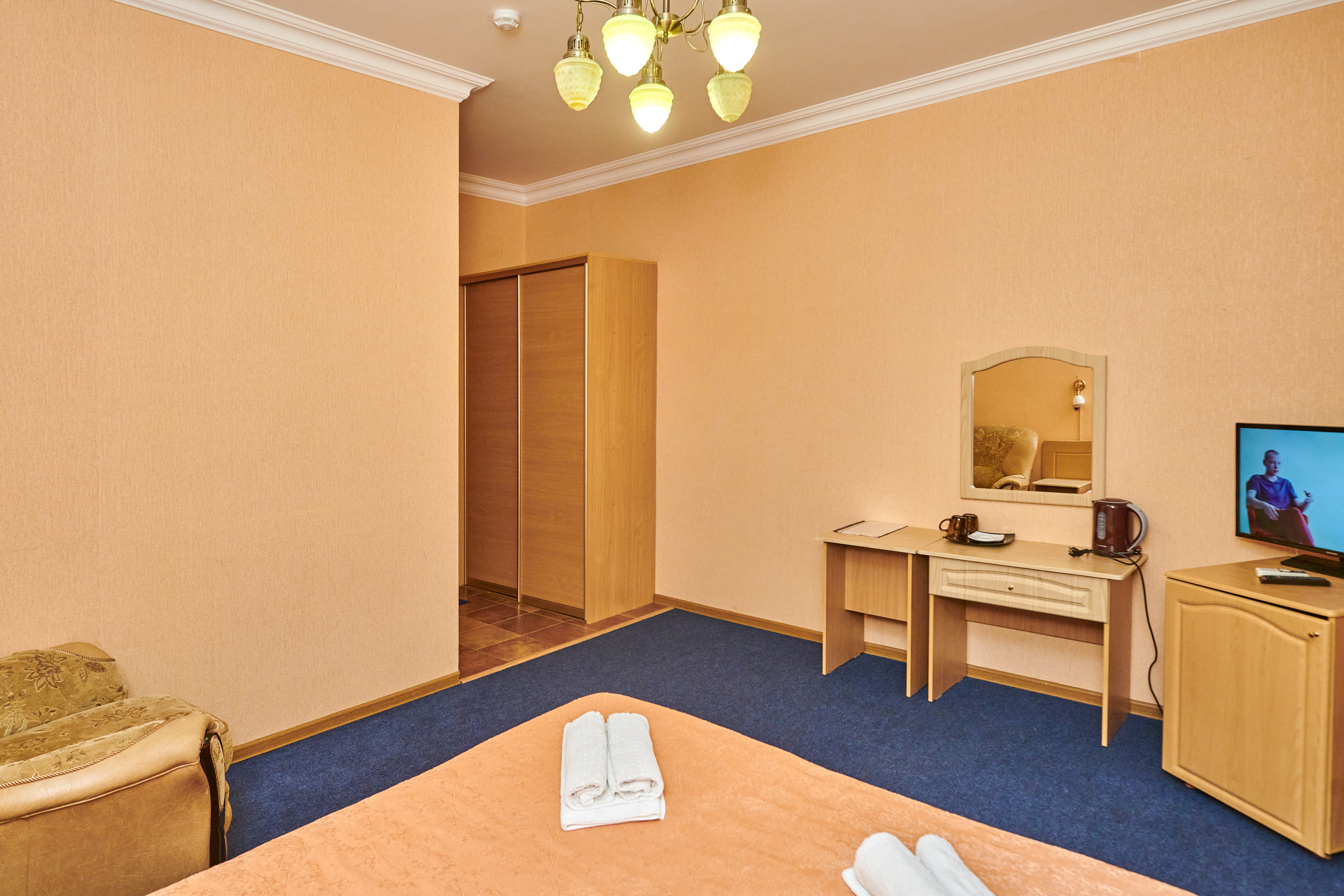 В номере: вешалка, зеркало, кровать двуспальная, прикроватные тумбочки, шкаф, сплит-система, телевизор, холодильник, чайный набор посуды, электрочайник