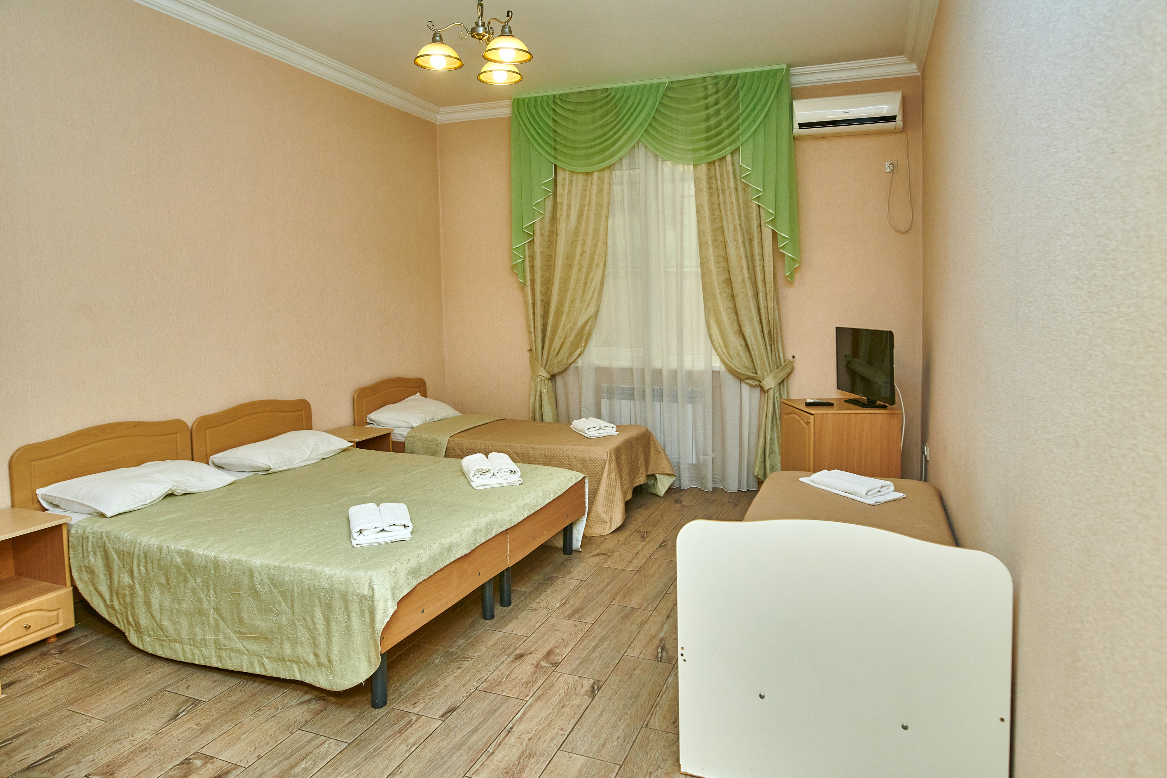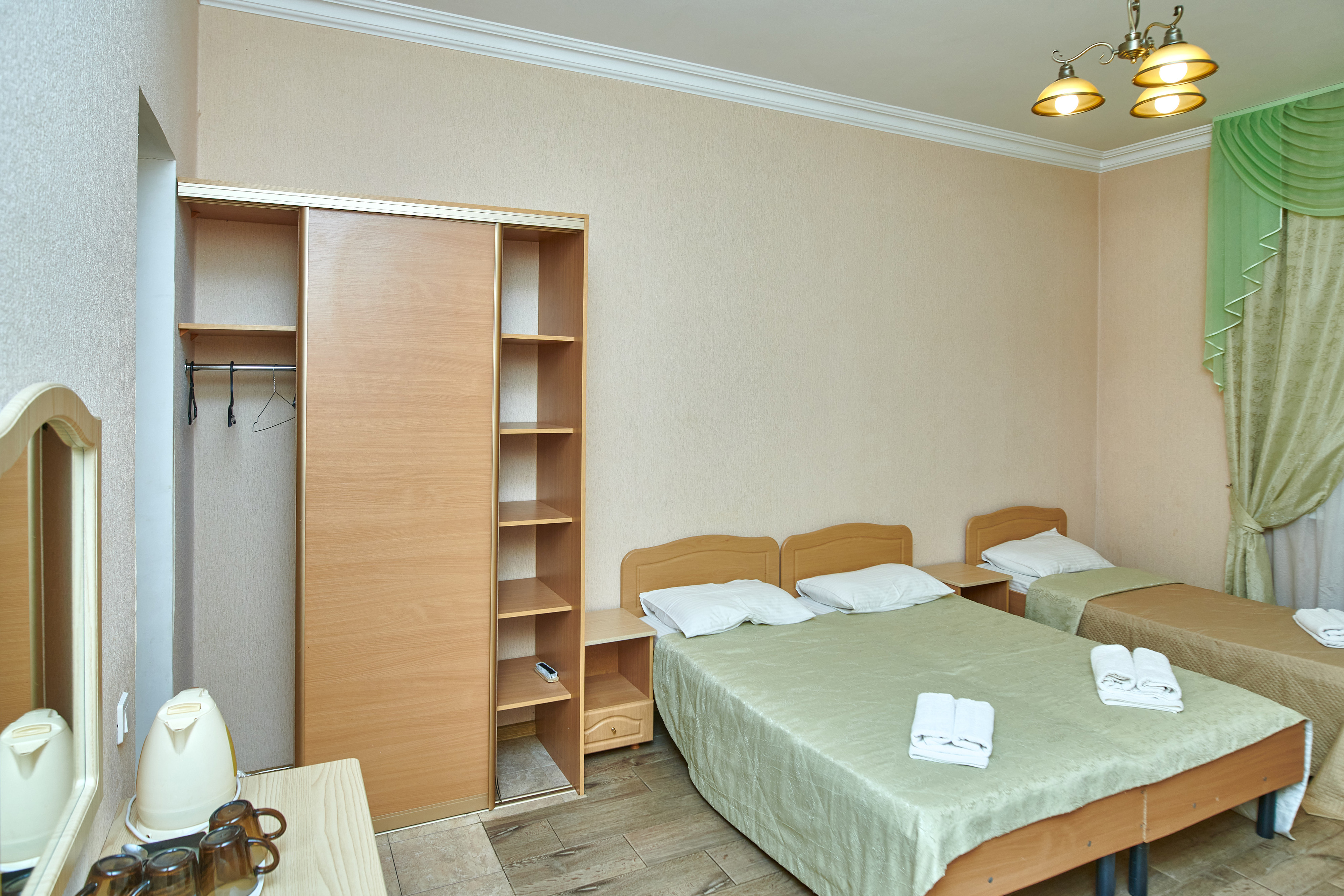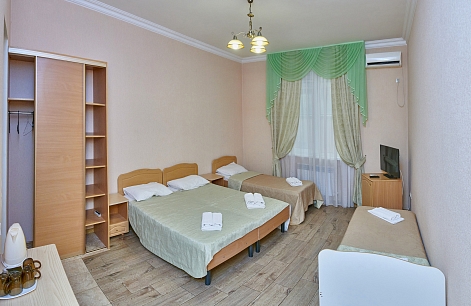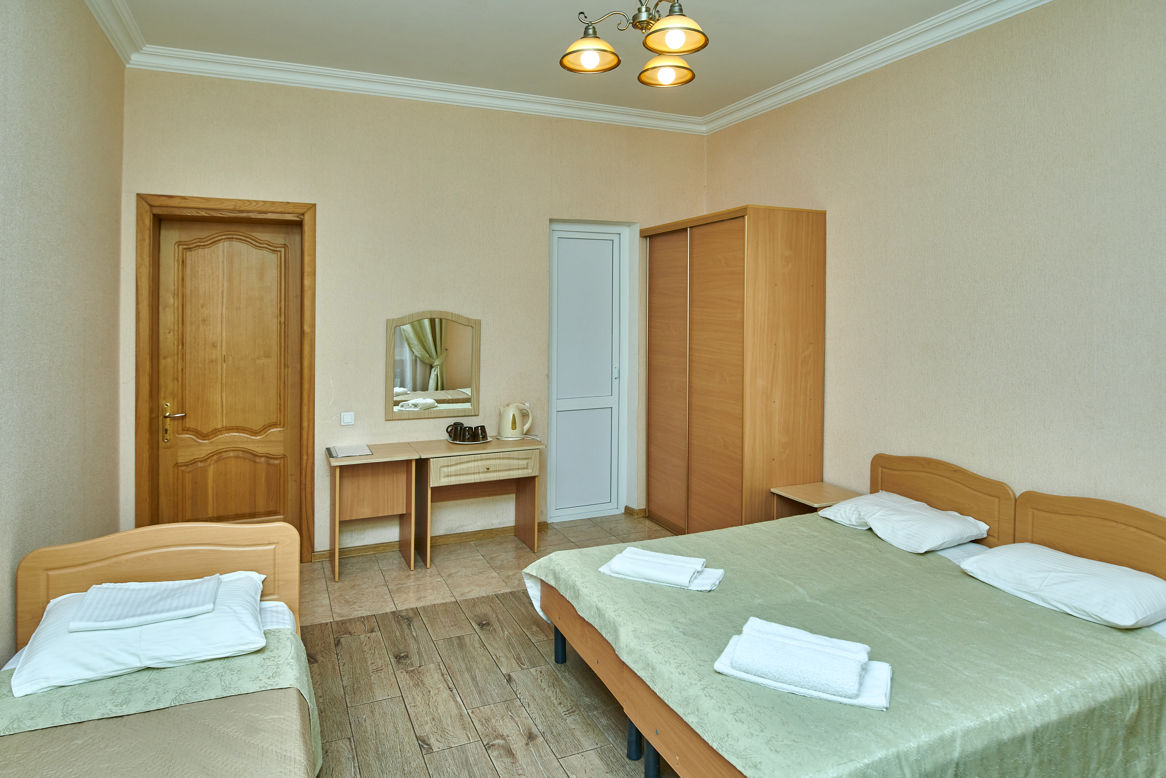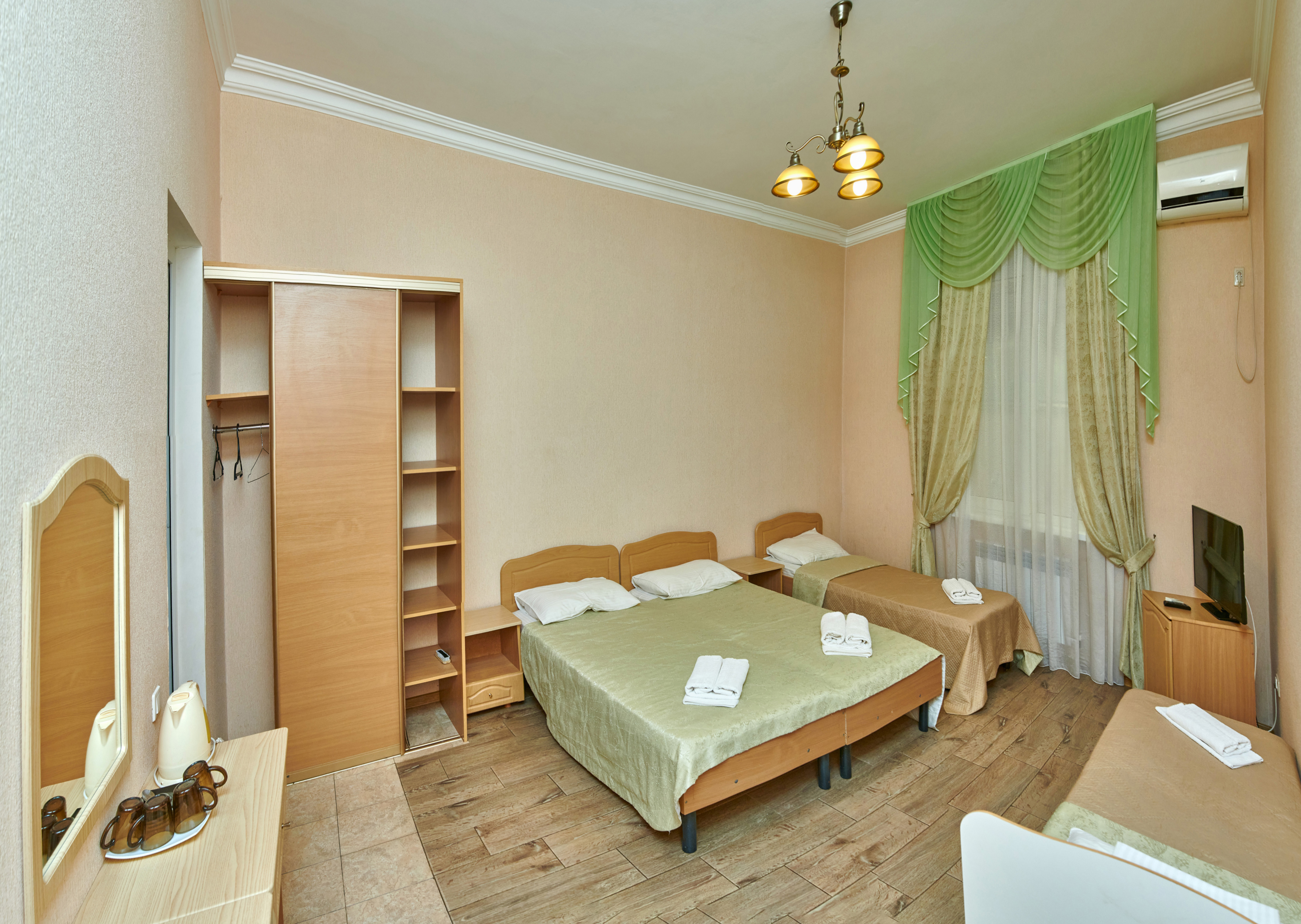 В номере: вешалка, зеркало, кровати односпальные, кровать двуспальная, прикроватные тумбочки, шкаф, сплит-система, телевизор, холодильник, чайный набор посуды, электрочайник