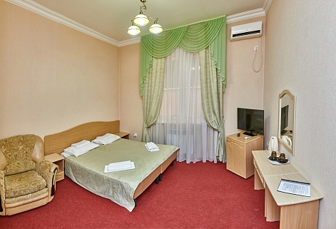 В номере: вешалка, зеркало, кровати односпальные /одна двуспальная кровать, прикроватные тумбочки, шкаф, сплит-система, телевизор, холодильник, чайный набор посуды, электрочайник