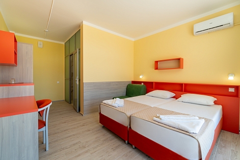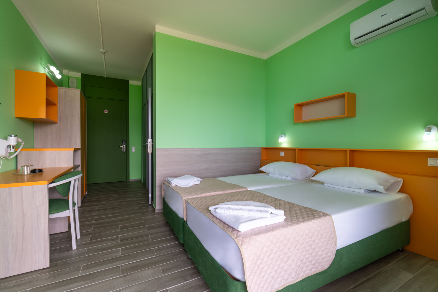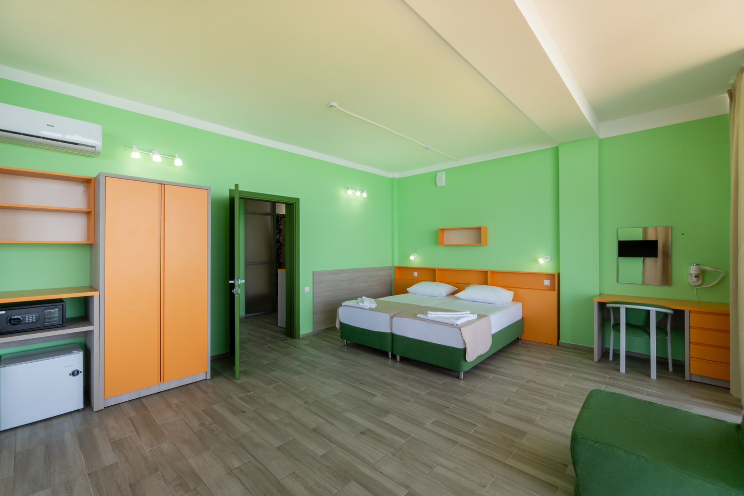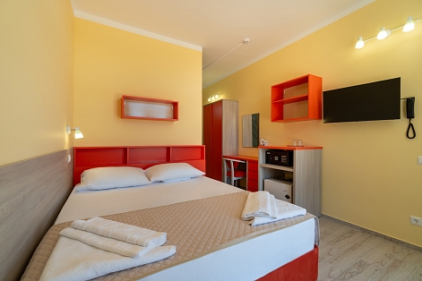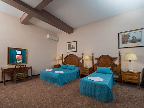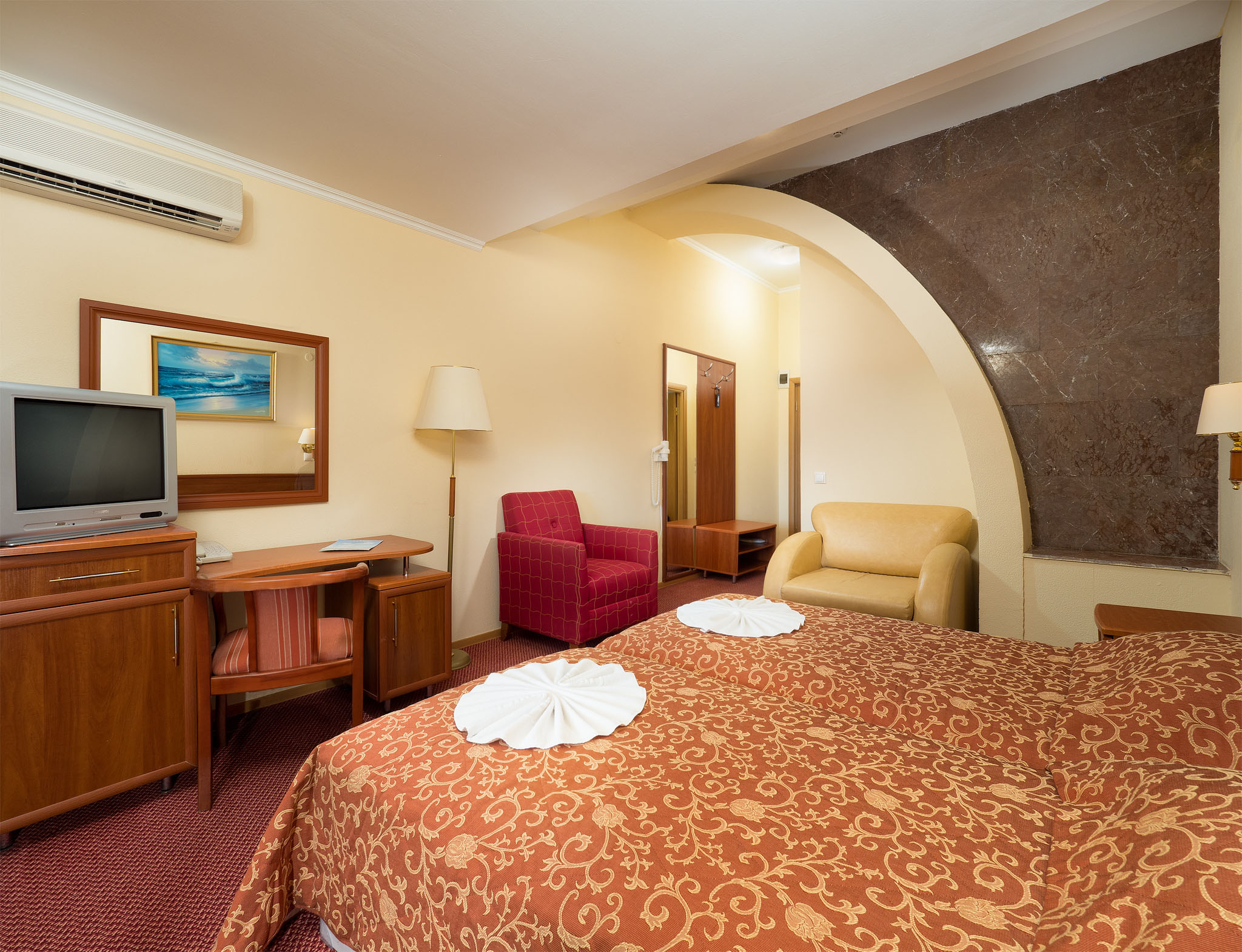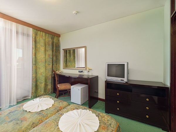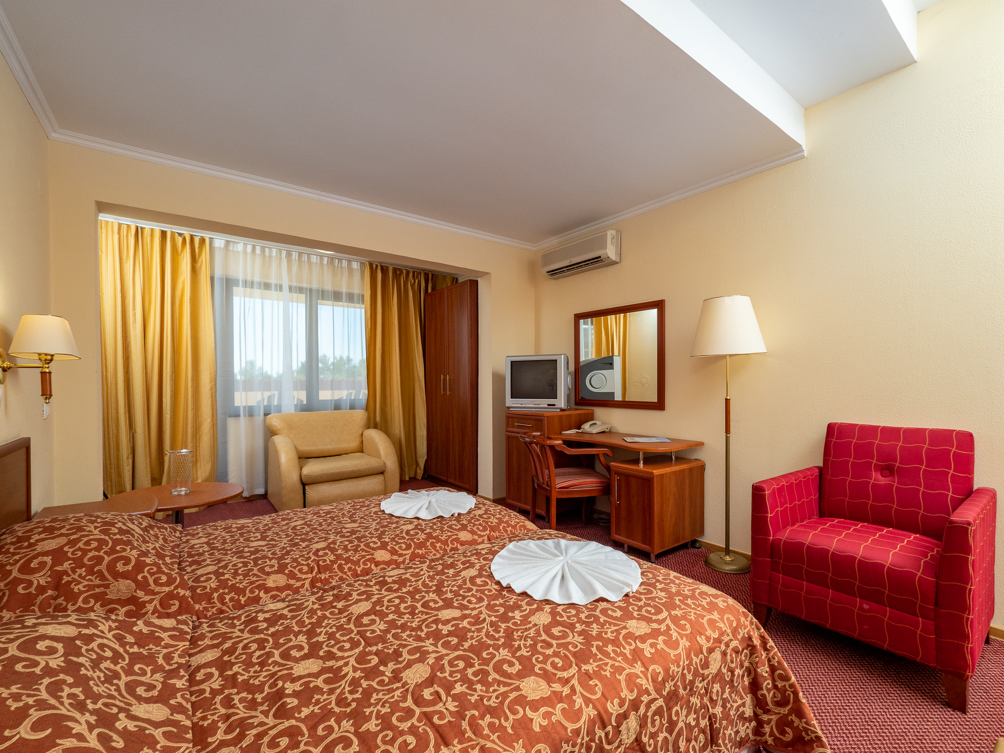 В номере: зеркало, кровати односпальные, столик туалетный, шкаф, кондиционер, сейф, телевизор, телефон, холодильник