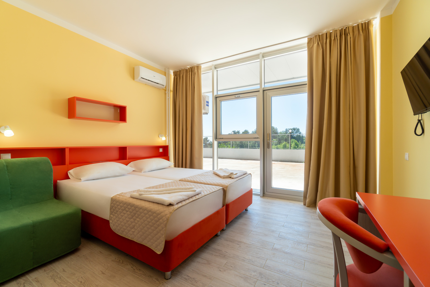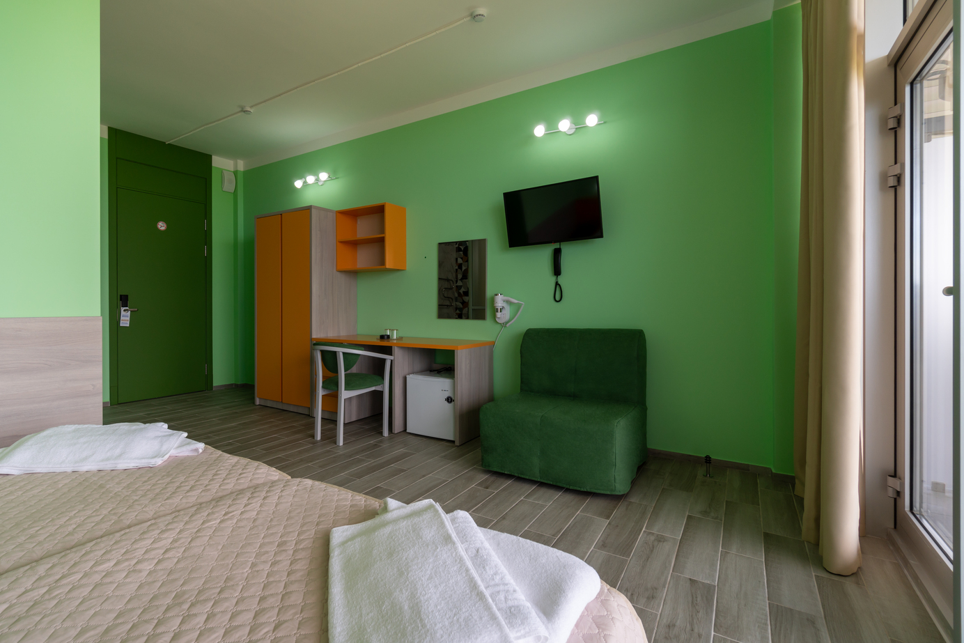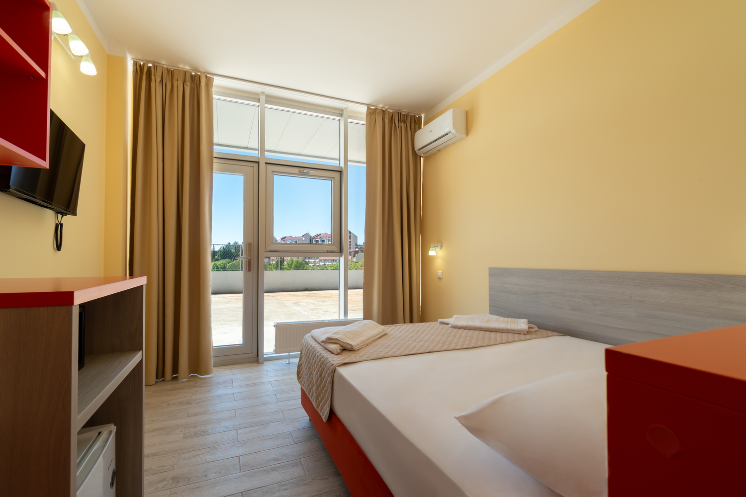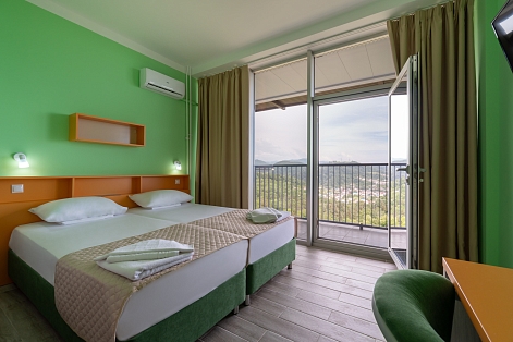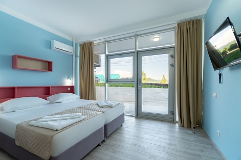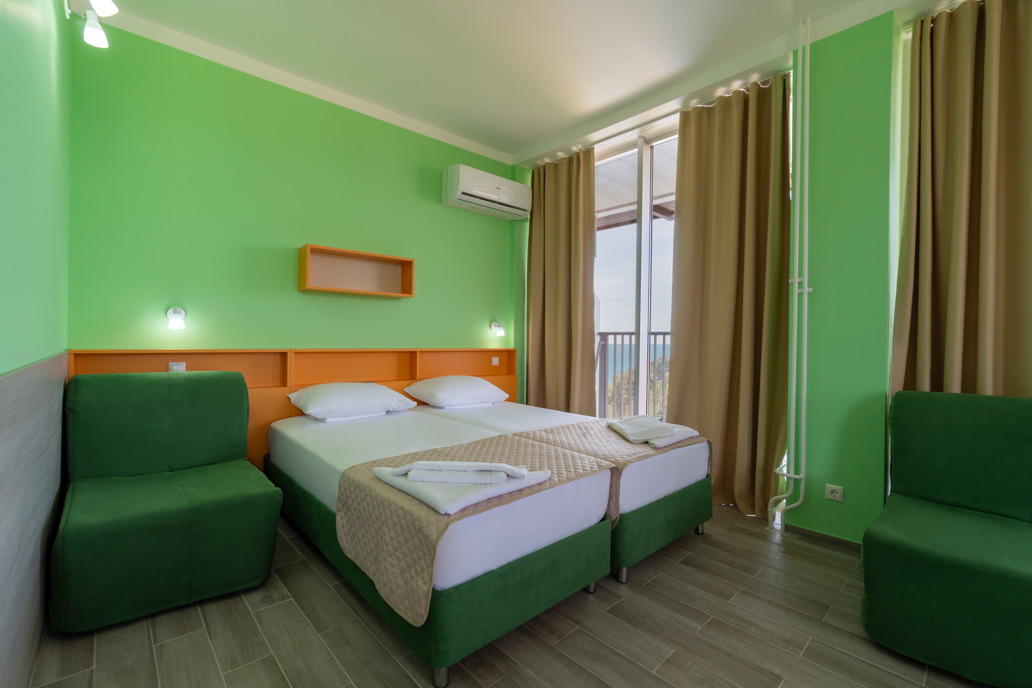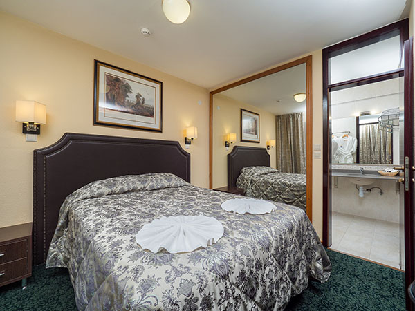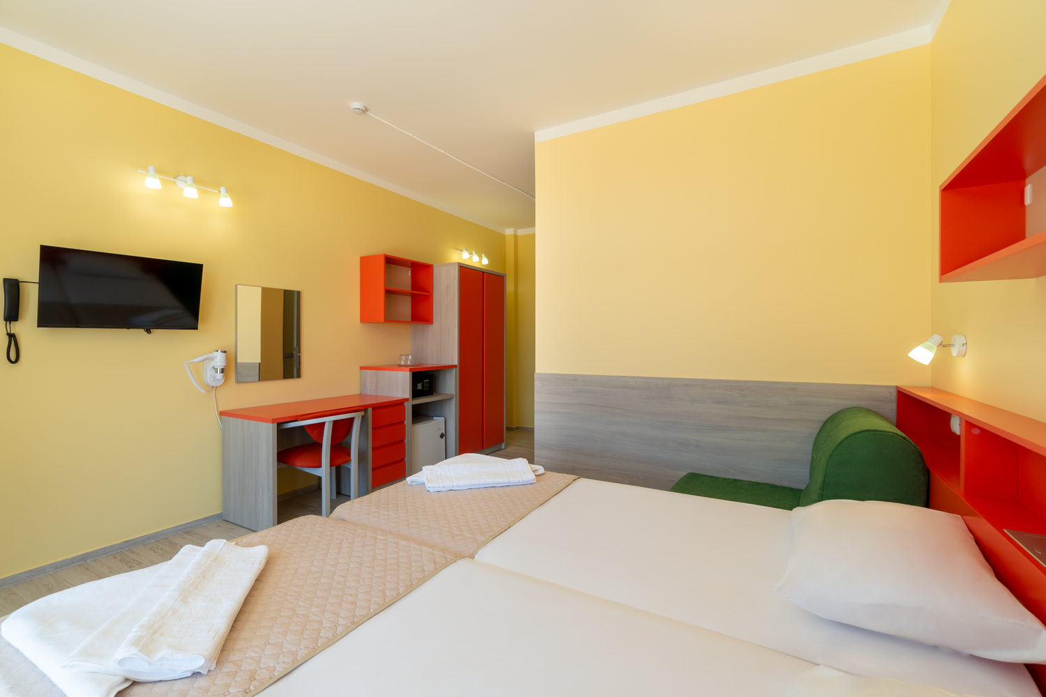 В номере: зеркало, кровати односпальные, столик туалетный, шкаф, кондиционер, сейф, телевизор, телефон, холодильник