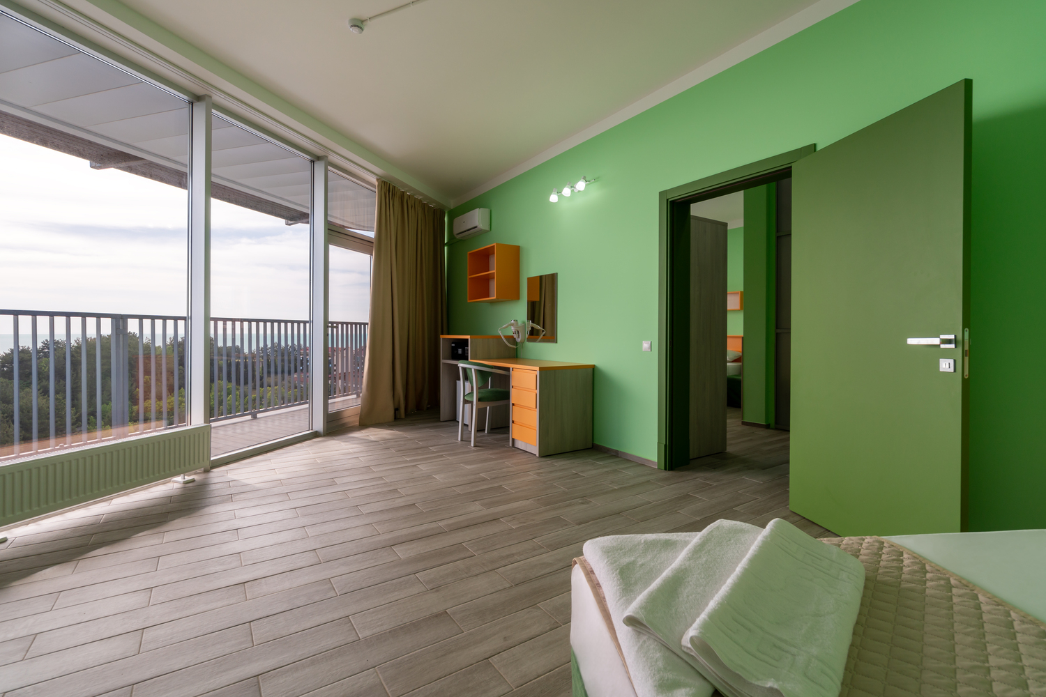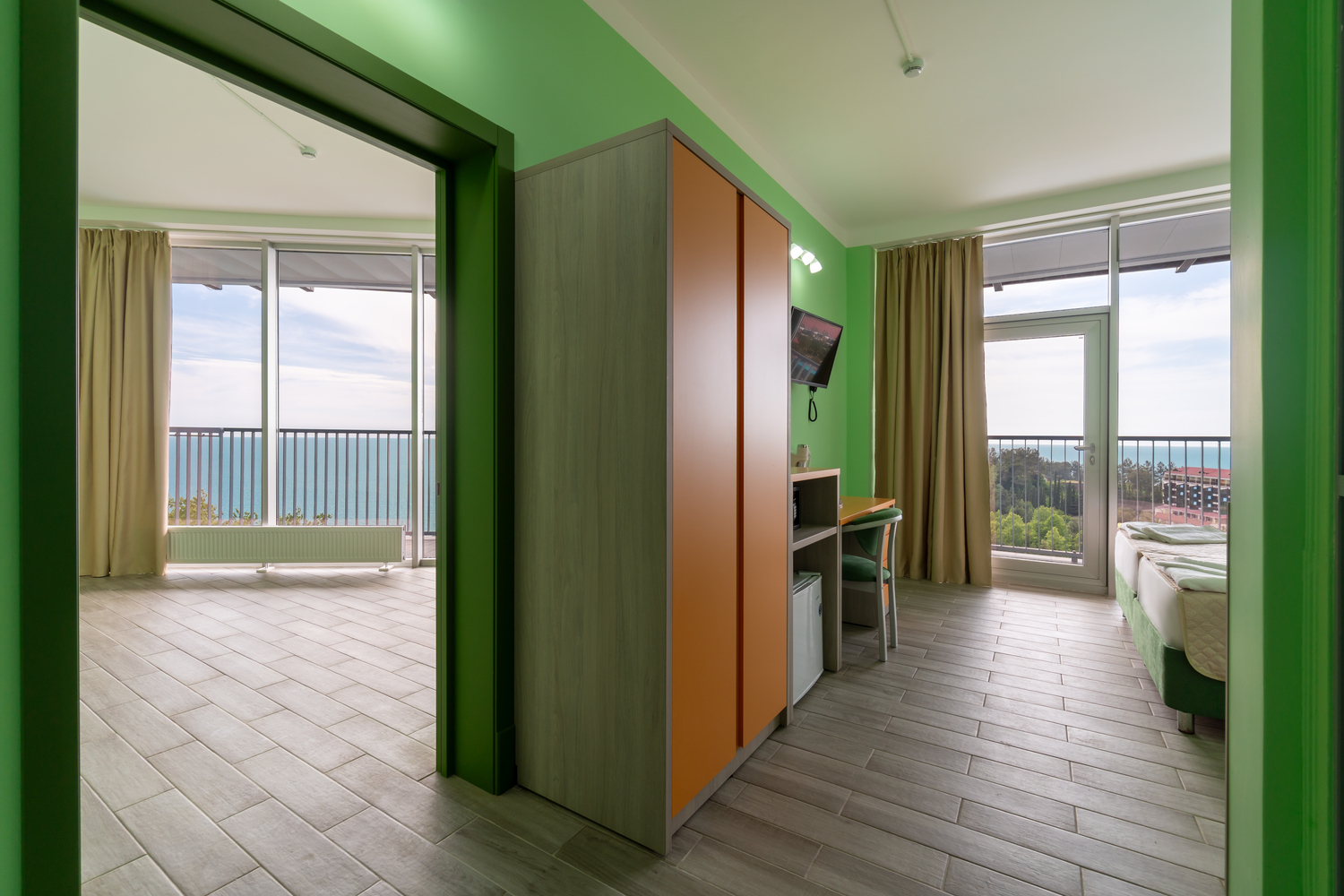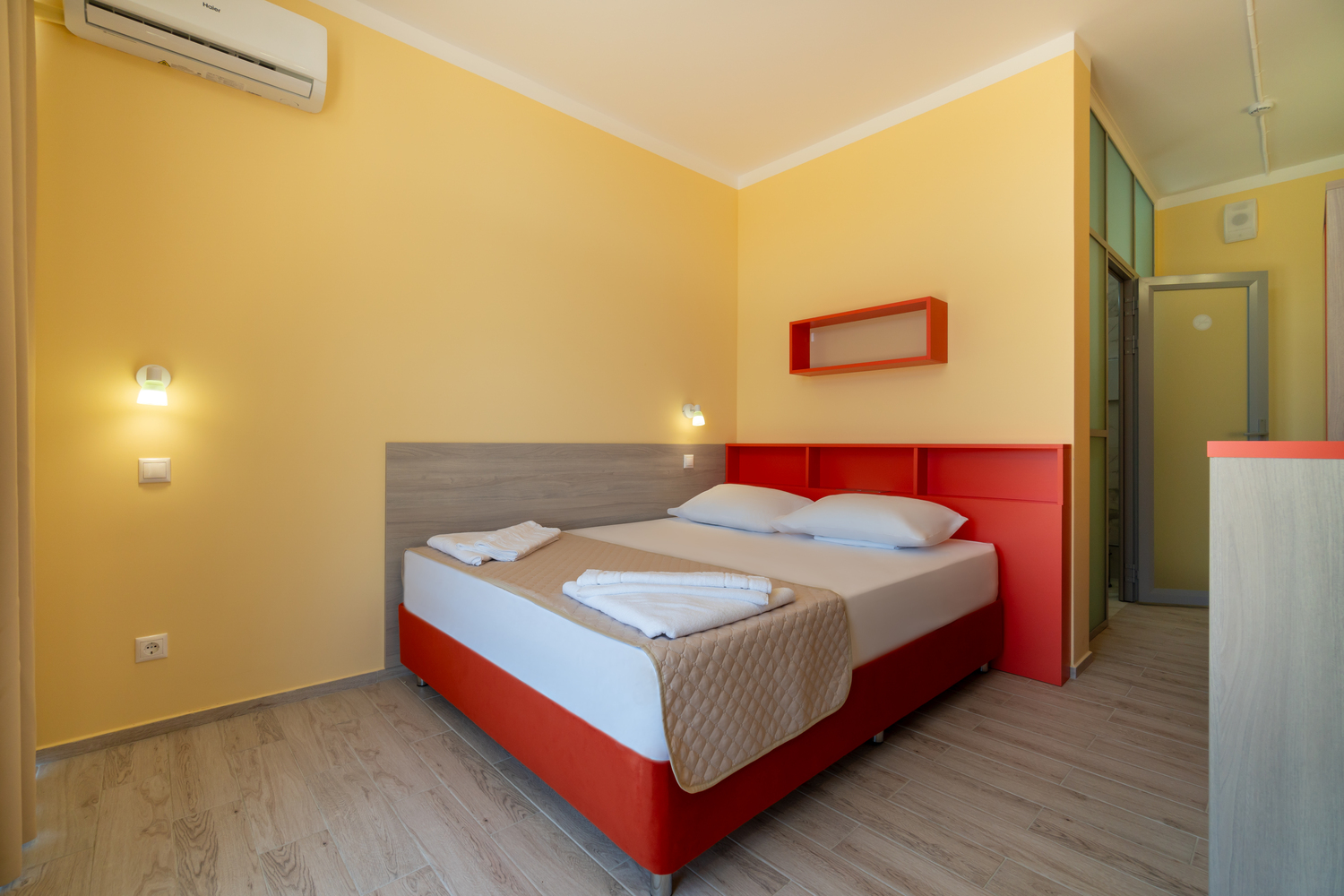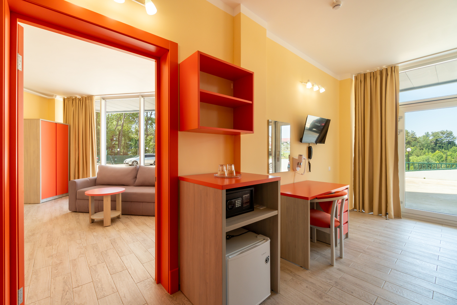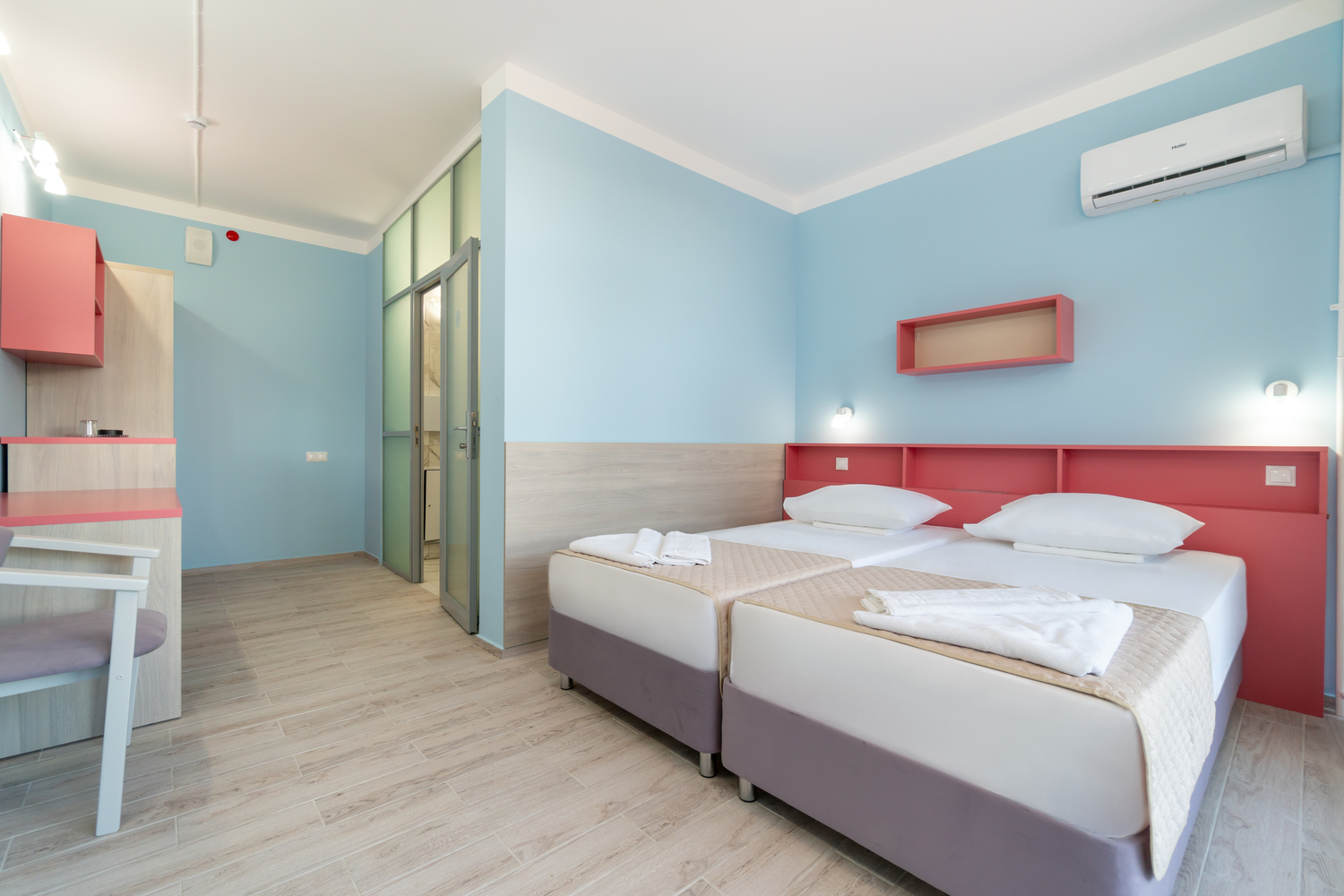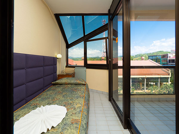 В номере: зеркало, кровати односпальные, столик туалетный, шкаф, кондиционер, сейф, телевизор, телефон, холодильник