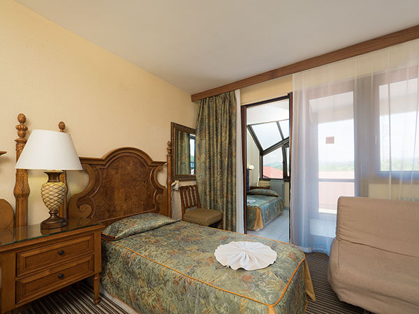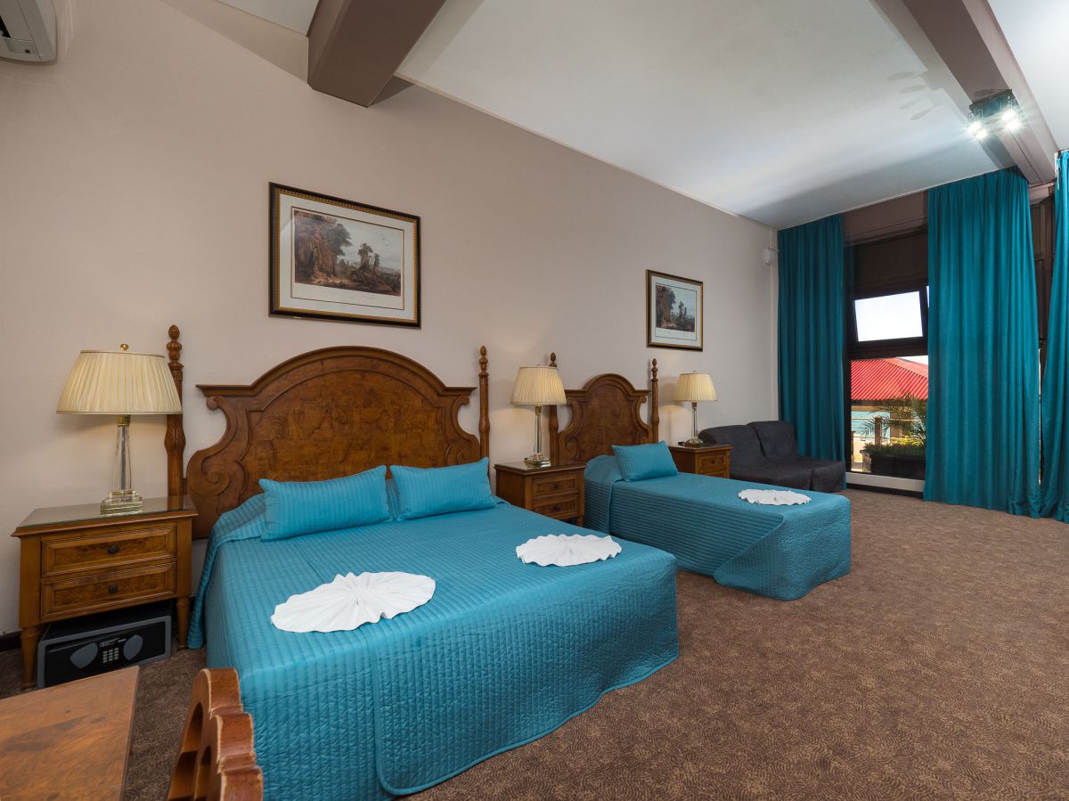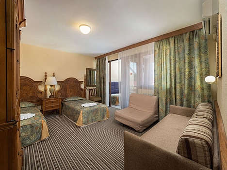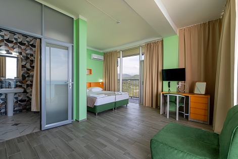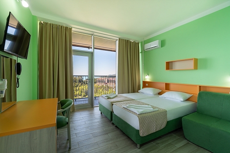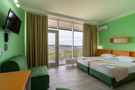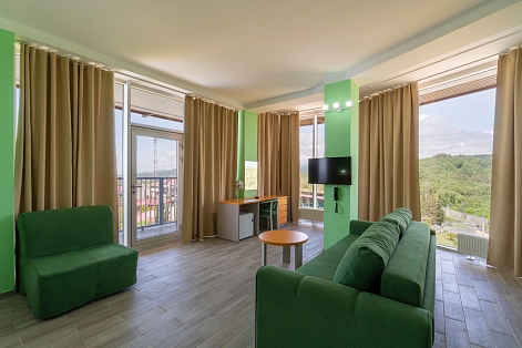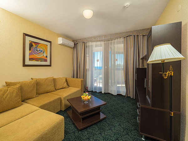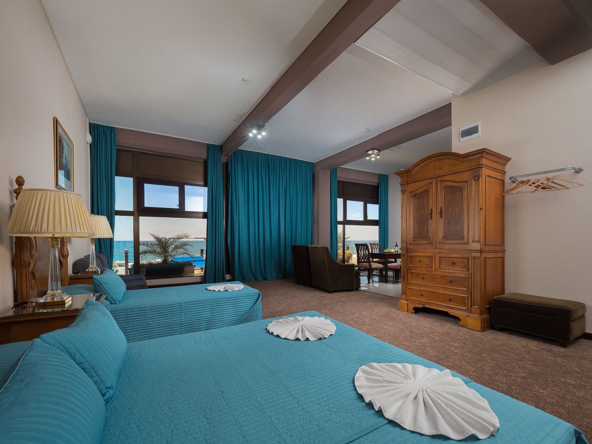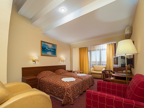В номере: диван, кресло-кровать, кровать односпальная, прикроватные тумбочки, столик туалетный, кондиционер, сейф, телевизор, телефон
