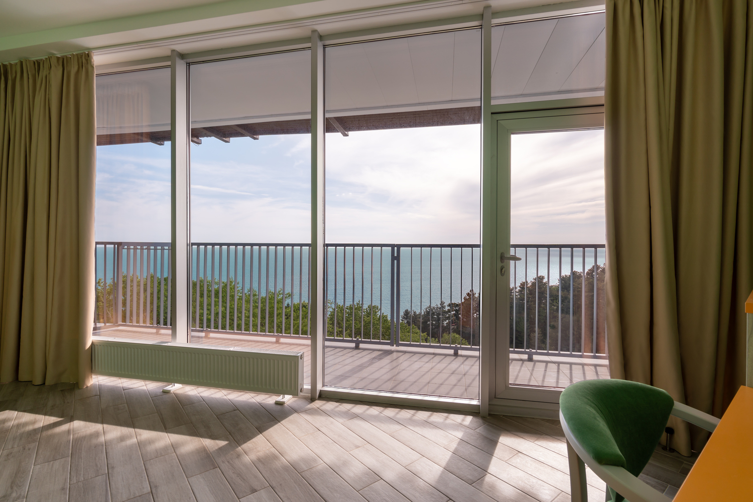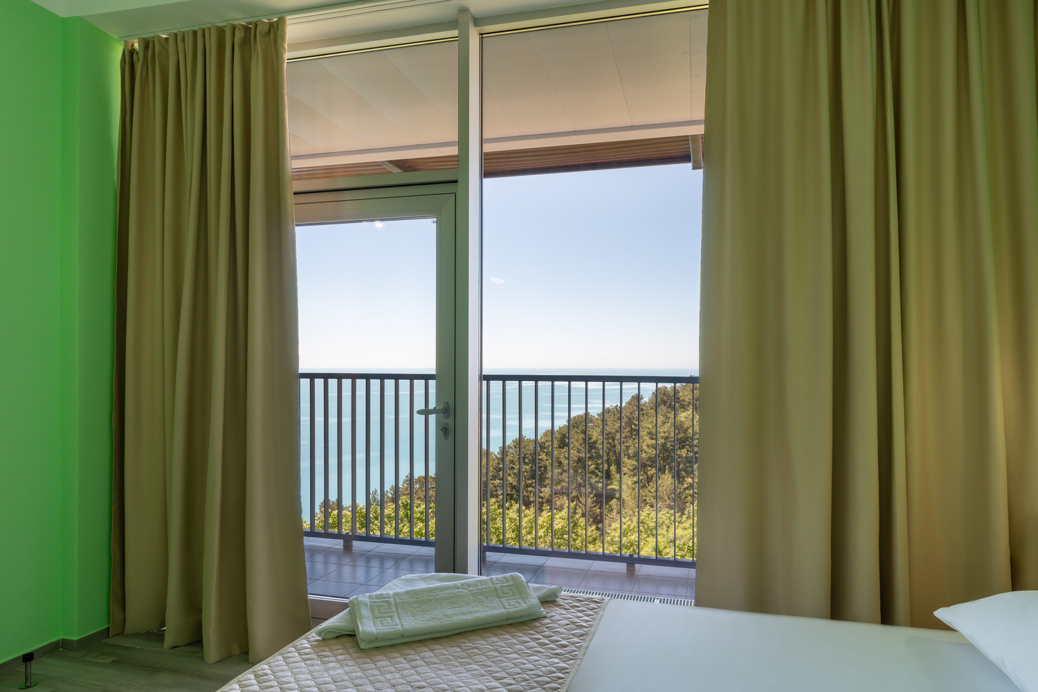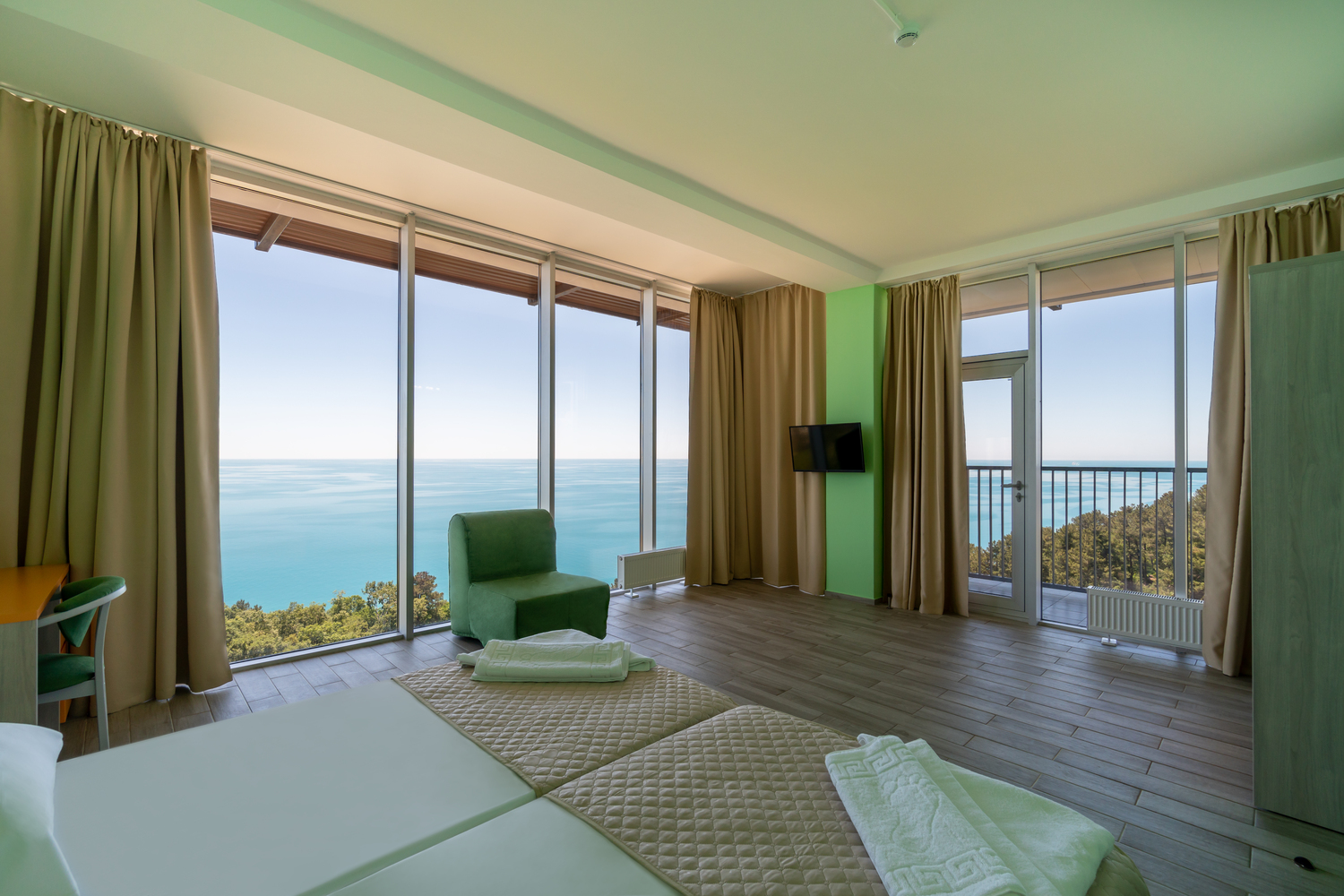 В номере: диван, кресло-кровать, кровать односпальная, прикроватные тумбочки, столик туалетный, кондиционер, сейф, телевизор, телефон