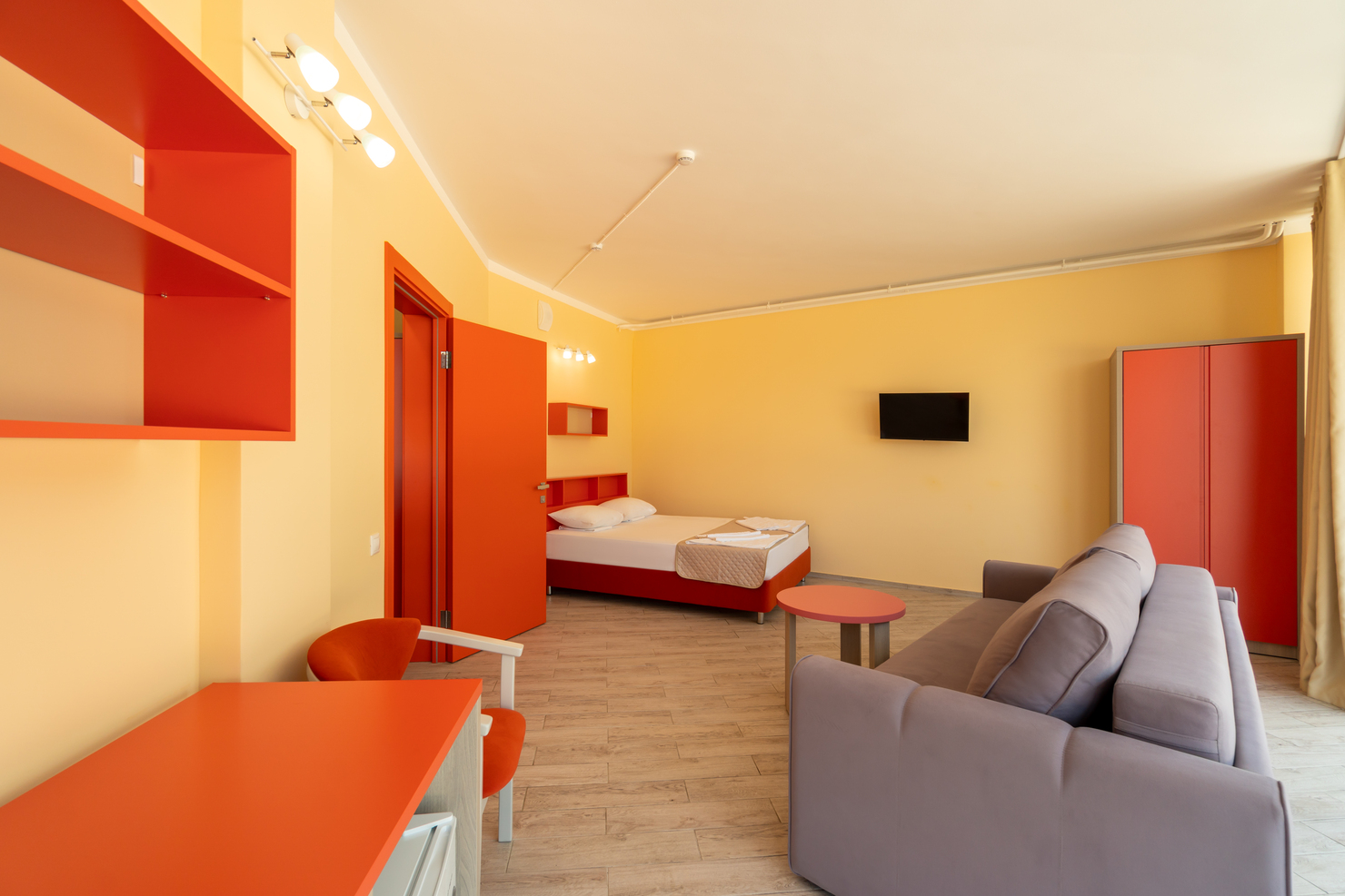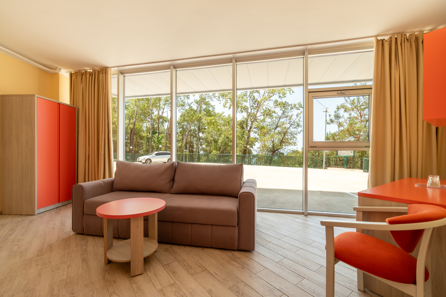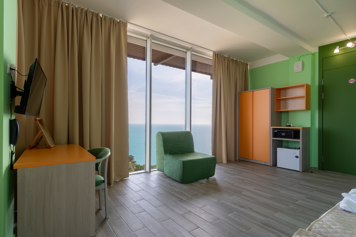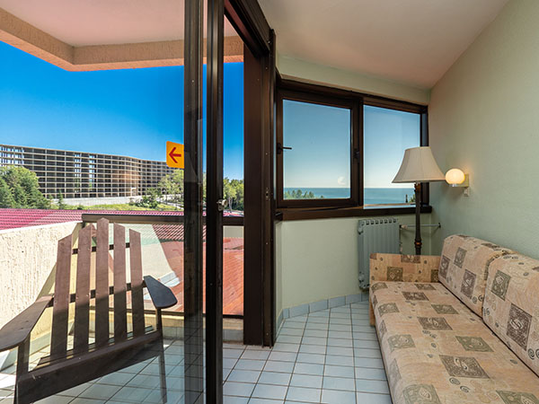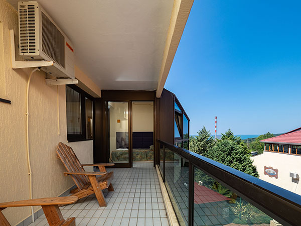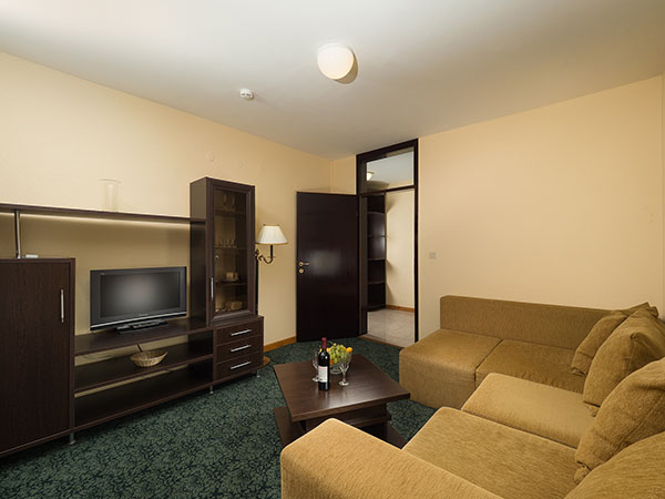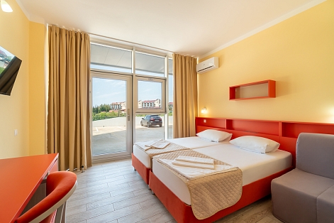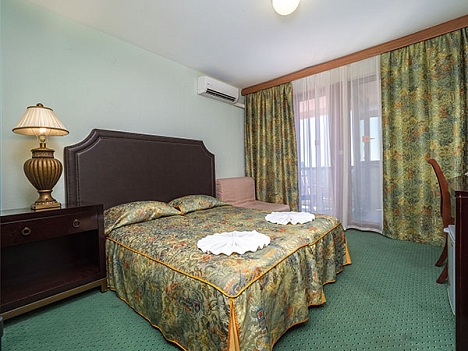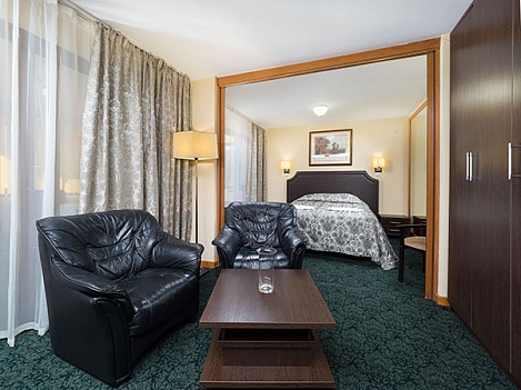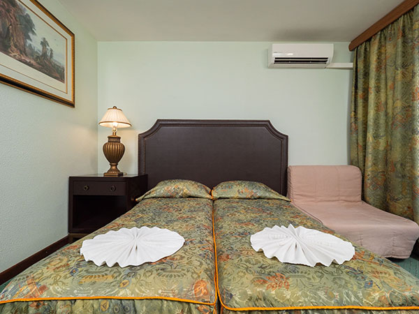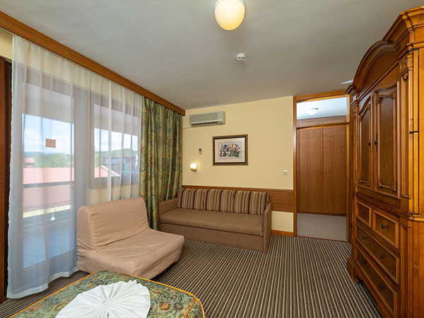 В номере: диван, кровать односпальная, прикроватные тумбочки, столик журнальный, столик туалетный, шкаф, кондиционер, мини-холодильник, сейф, телевизор, телефон