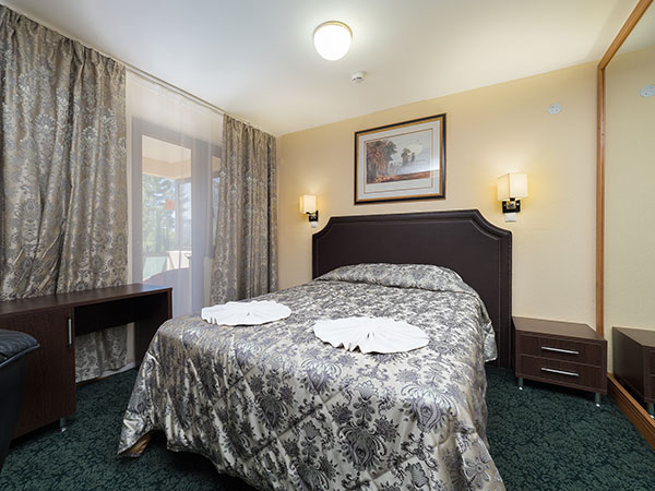 В номере: зеркало, кровать односпальная, прикроватные тумбочки, столик туалетный, шкаф, кондиционер, сейф, телевизор, телефон, холодильник
