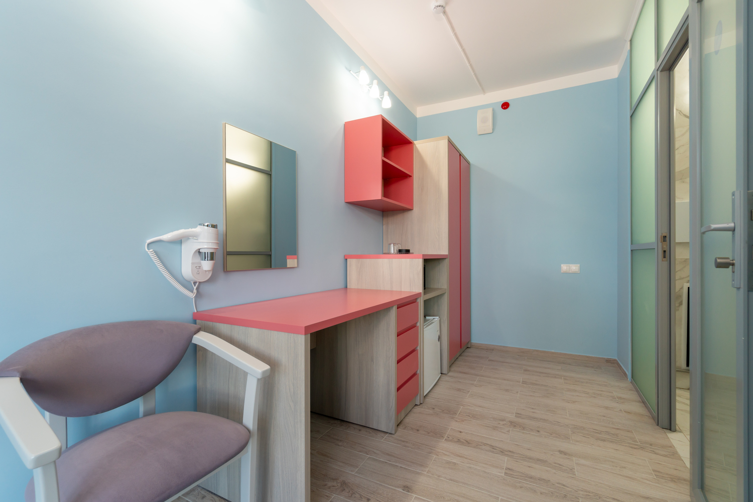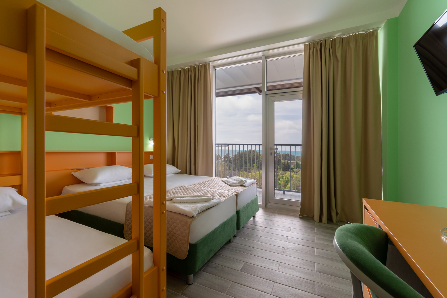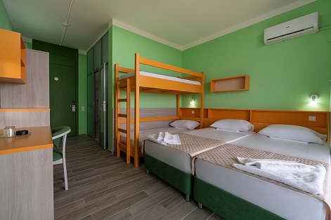 В номере: зеркало, кровать двухъярусная, стол, стул, шкаф, кондиционер, сейф, телевизор, телефон, холодильник