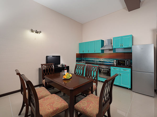В номере: зеркало, кресло-кровать, кровать двуспальная, кровать односпальная, прикроватные тумбочки, кондиционер, микроволновая печь, набор посуды, плита электрическая, посудомоечная машина, сейф, телевизор ЖК, телефон, холодильник, электрочайник