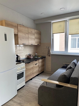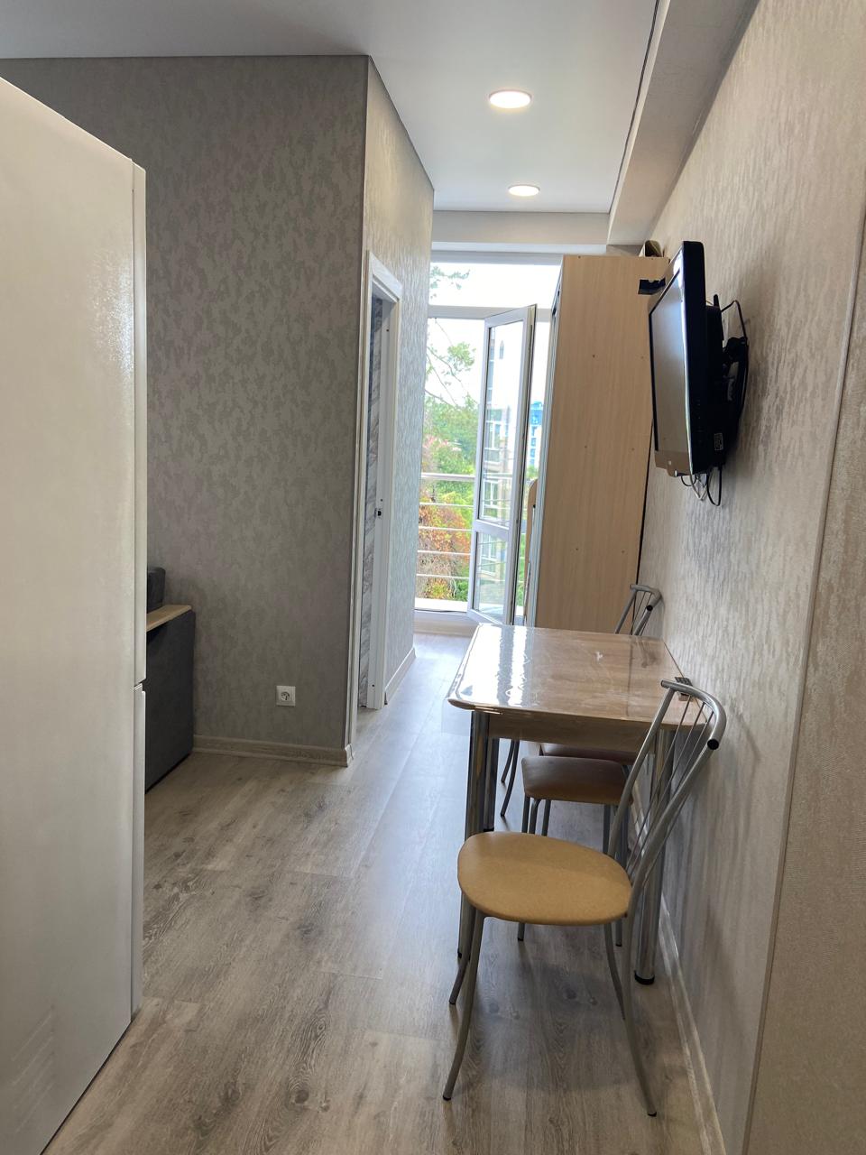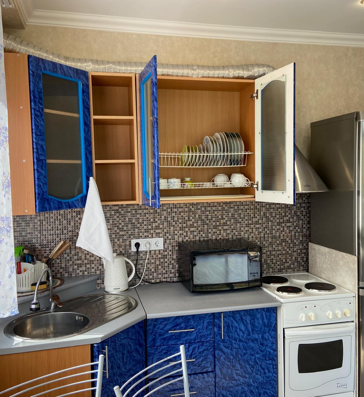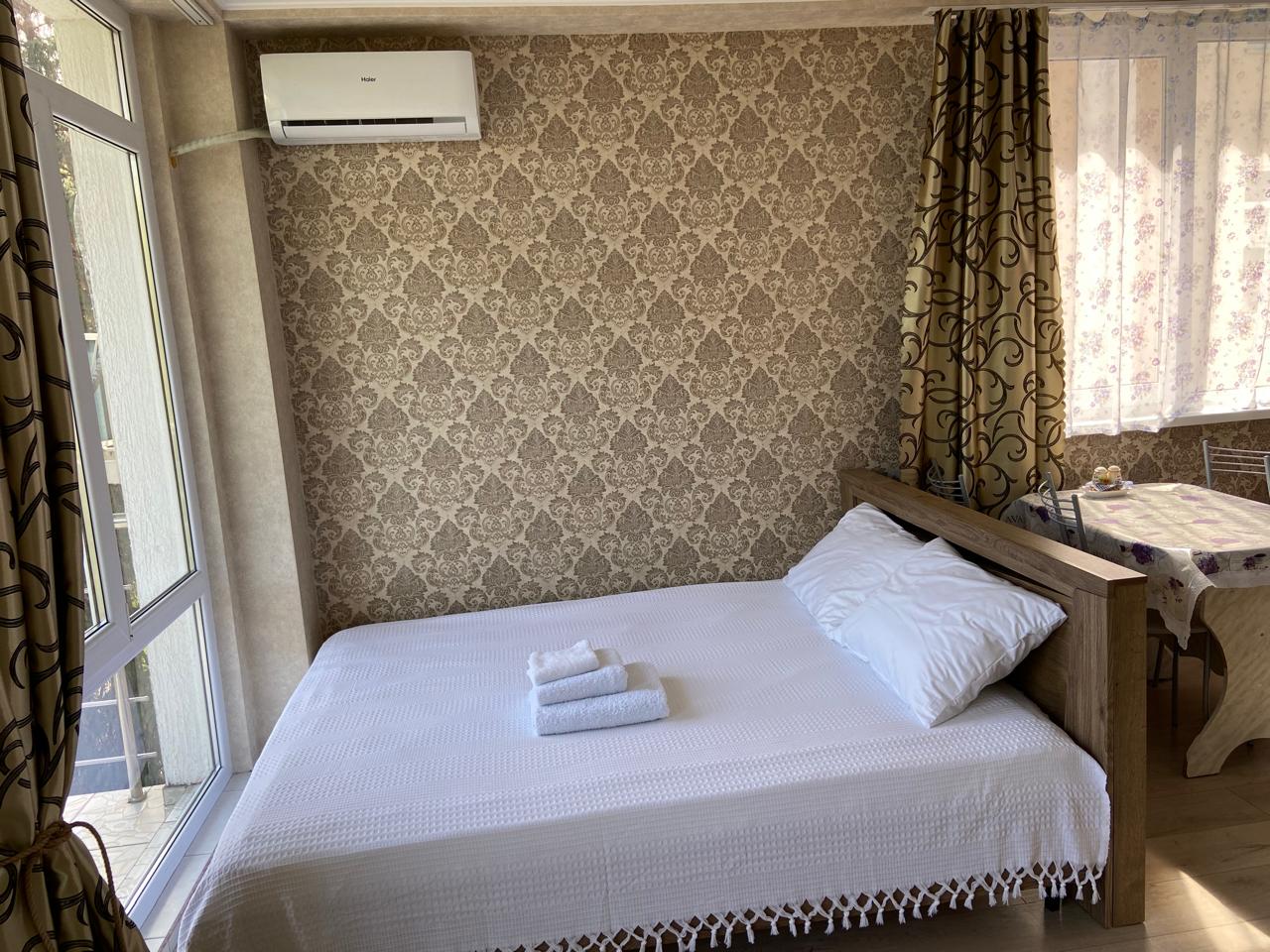 В номере: диван раскладной, кровать двуспальная, стол, стулья, гладильная доска, кондиционер, микроволновая печь, набор посуды, плита электрическая, стиральная машина, телевизор, утюг, холодильник, электрочайник