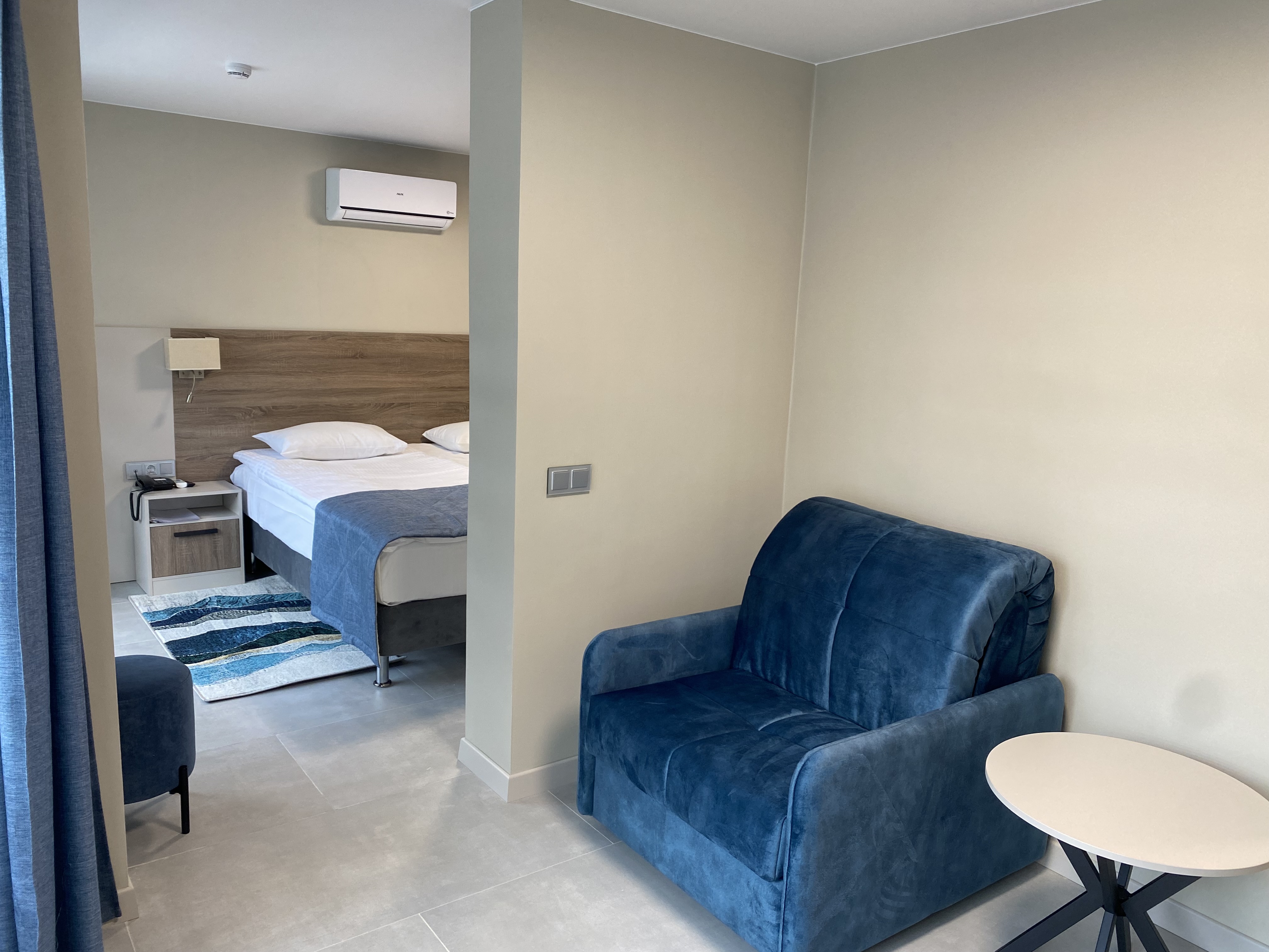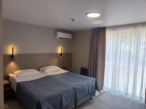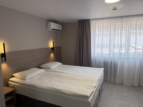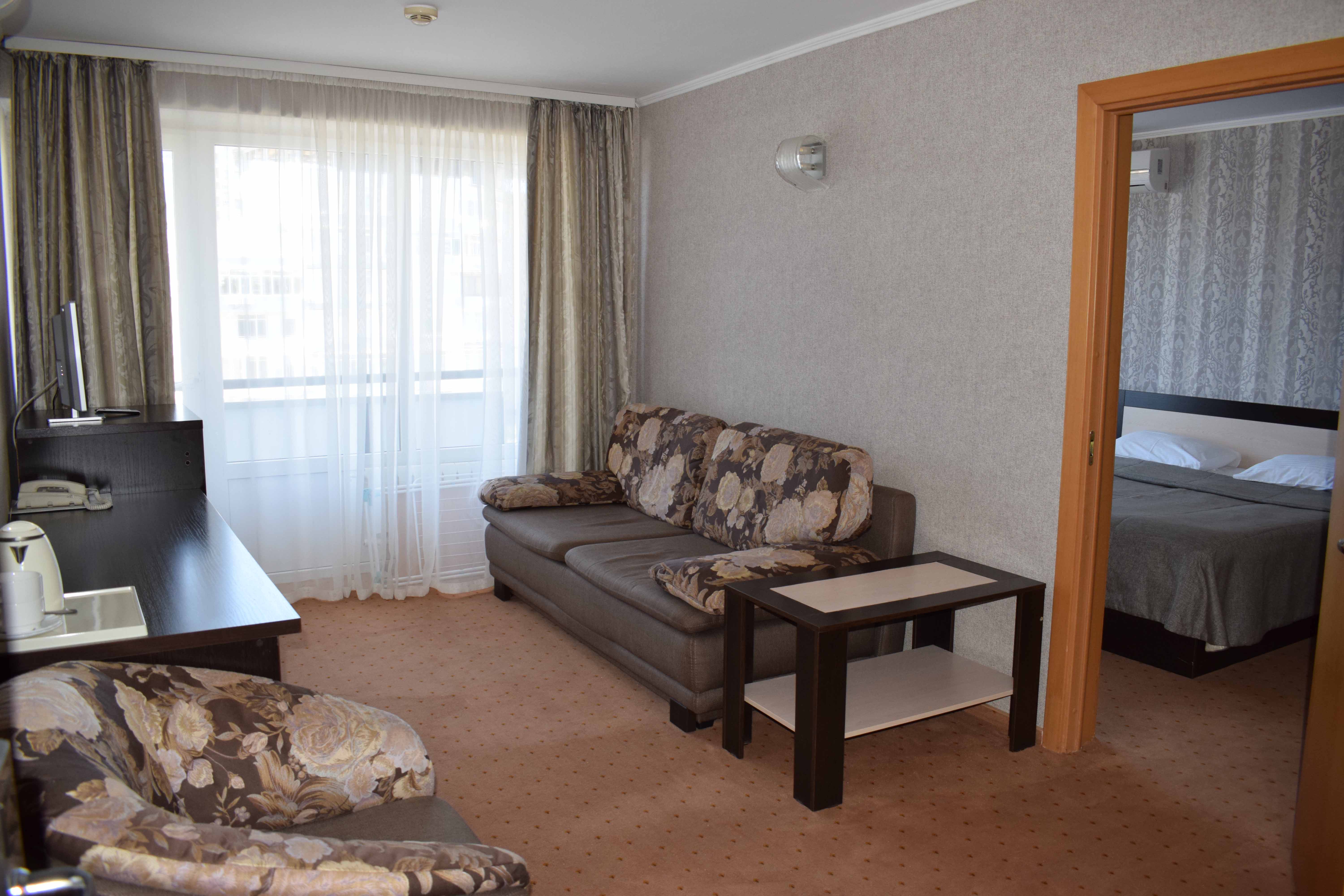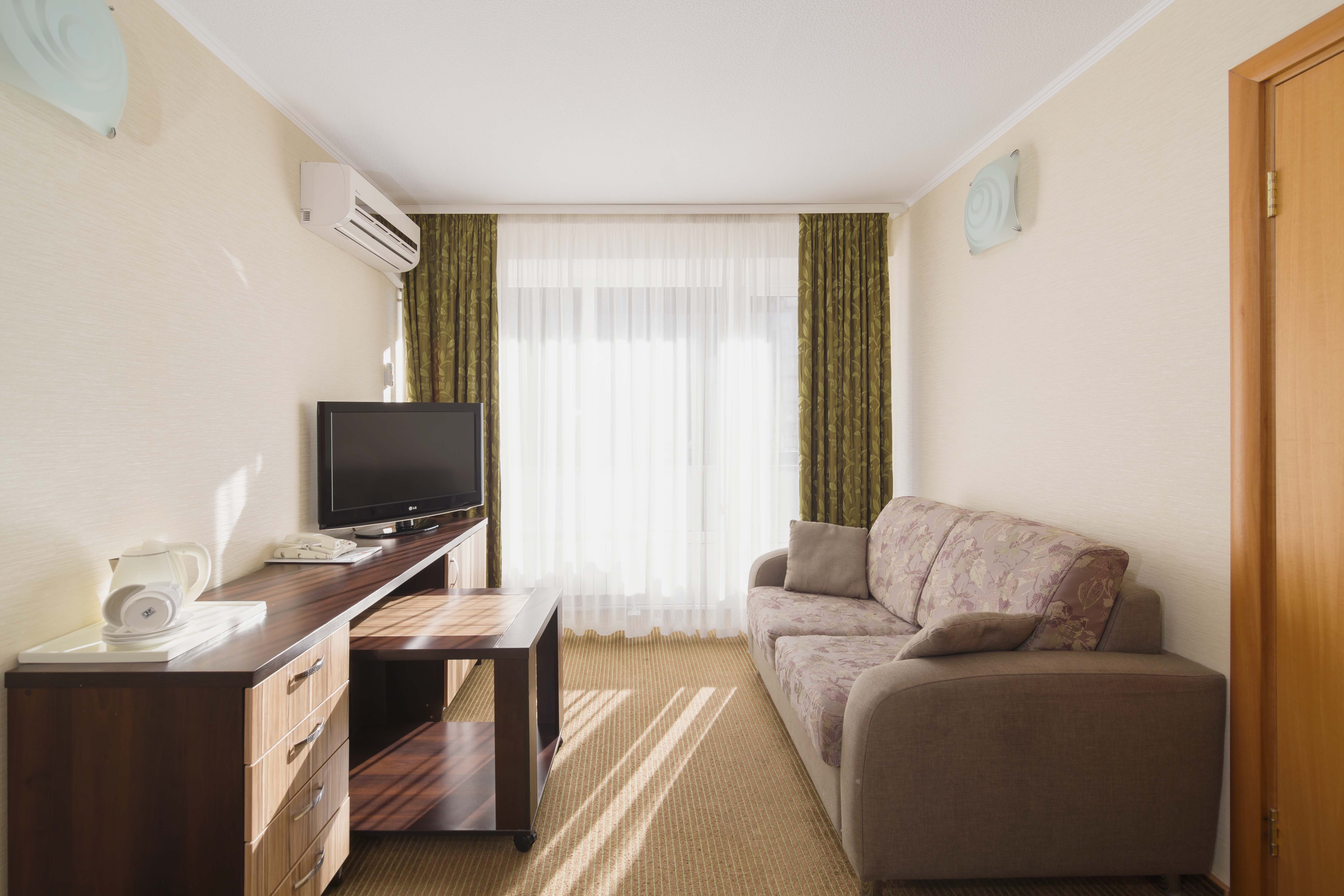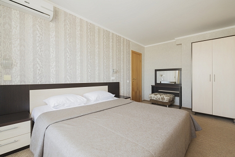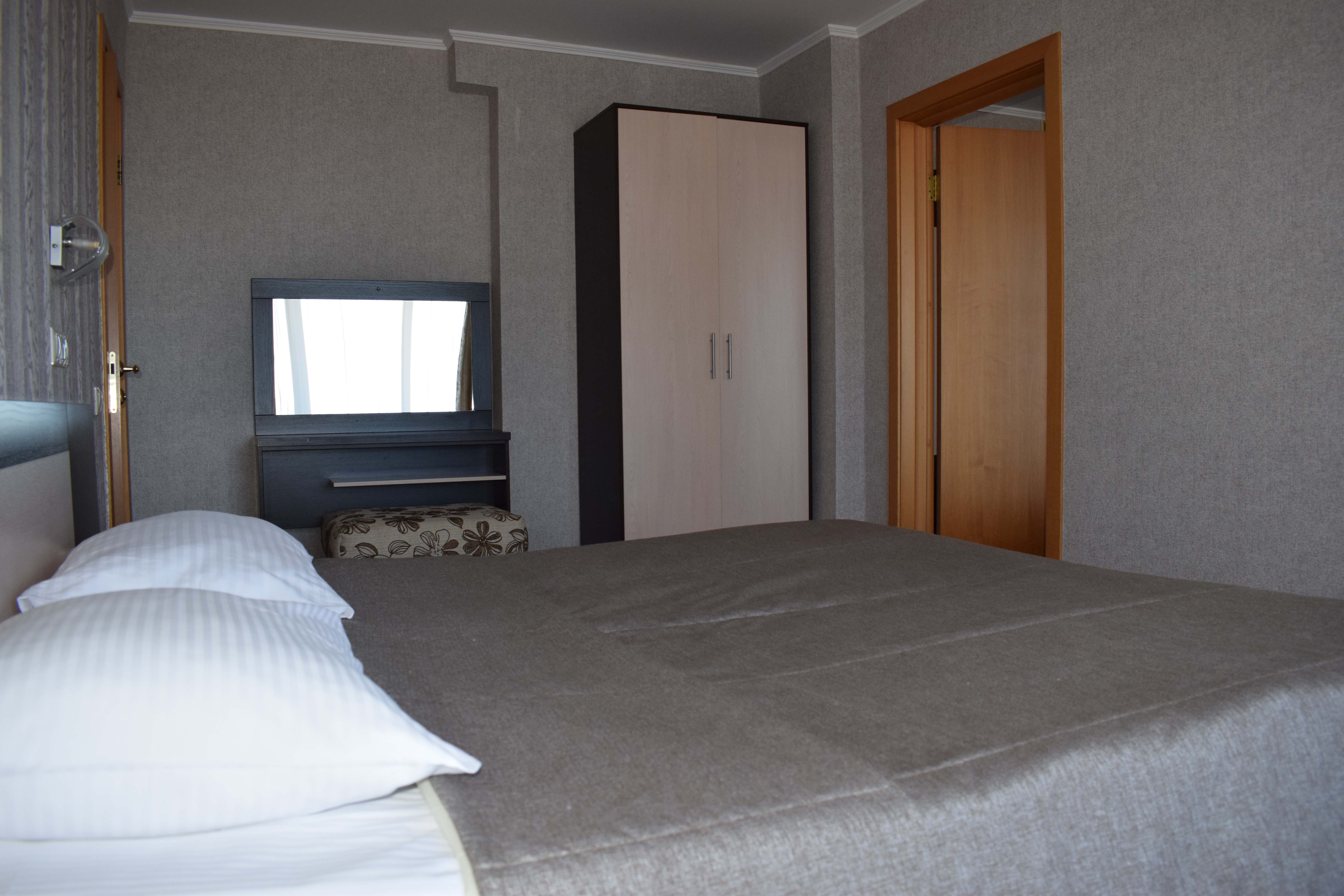 В номере: диван раскладной, зеркало, кровать двуспальная, прикроватные тумбочки, стол, шкаф, кондиционер, мини-холодильник, телевизор, телефон, электрочайник