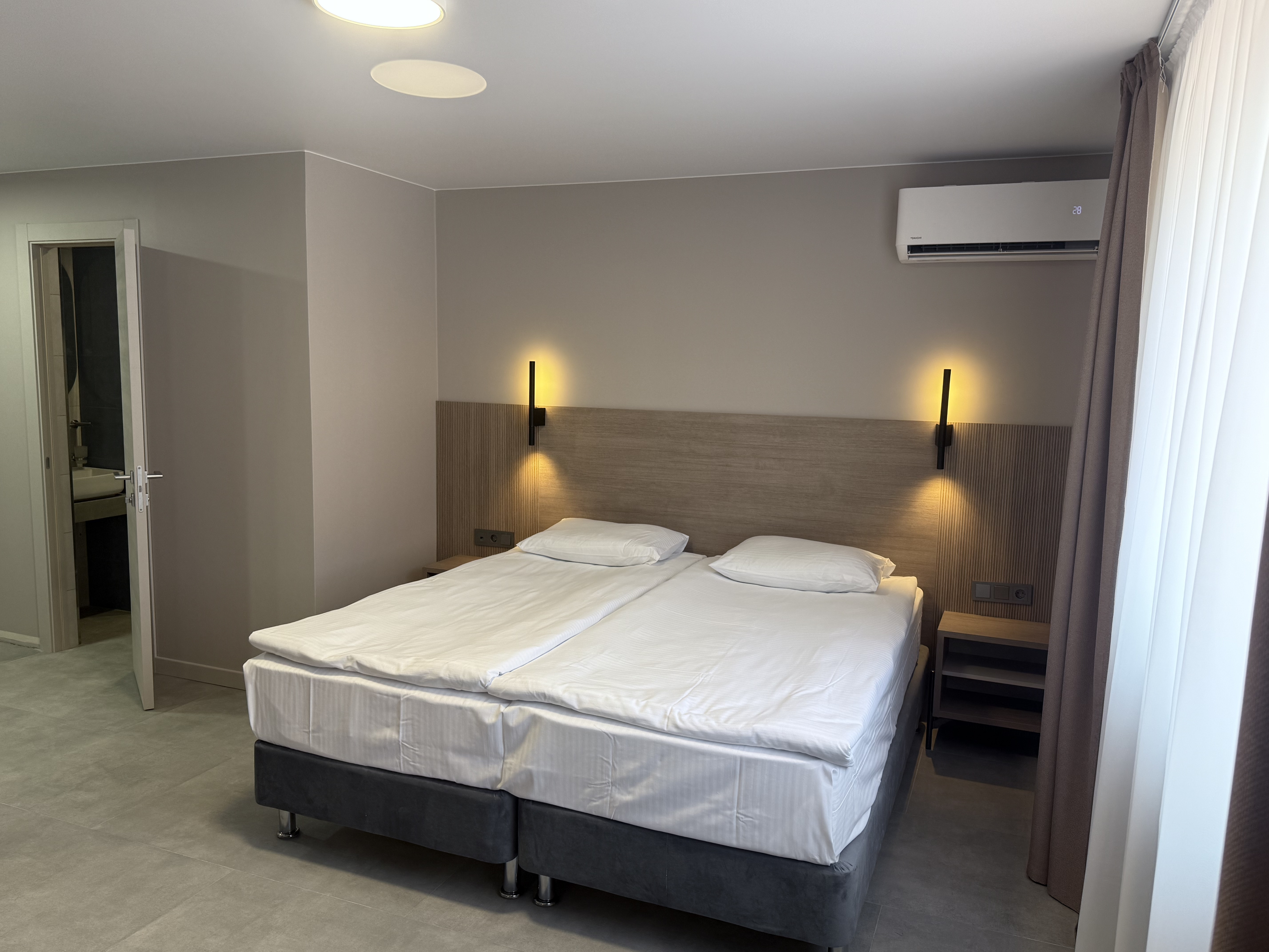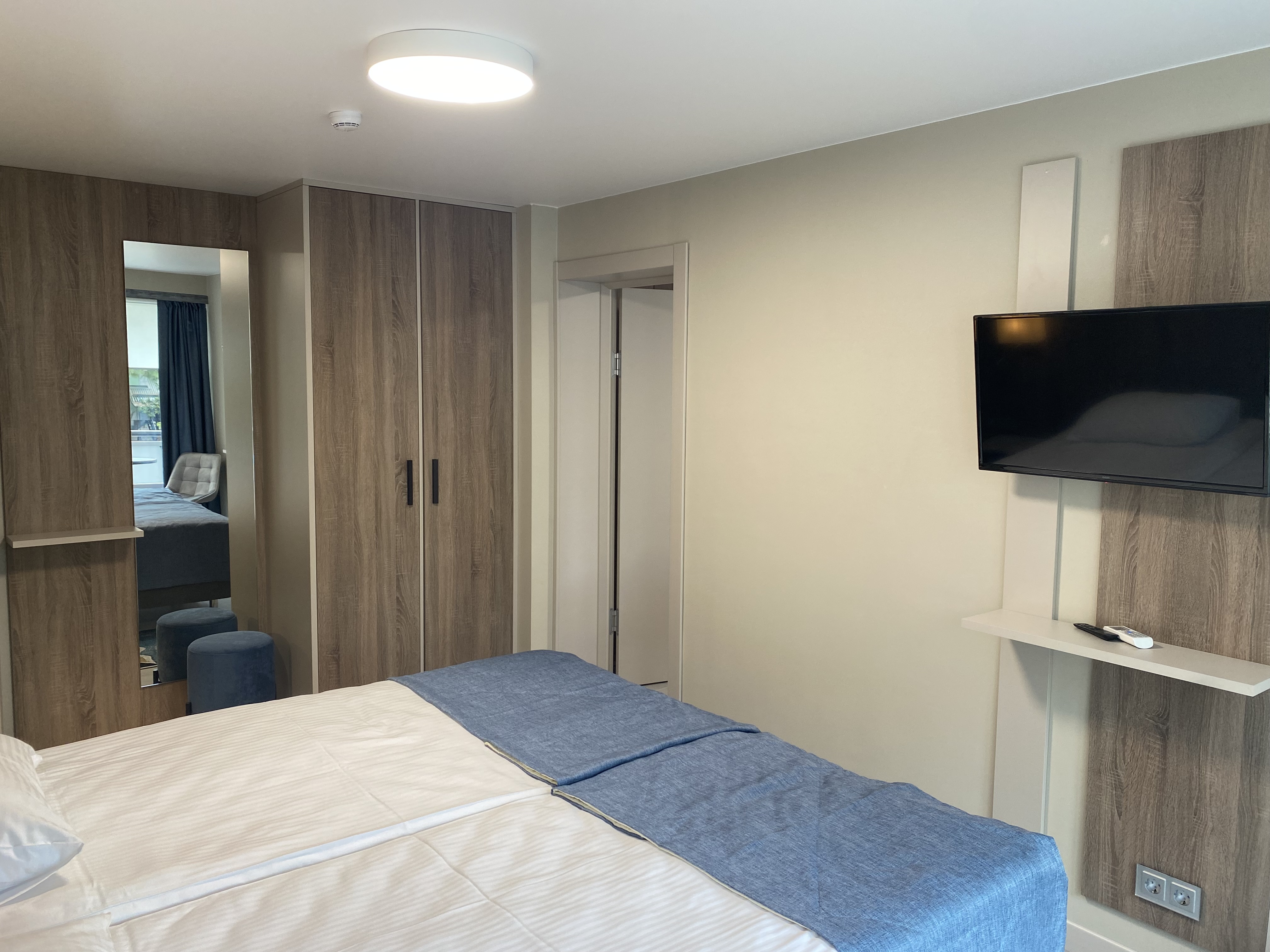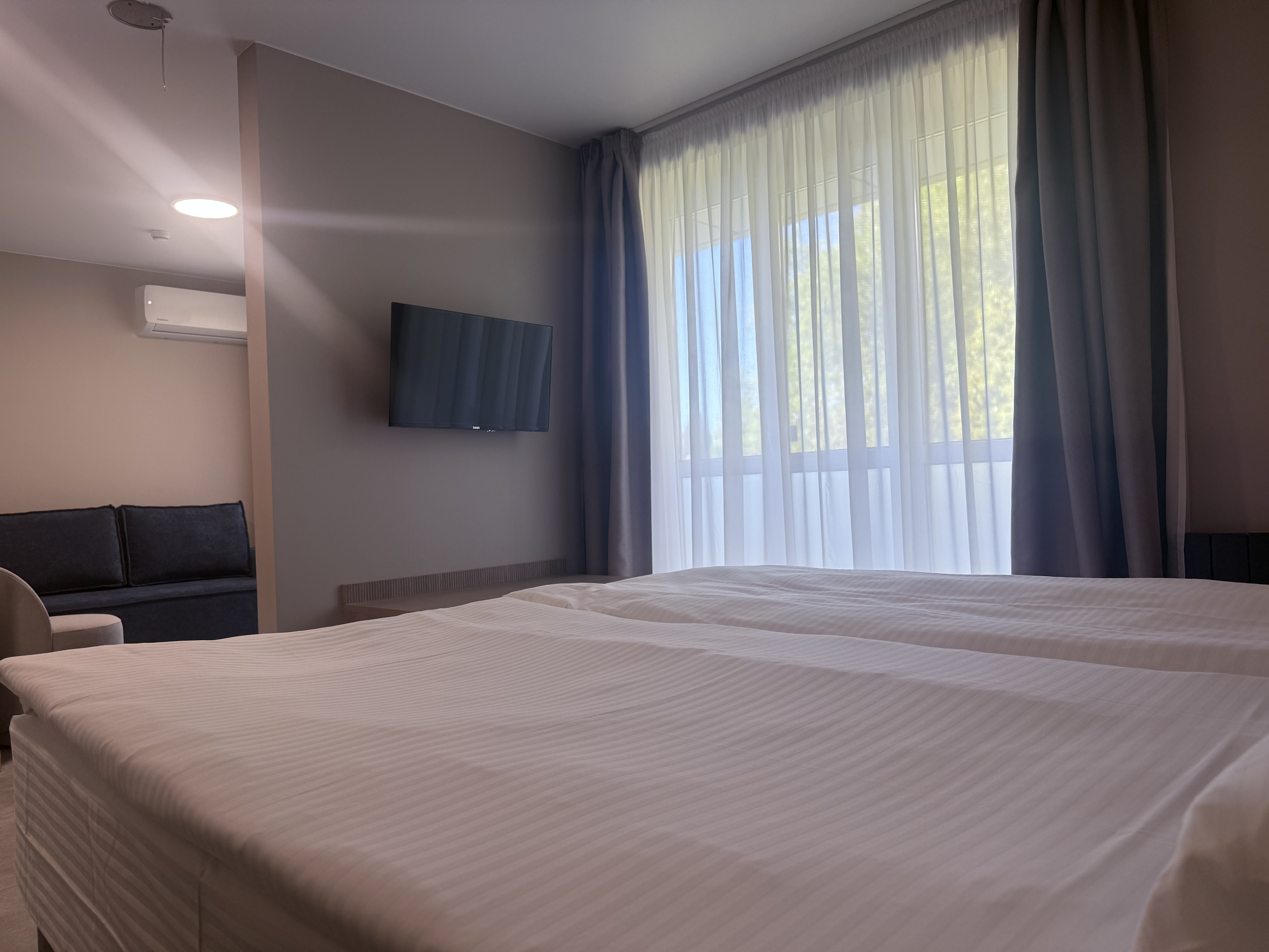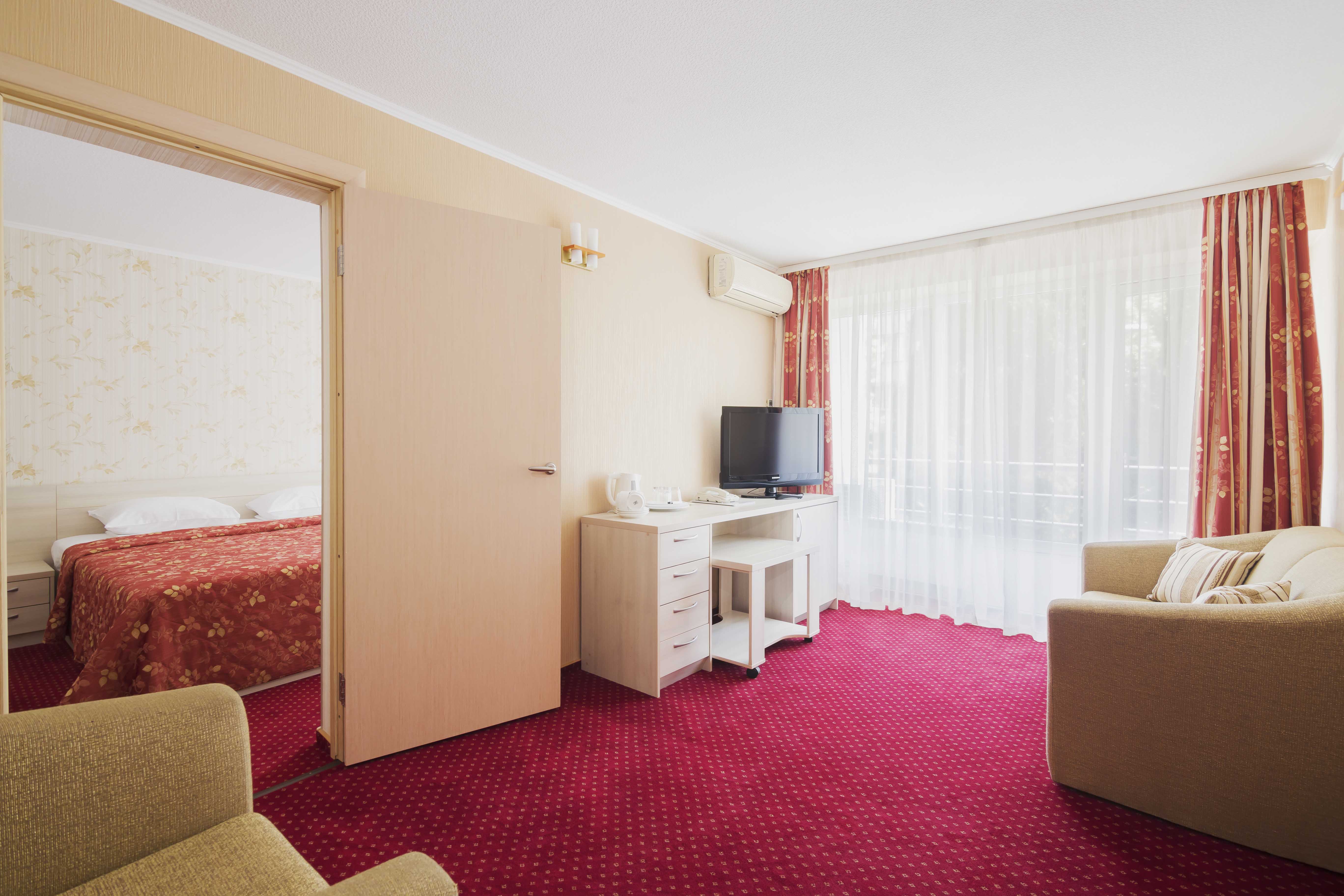 В номере: диван раскладной, зеркало, кровать двуспальная, прикроватные тумбочки, стол, шкаф, кондиционер, мини-холодильник, телевизор, телефон, электрочайник