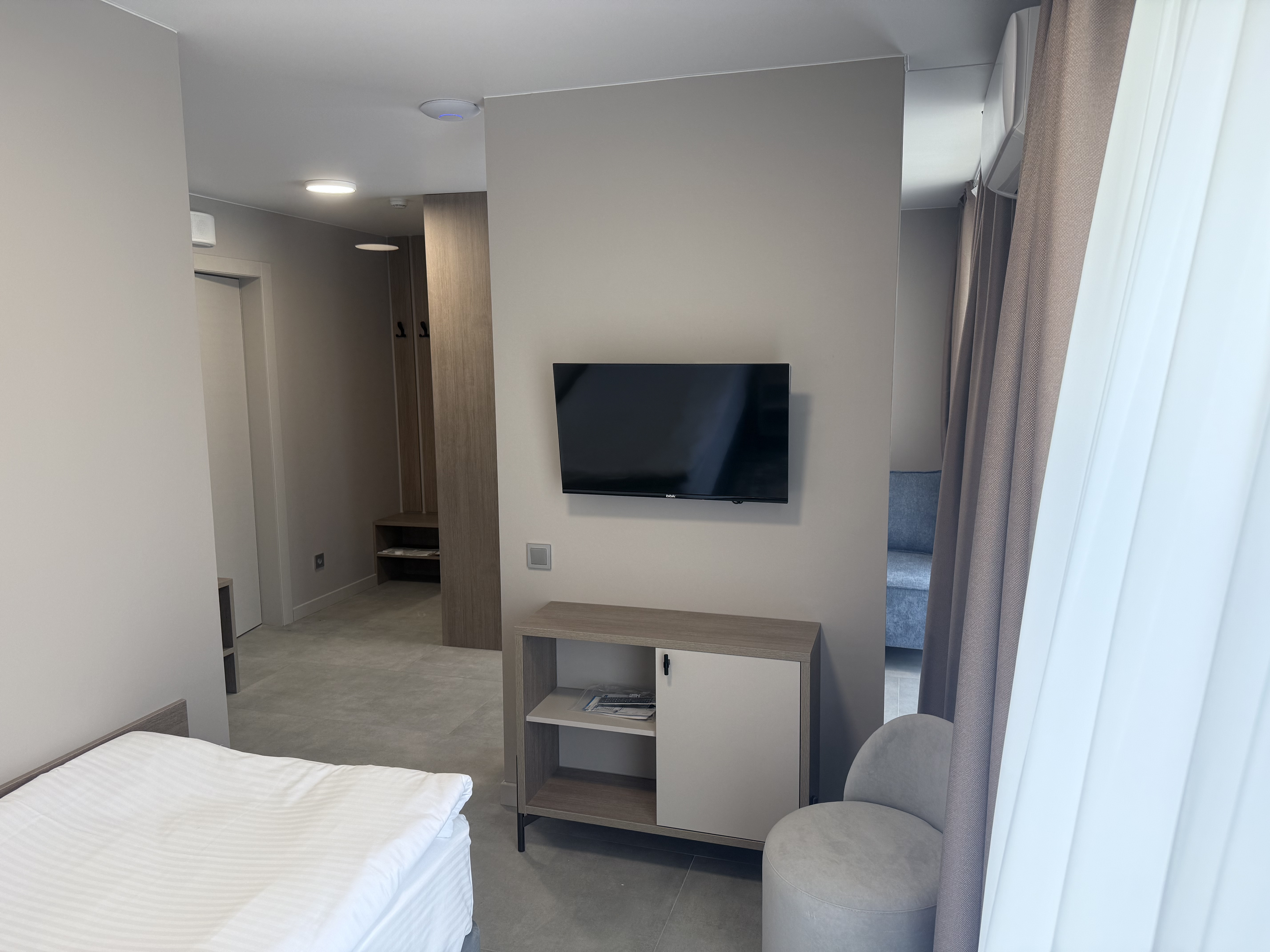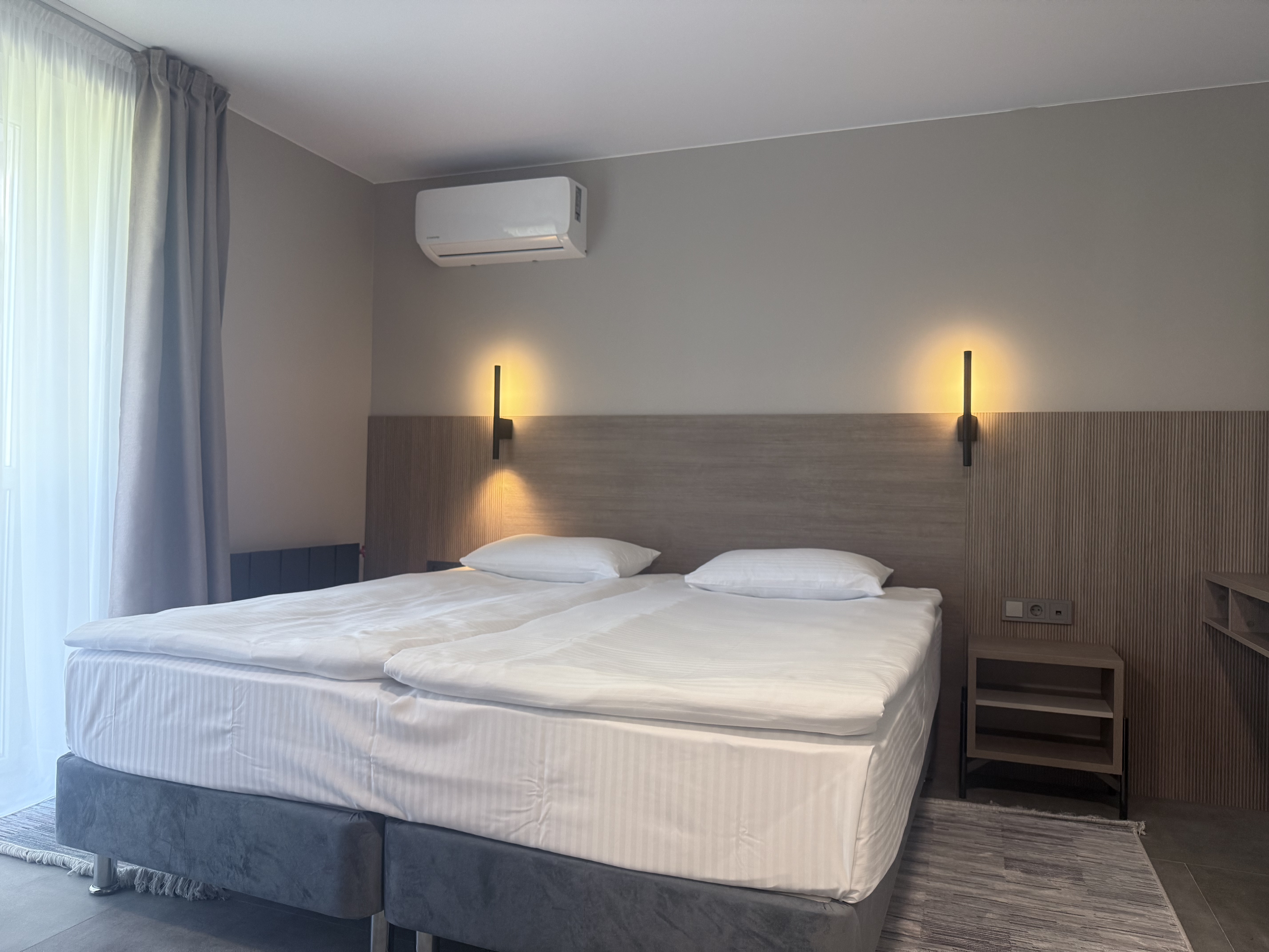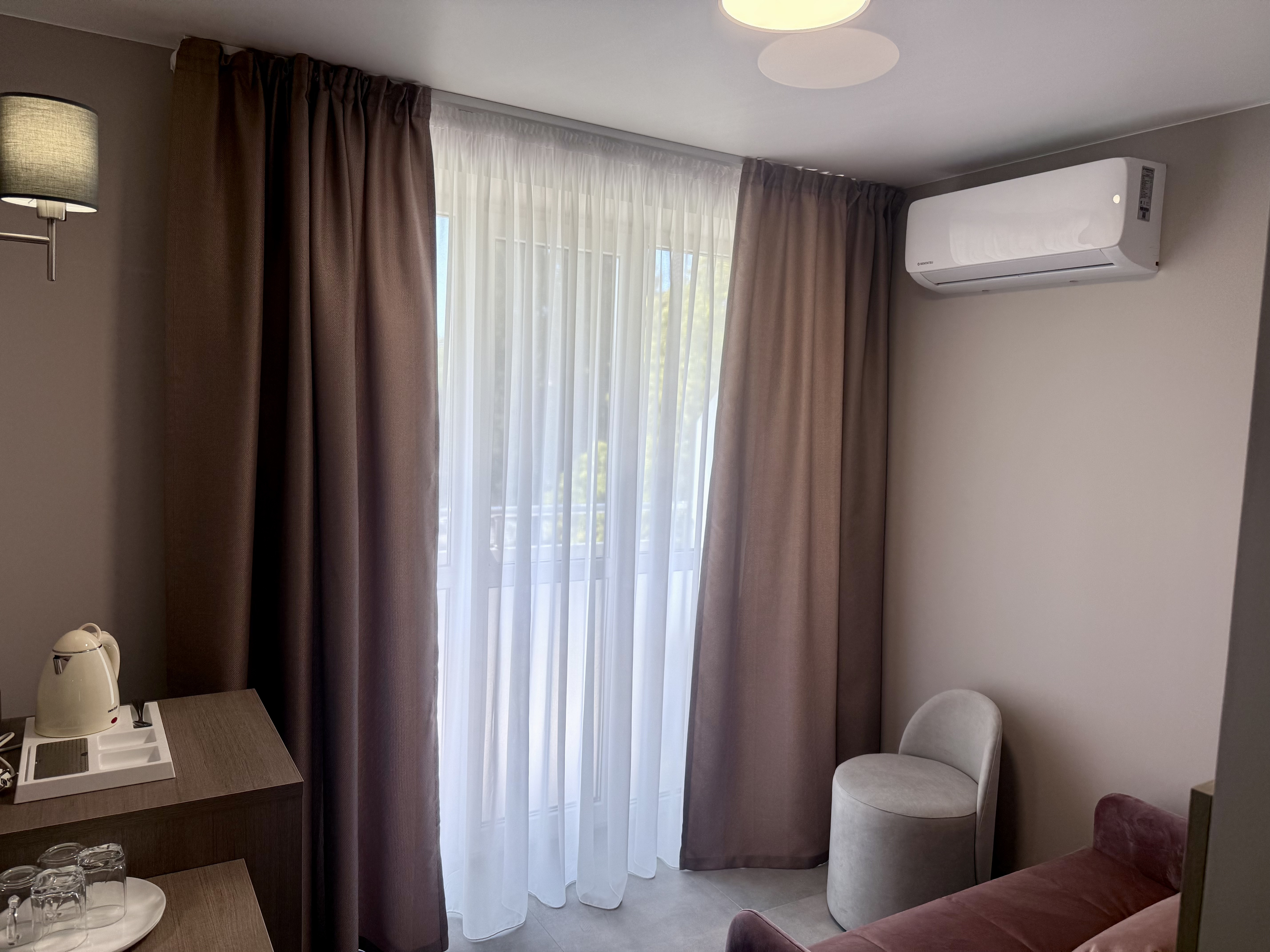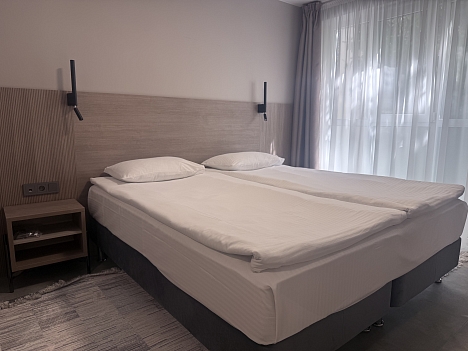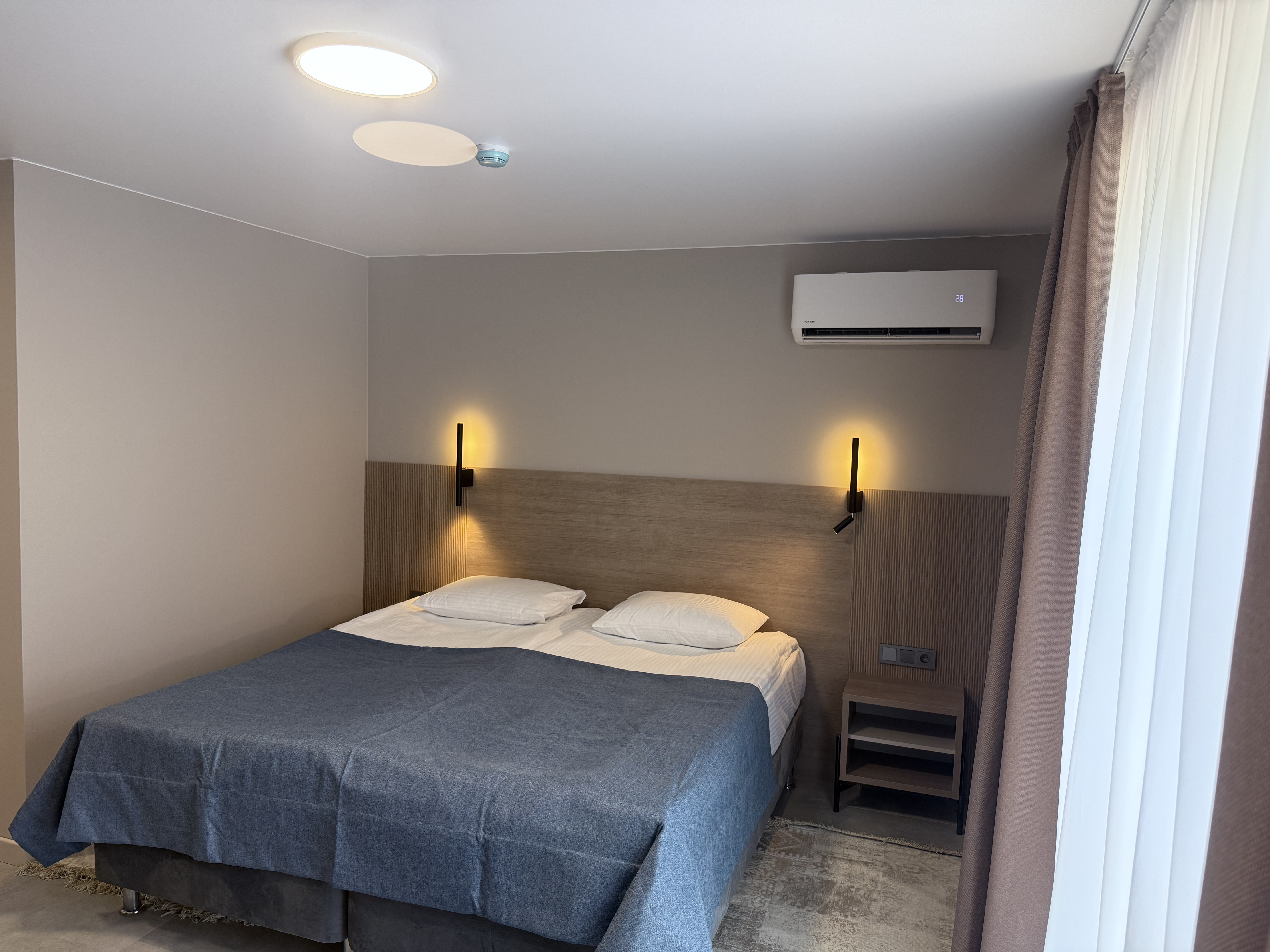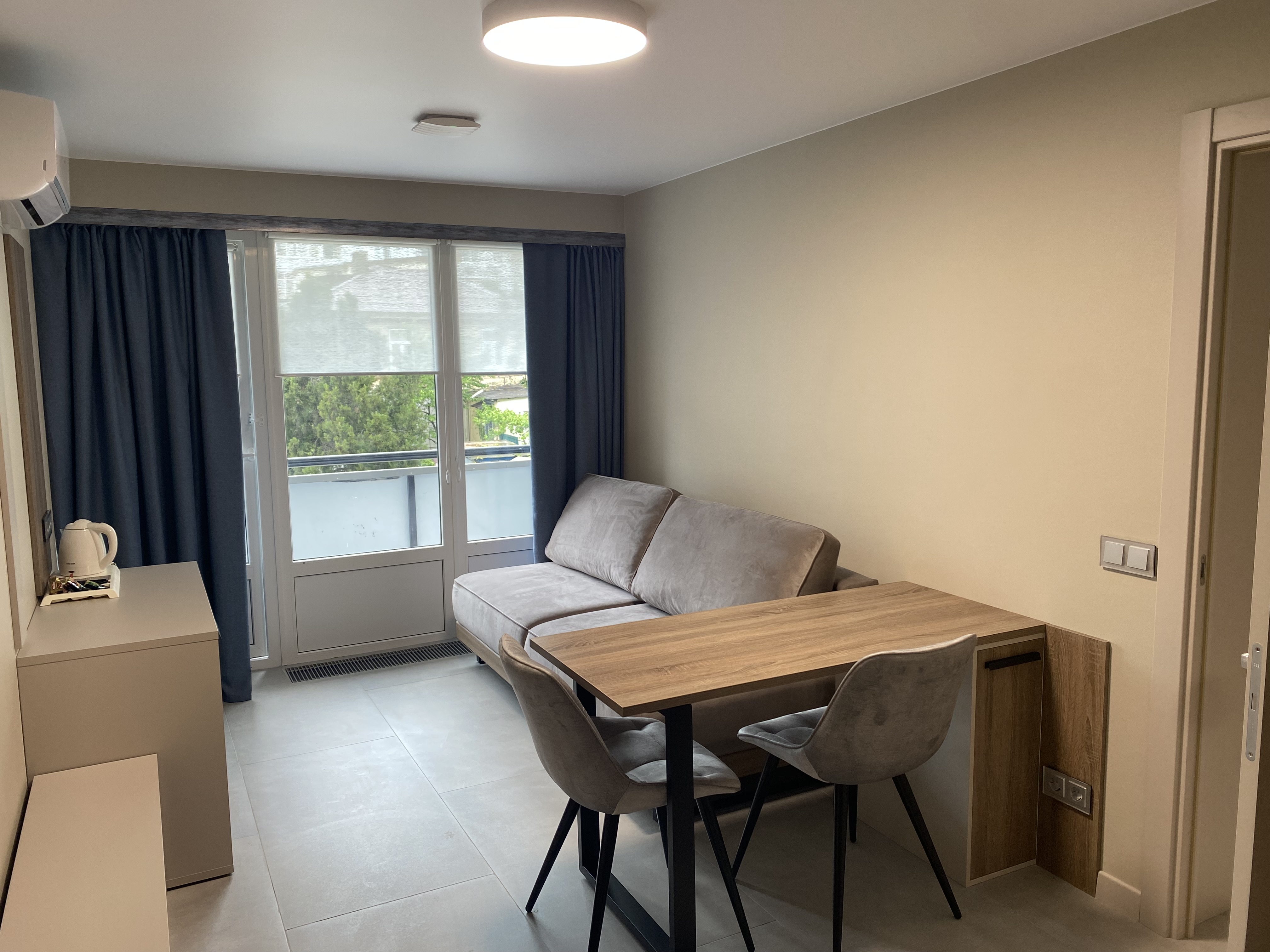 В номере: диван раскладной, зеркало, кровать двуспальная, прикроватные тумбочки, стол, шкаф, кондиционер, мини-холодильник, телевизор, телефон, электрочайник
