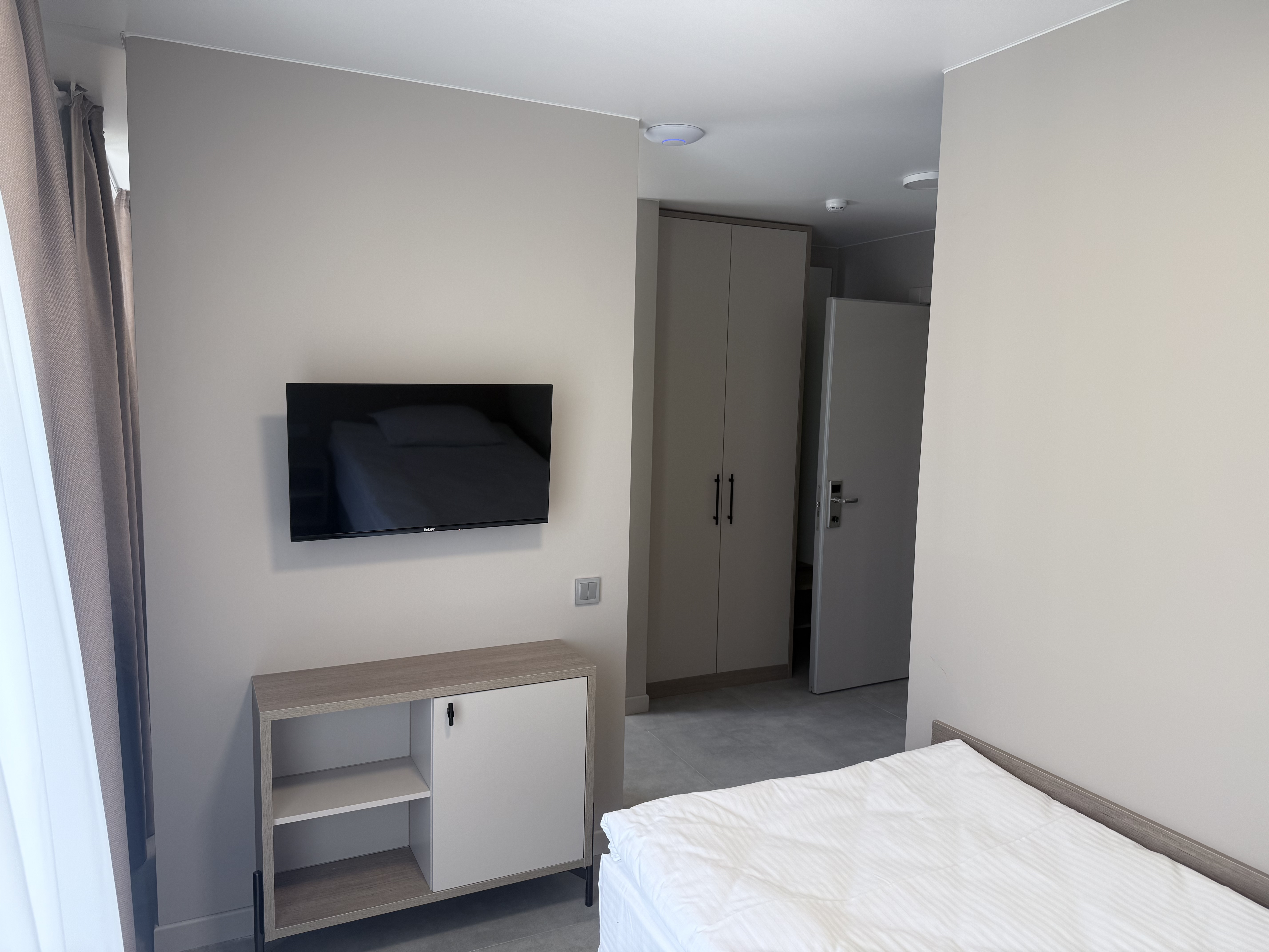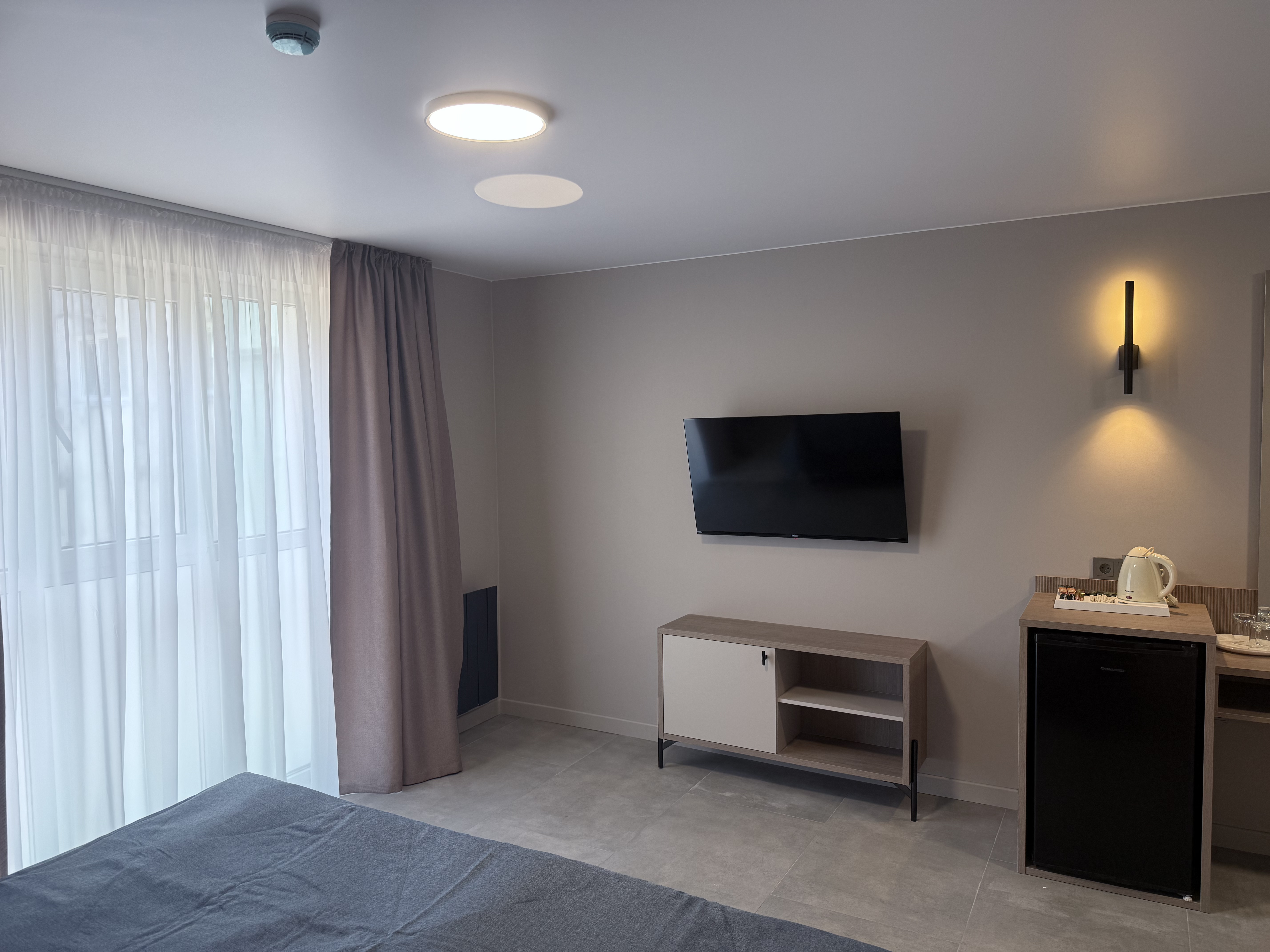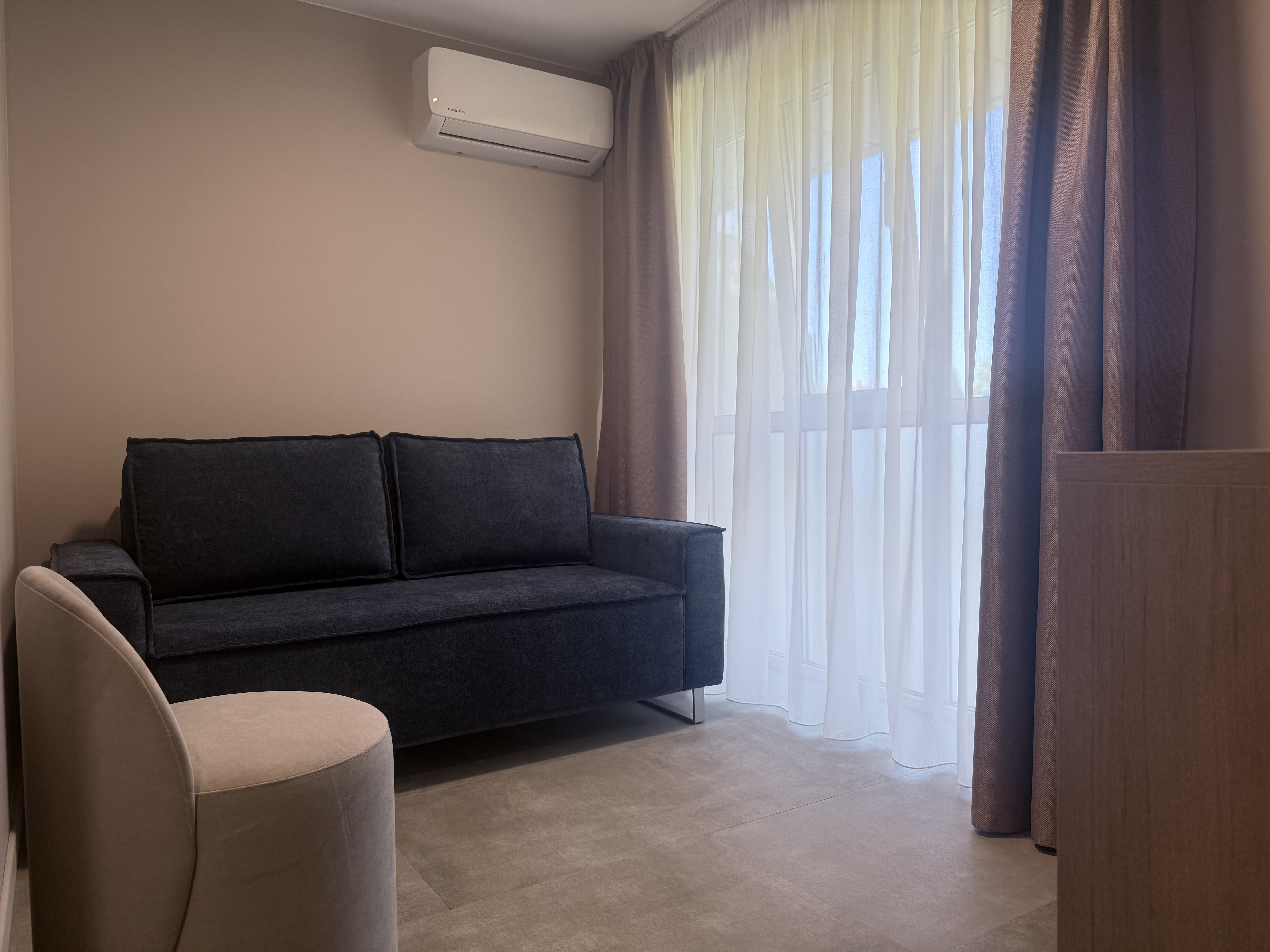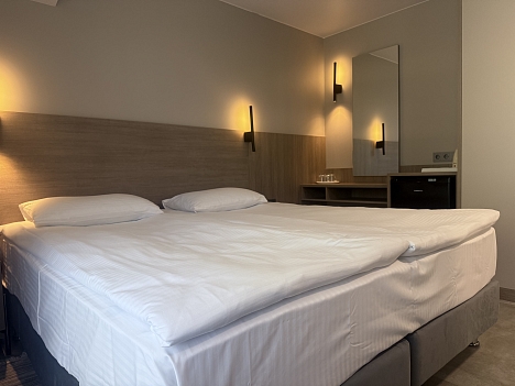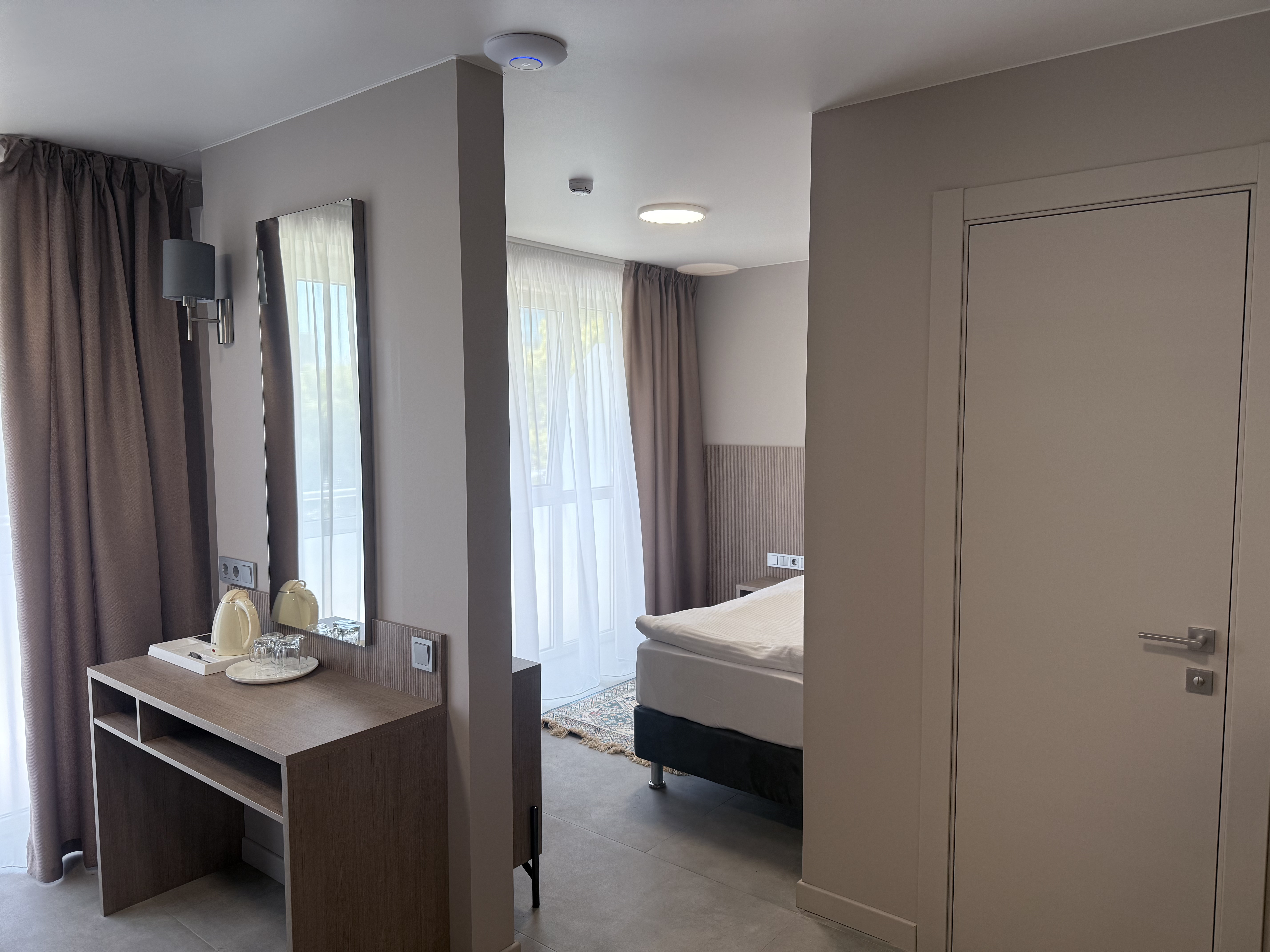 В номере: диван раскладной, зеркало, кровать двуспальная, прикроватные тумбочки, стол, шкаф, кондиционер, мини-холодильник, телевизор, телефон, электрочайник