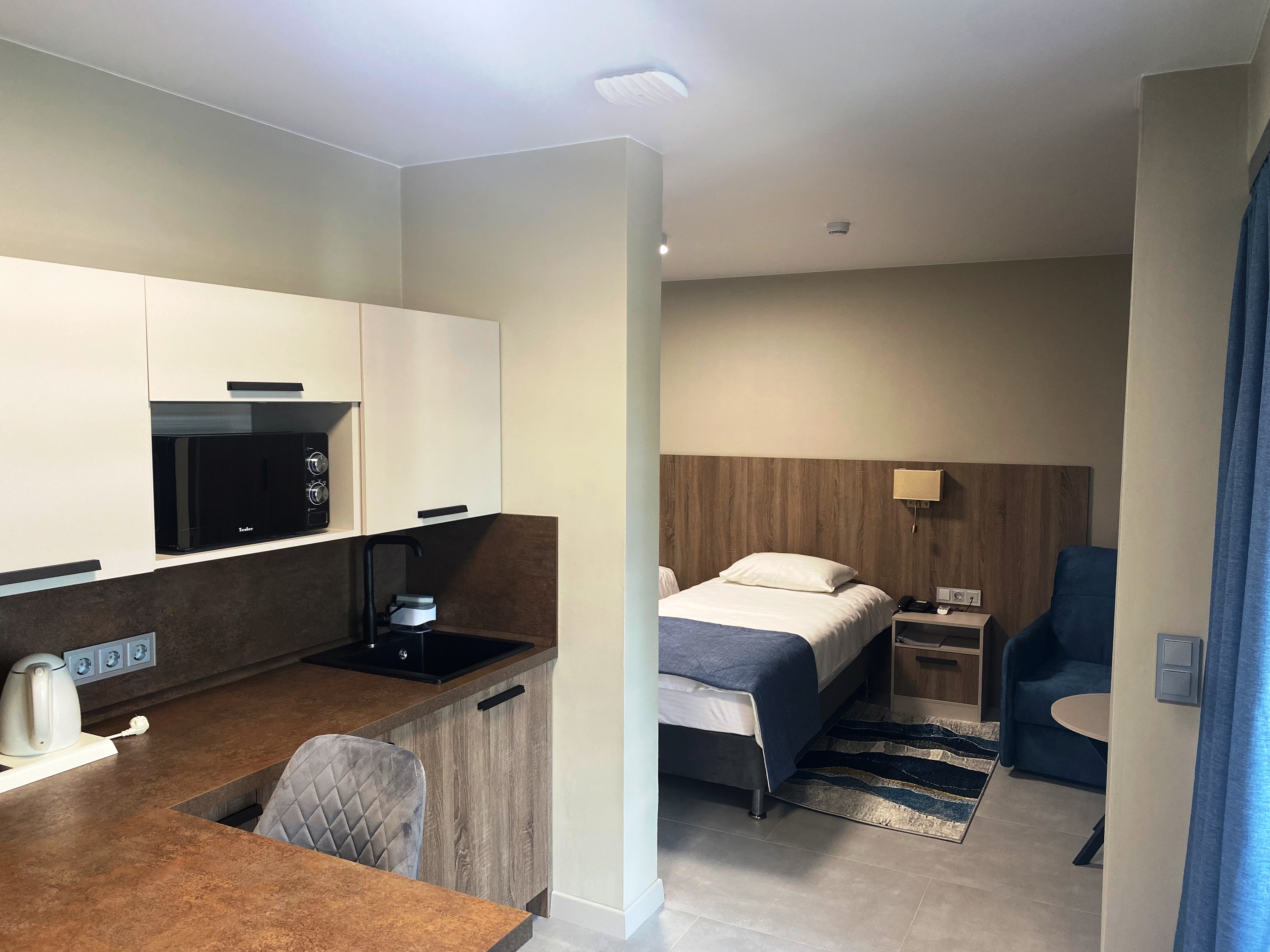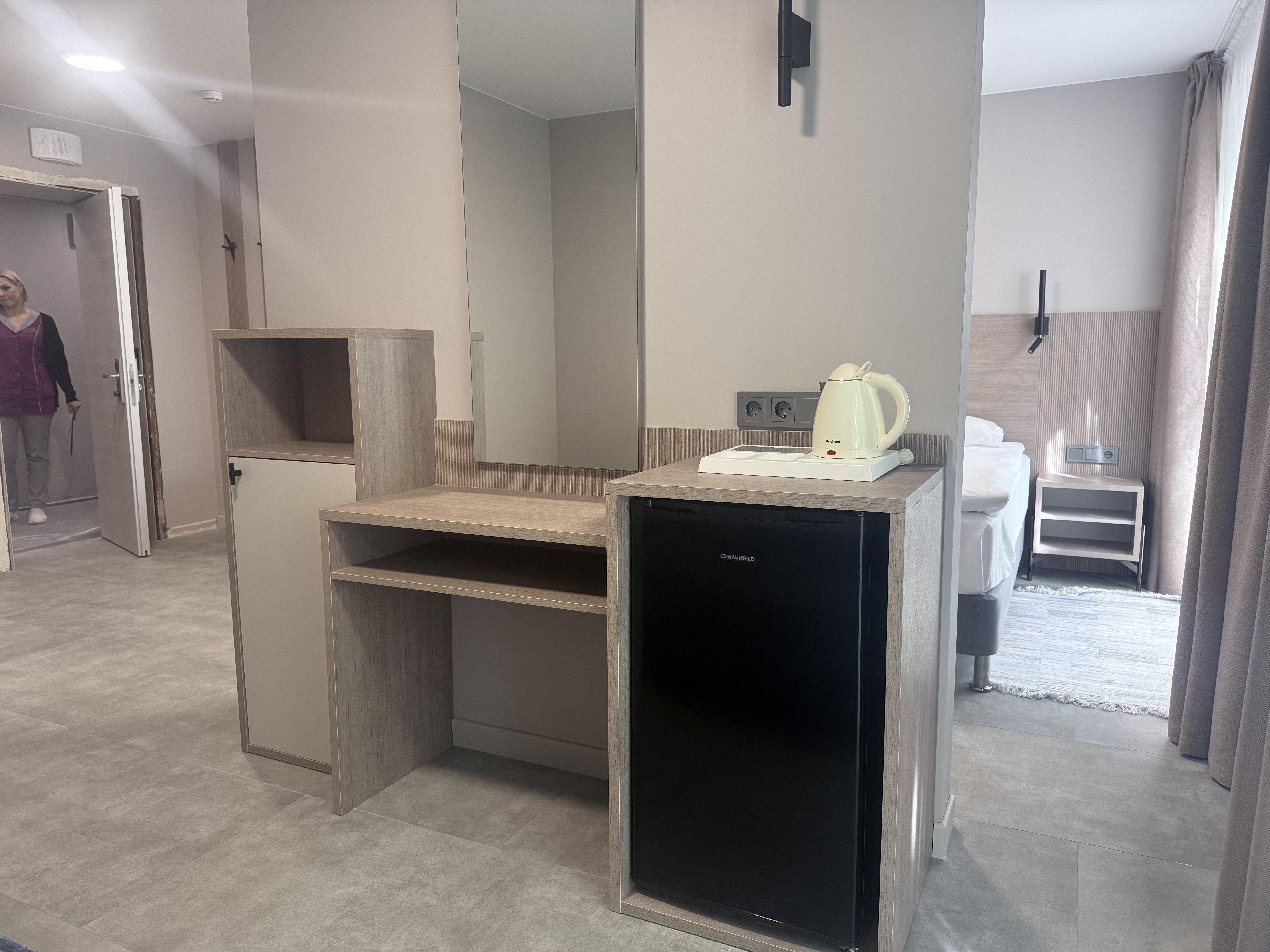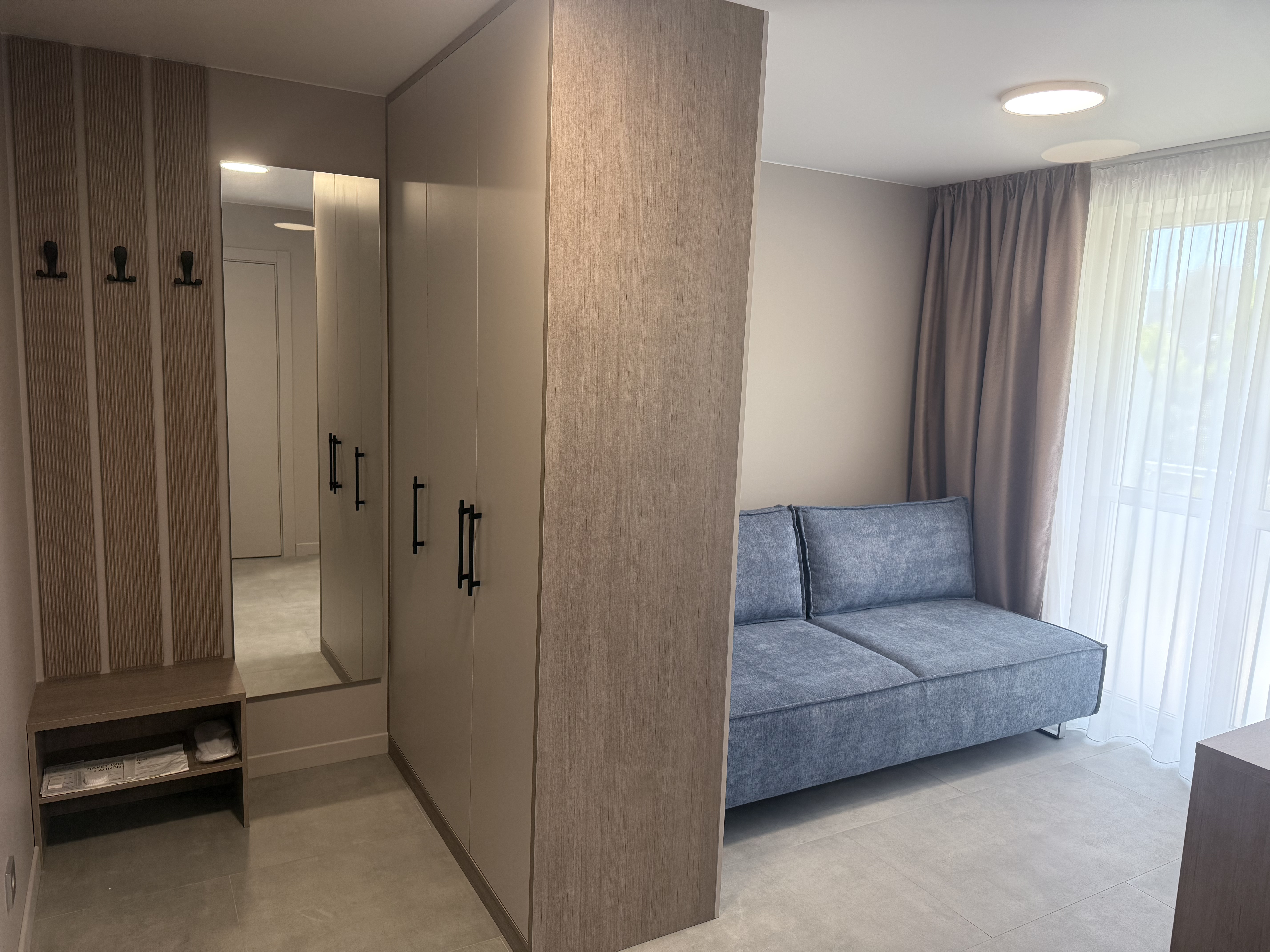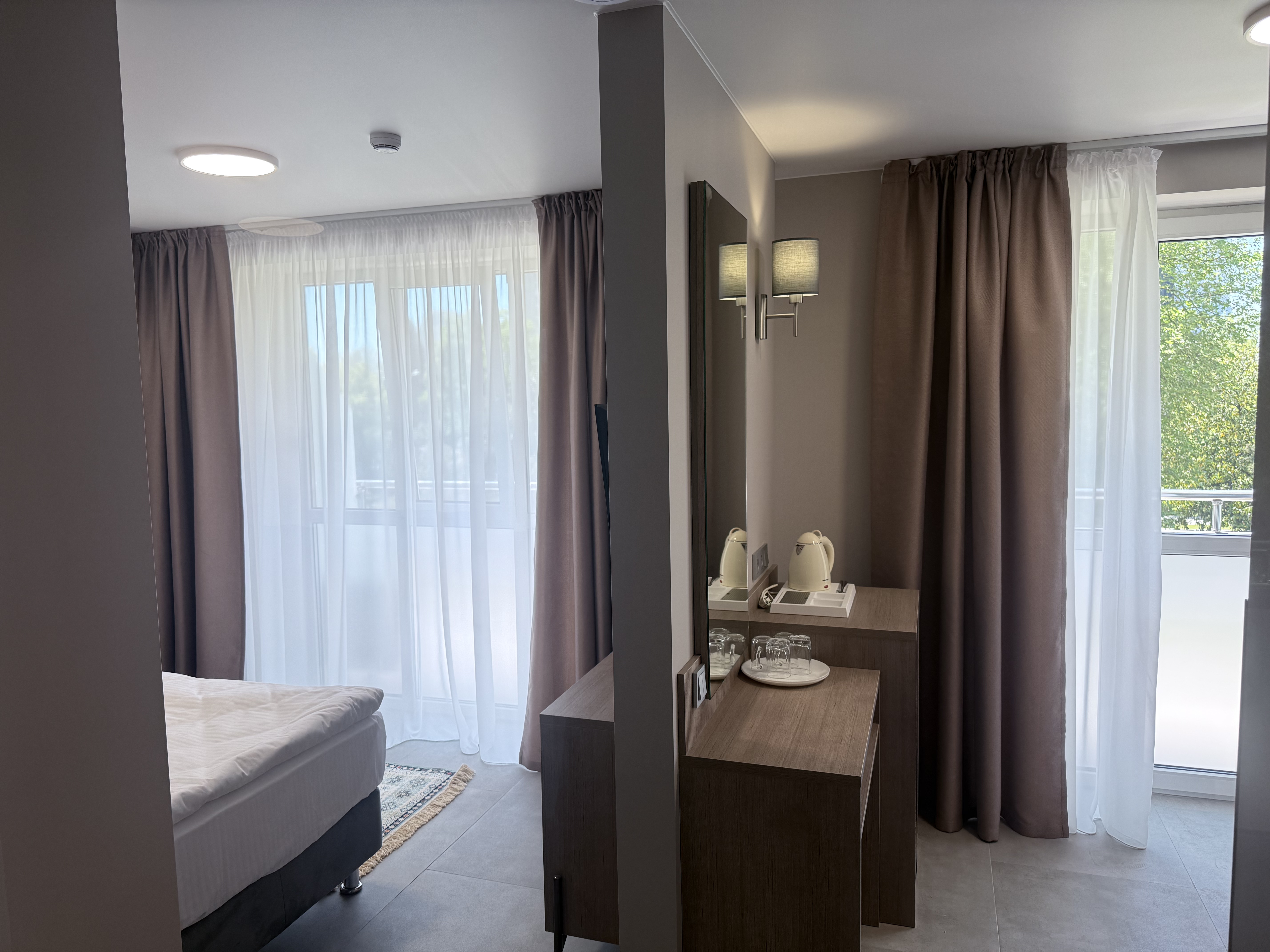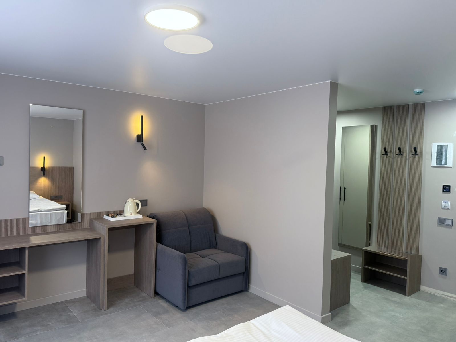 В номере: диван раскладной, зеркало, кровать двуспальная, прикроватные тумбочки, стол, шкаф, кондиционер, мини-холодильник, телевизор, телефон, электрочайник