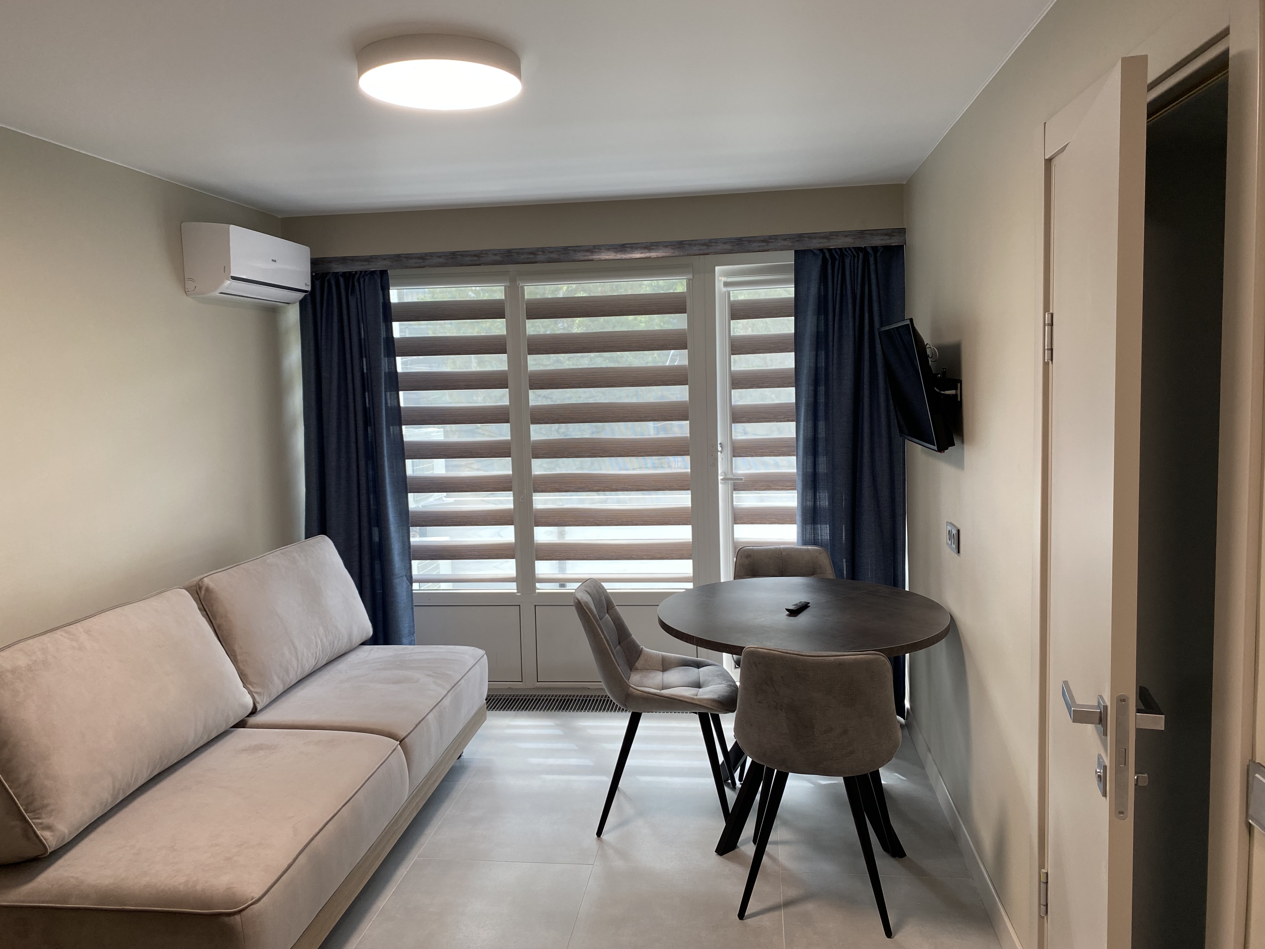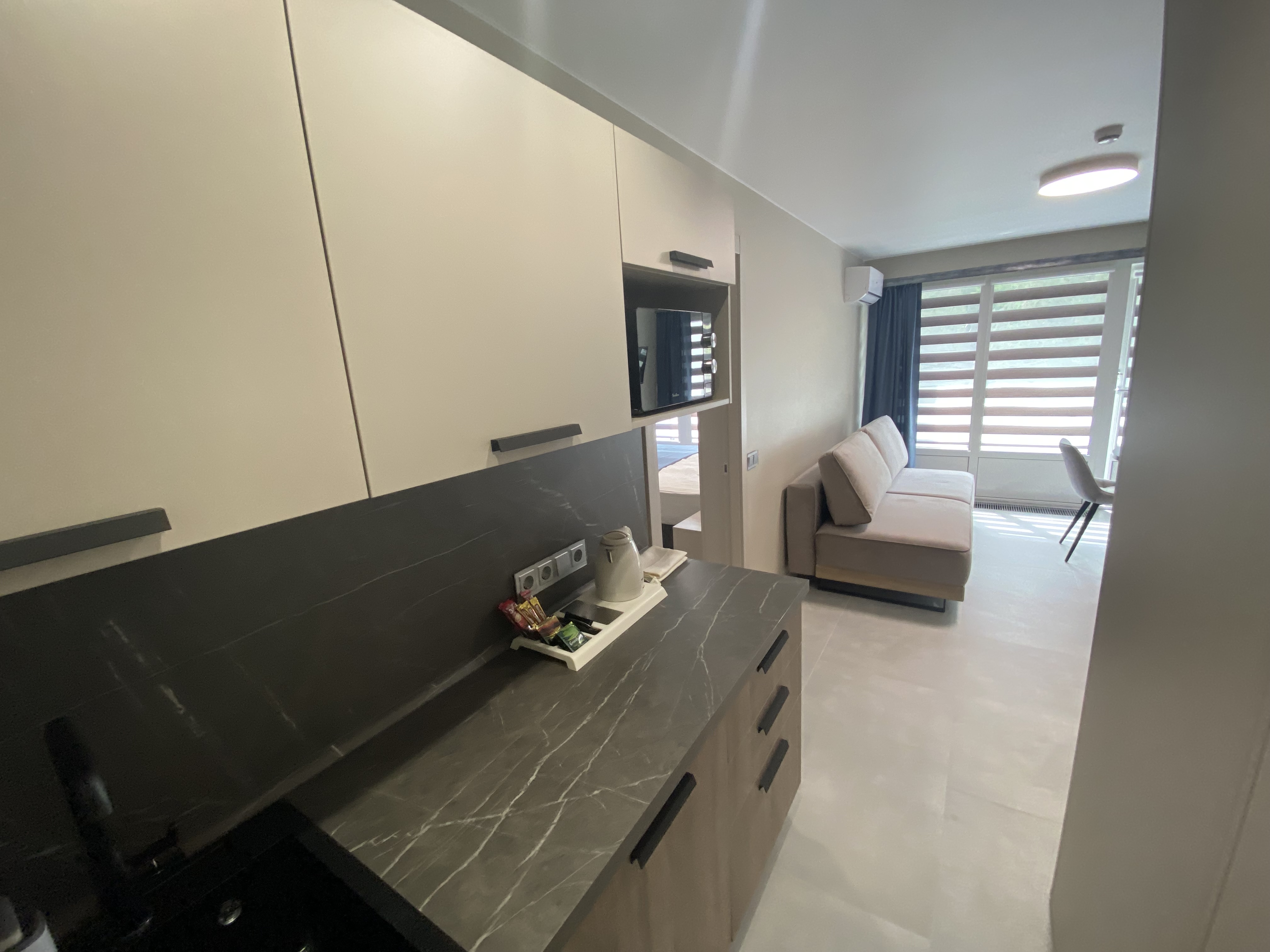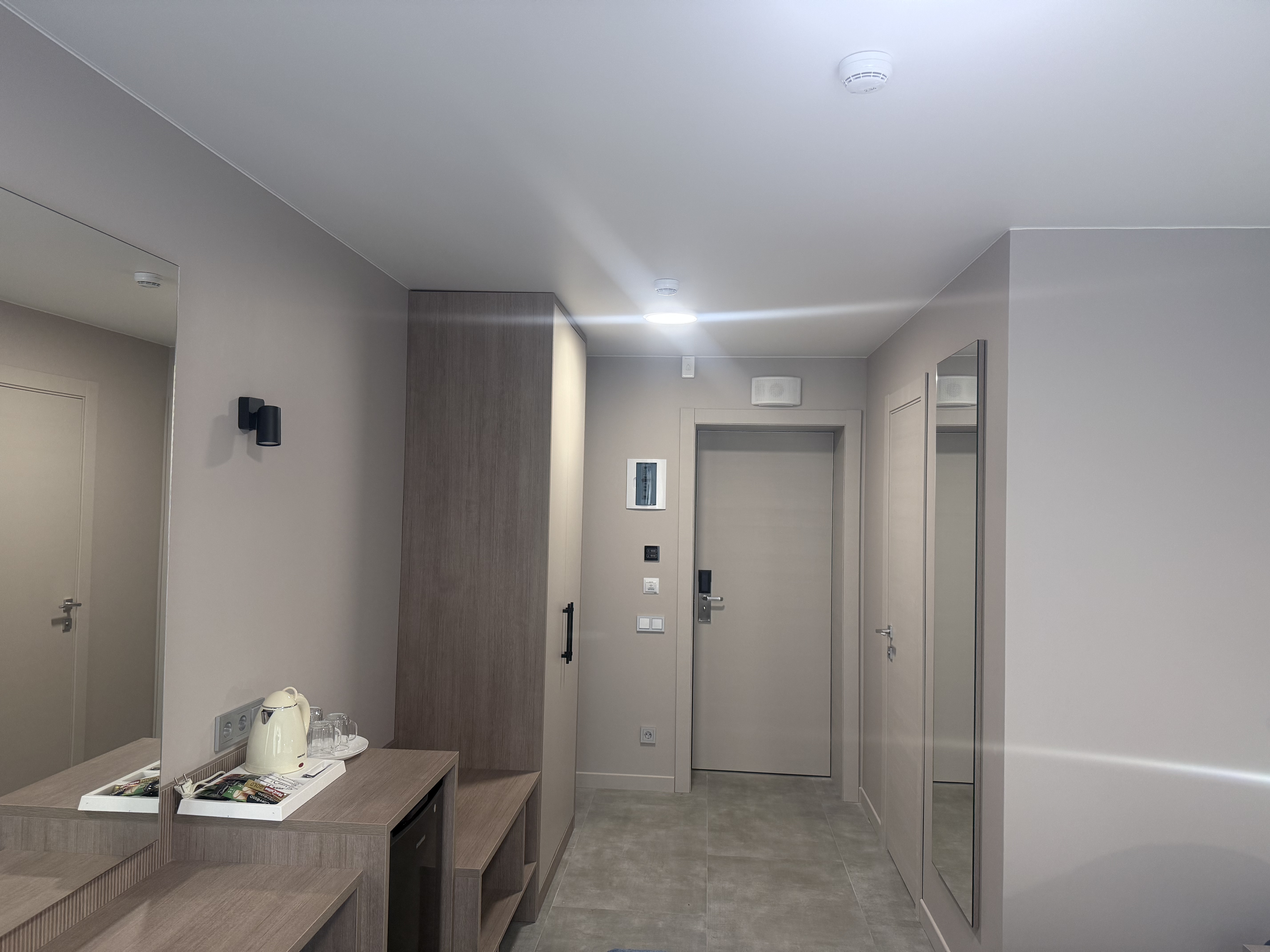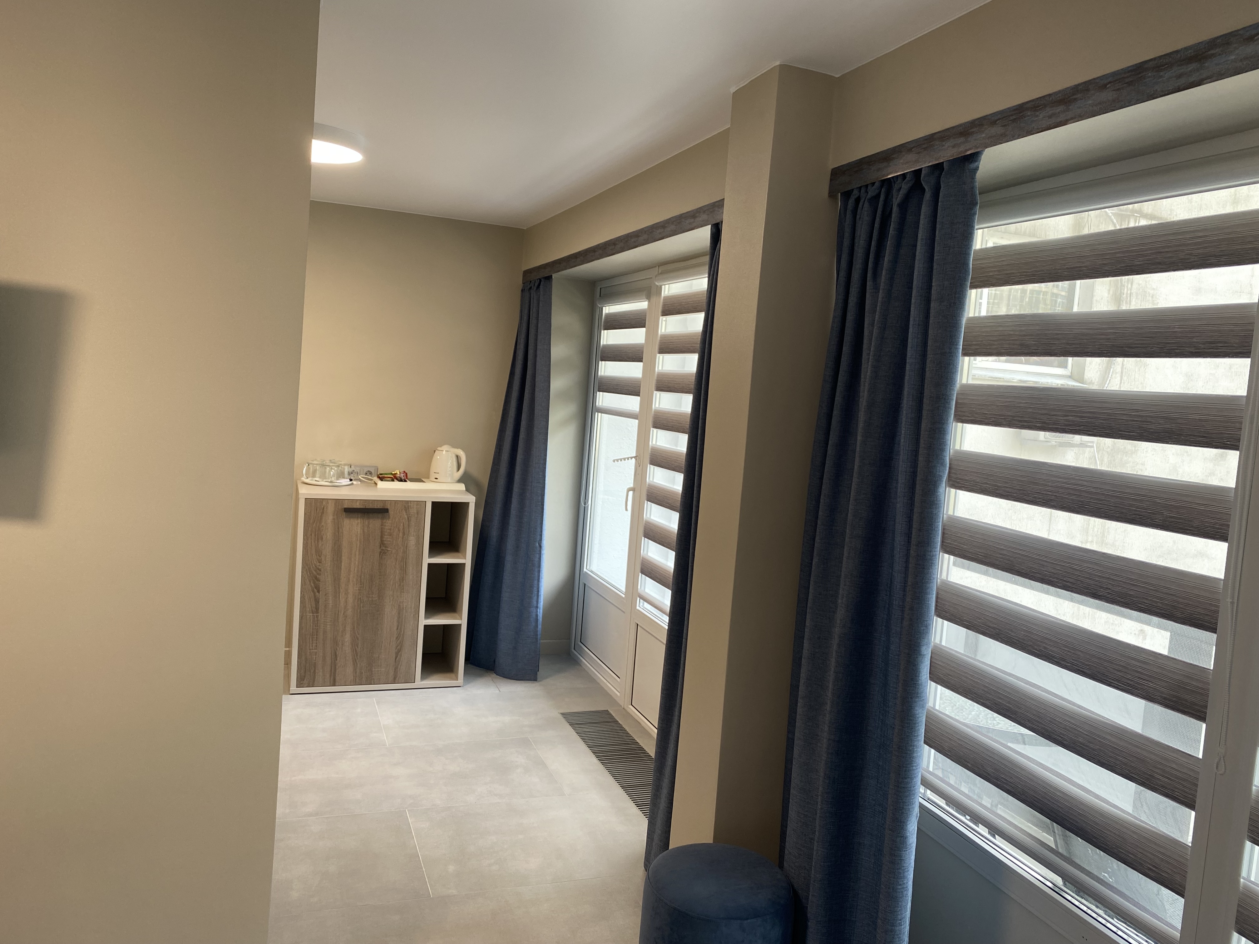 В номере: диван раскладной, зеркало, кровать двуспальная, прикроватные тумбочки, стол, шкаф, кондиционер, мини-холодильник, телевизор, телефон, электрочайник