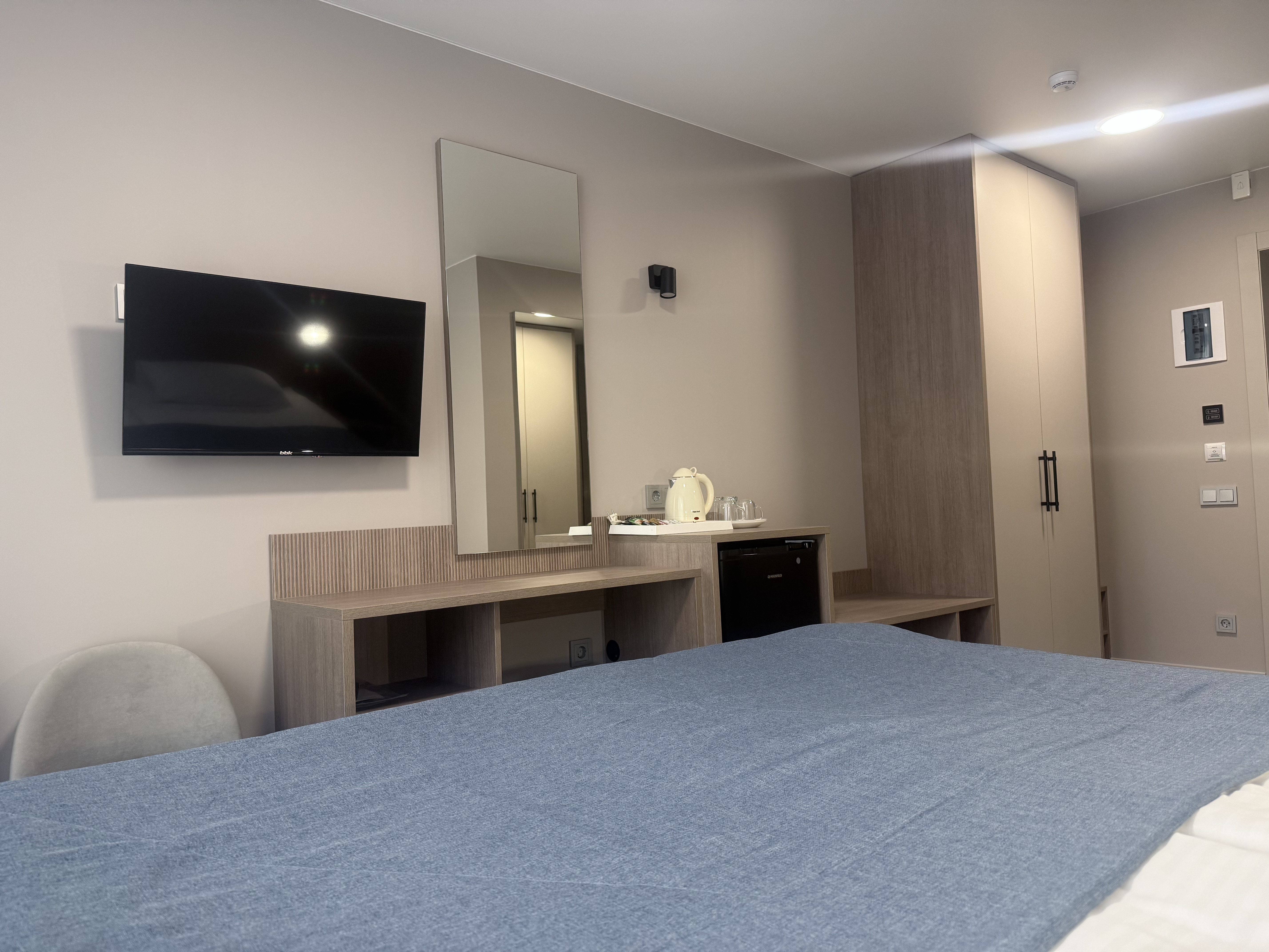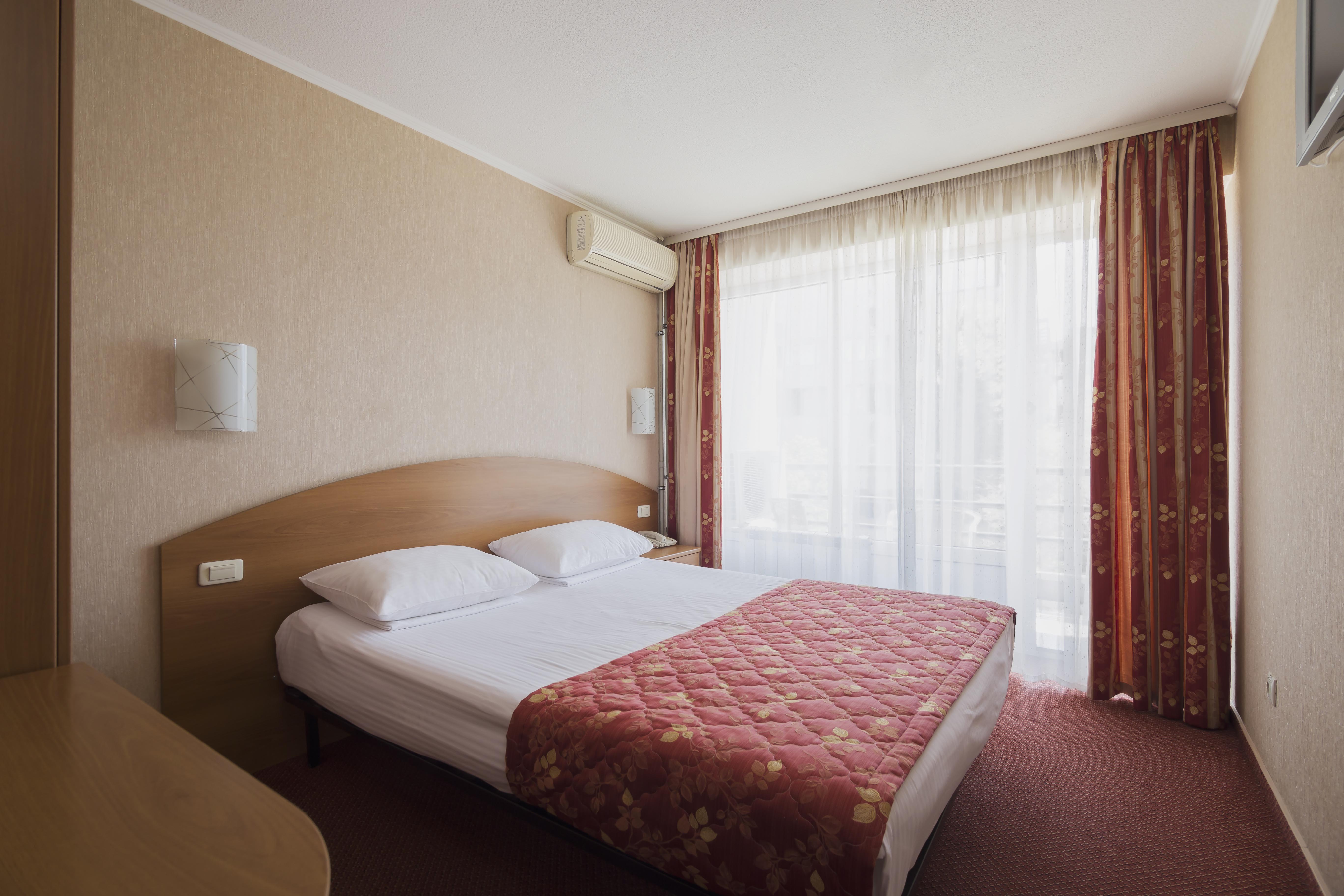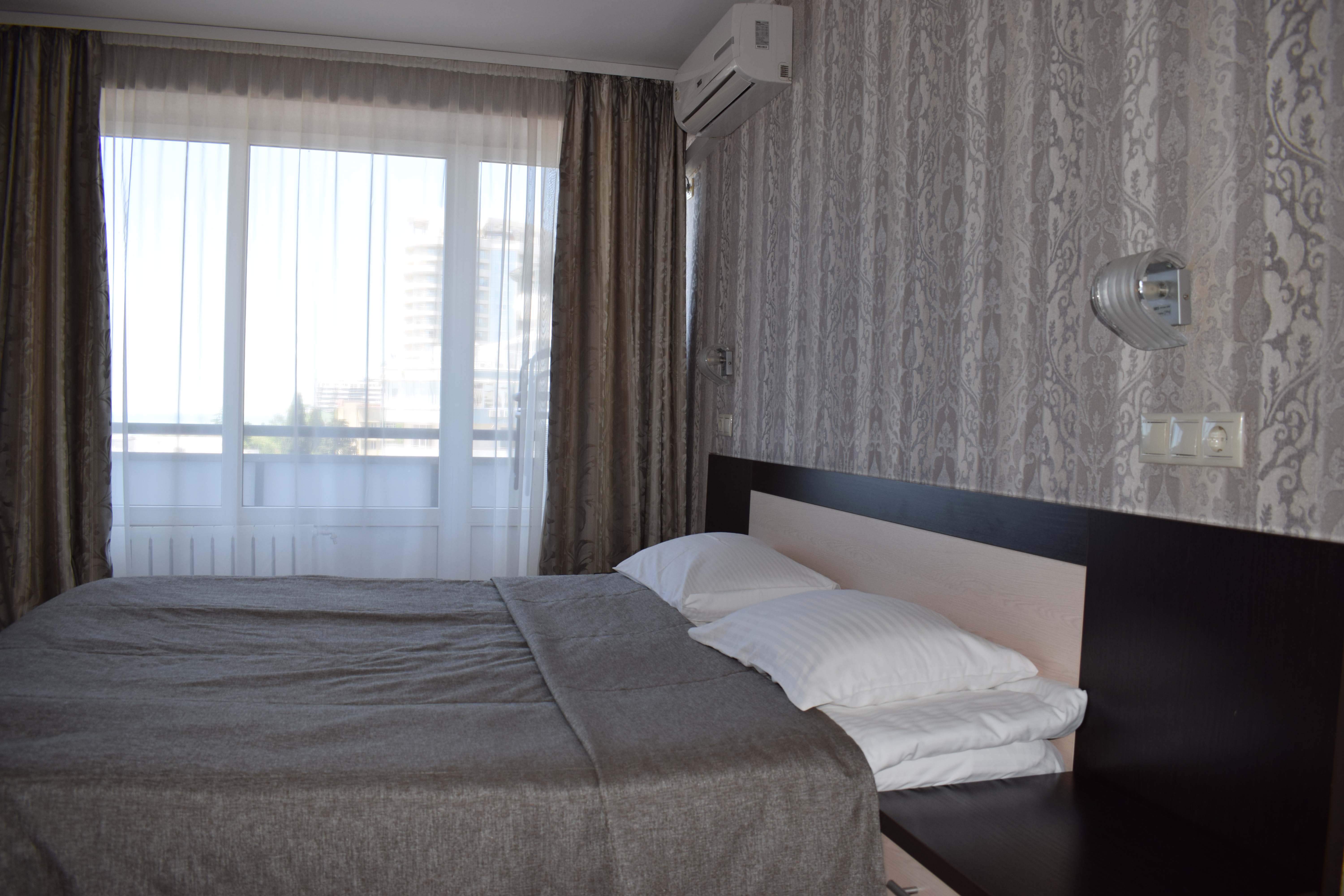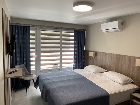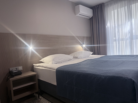 В номере: зеркало, кровать двуспальная, прикроватные тумбочки, стол, шкаф, кондиционер, мини-холодильник, телевизор, телефон