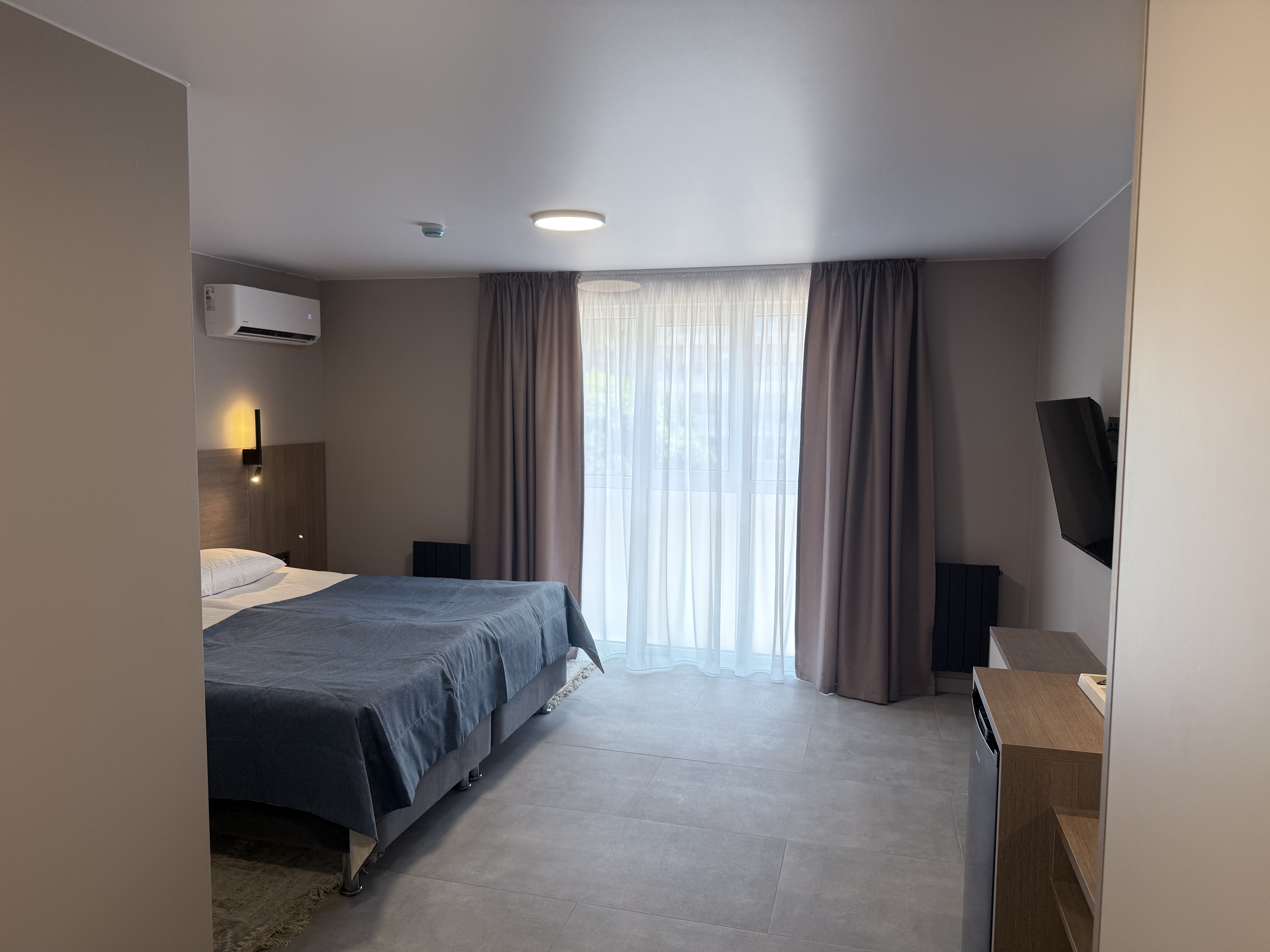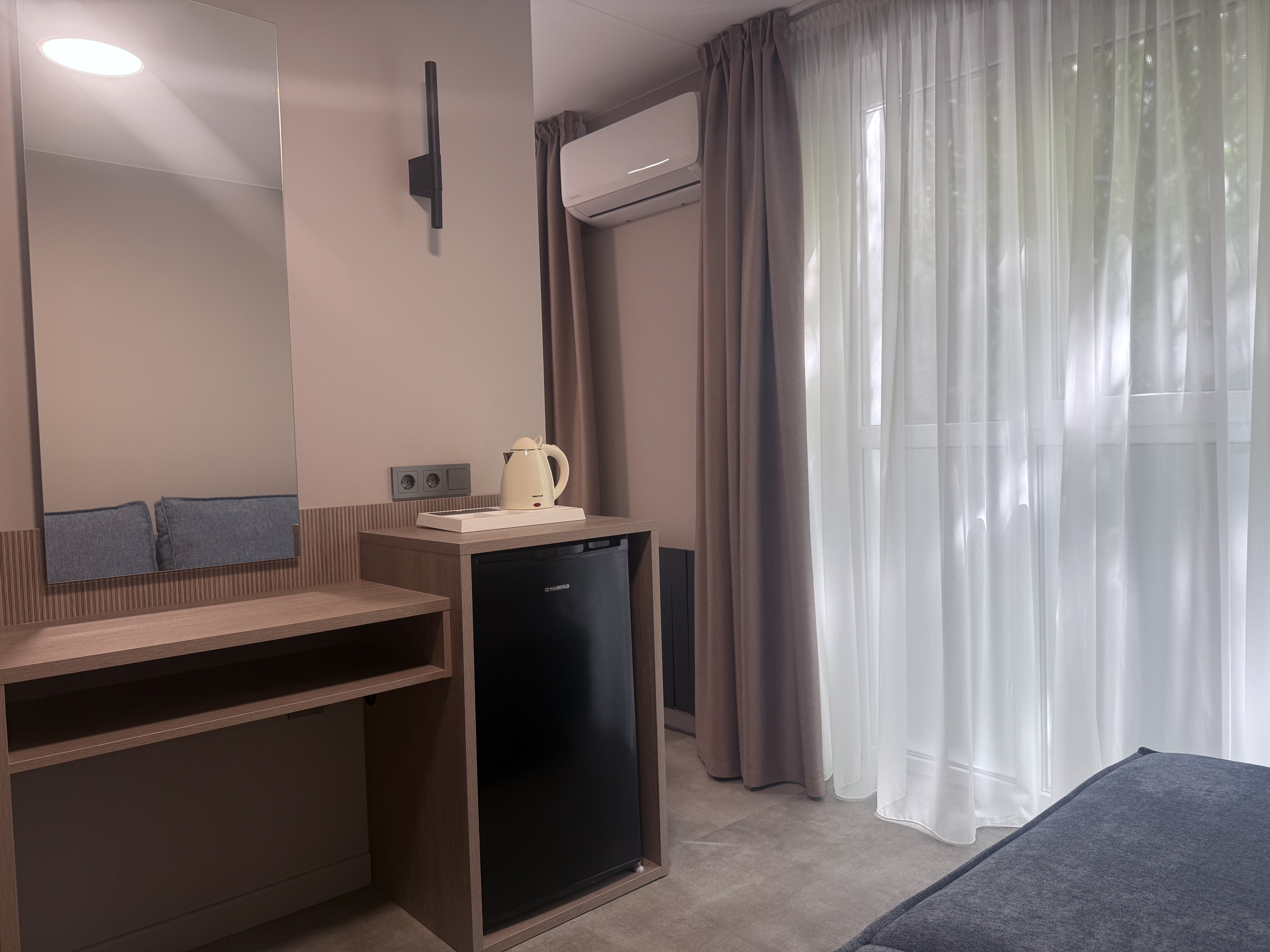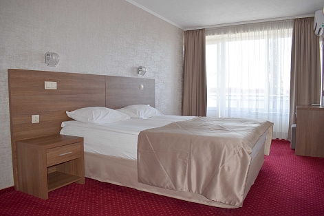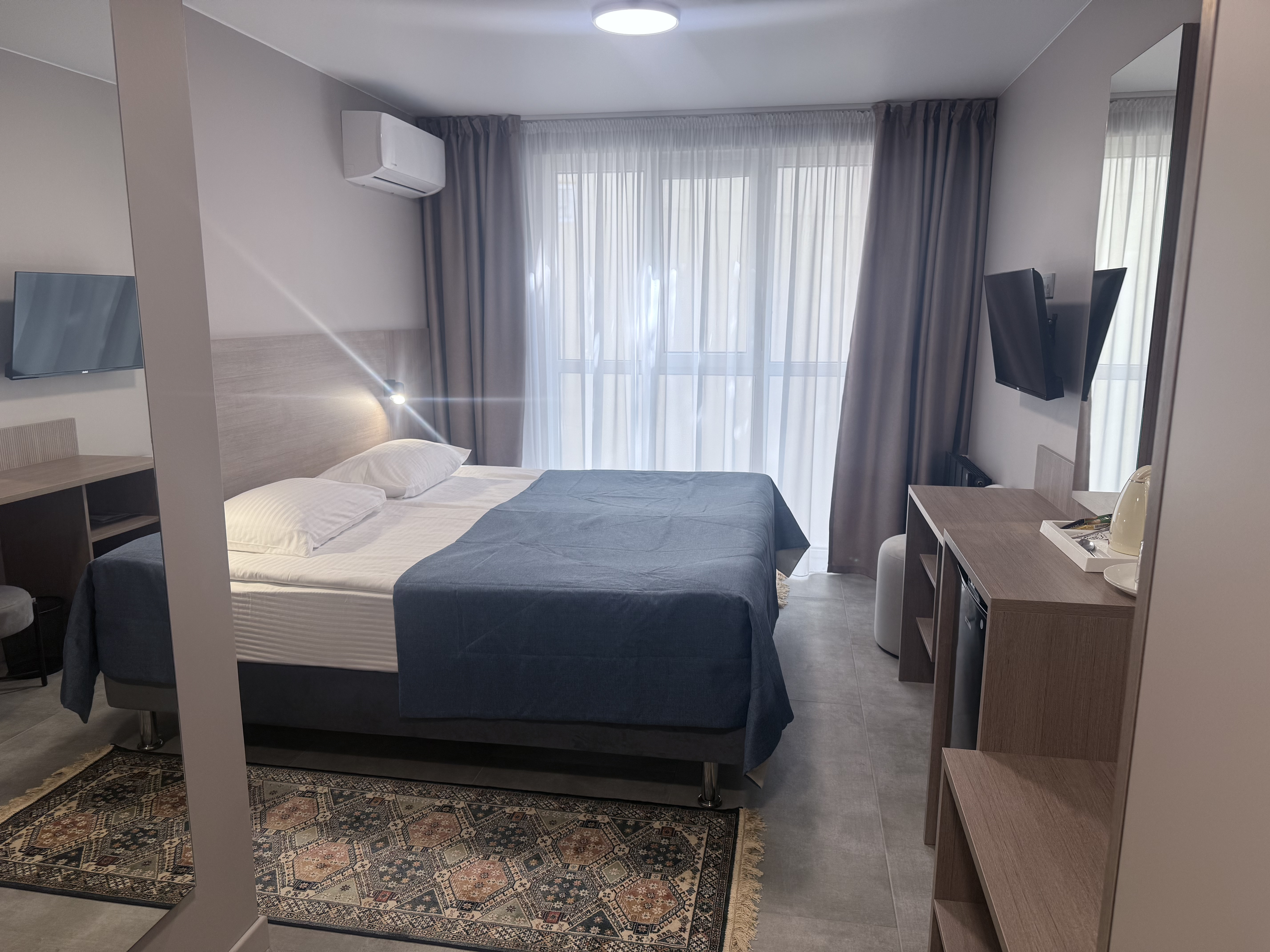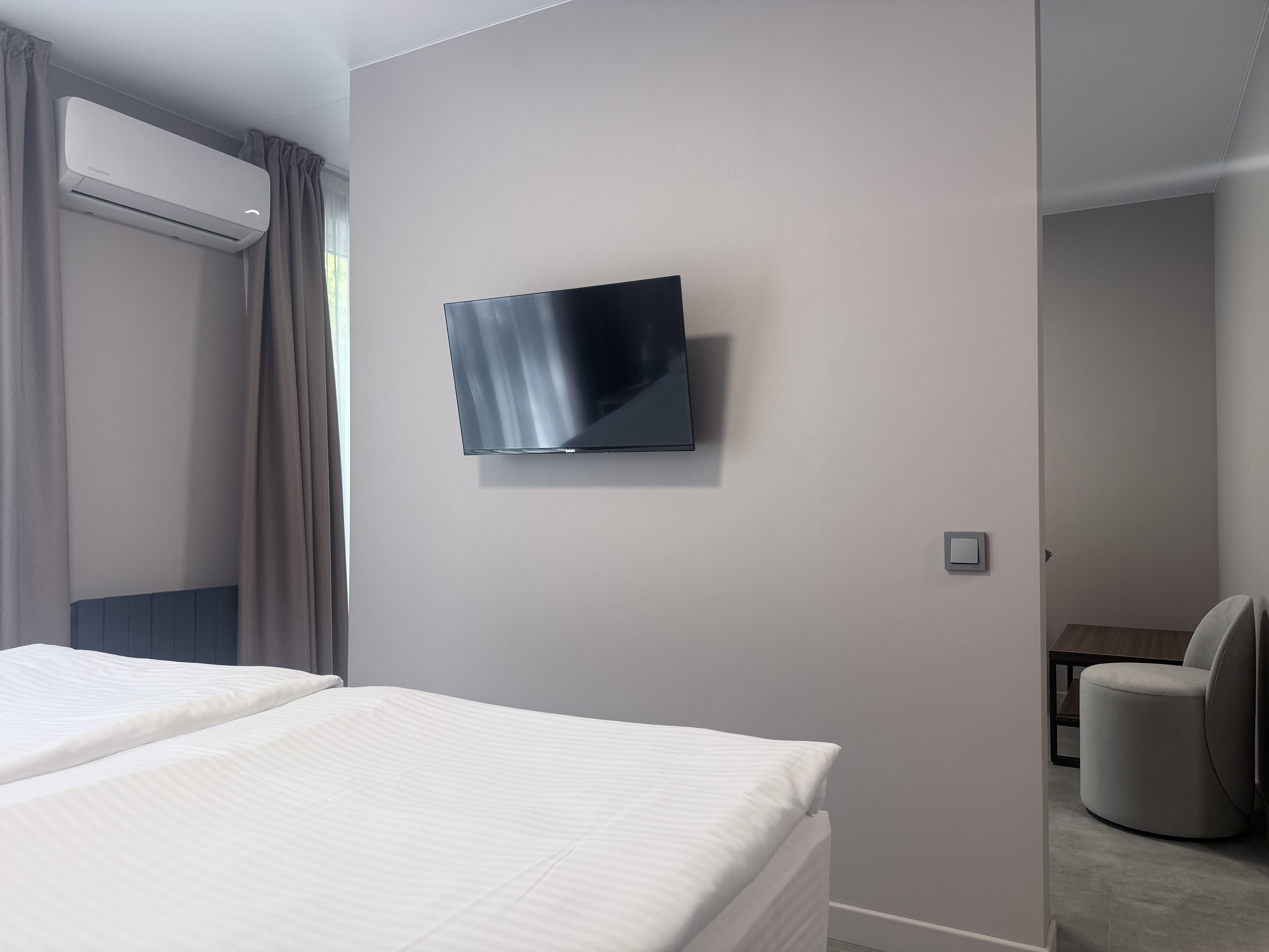 В номере: зеркало, кровать двуспальная, прикроватные тумбочки, стол, шкаф, кондиционер, мини-холодильник, телевизор, телефон