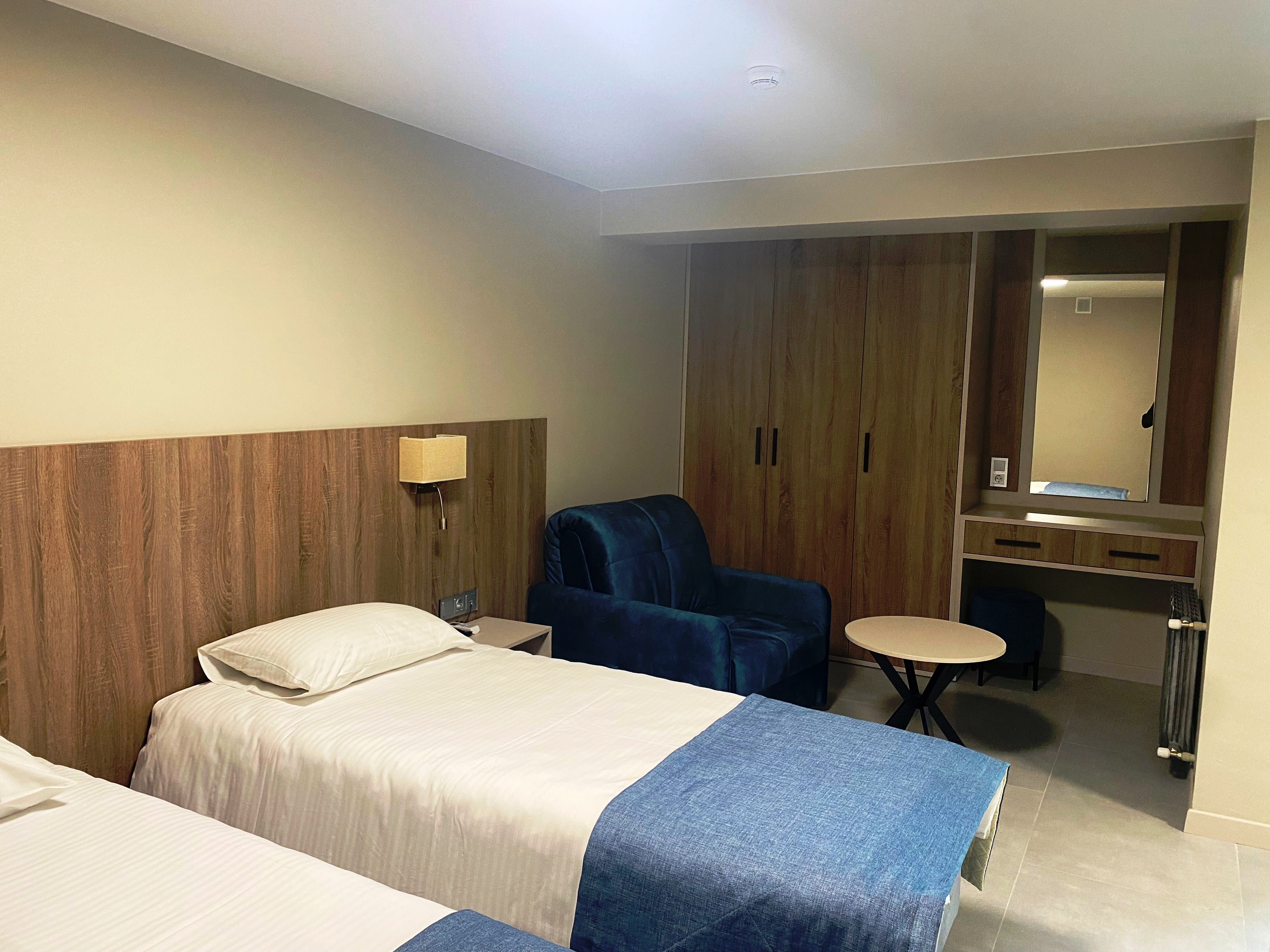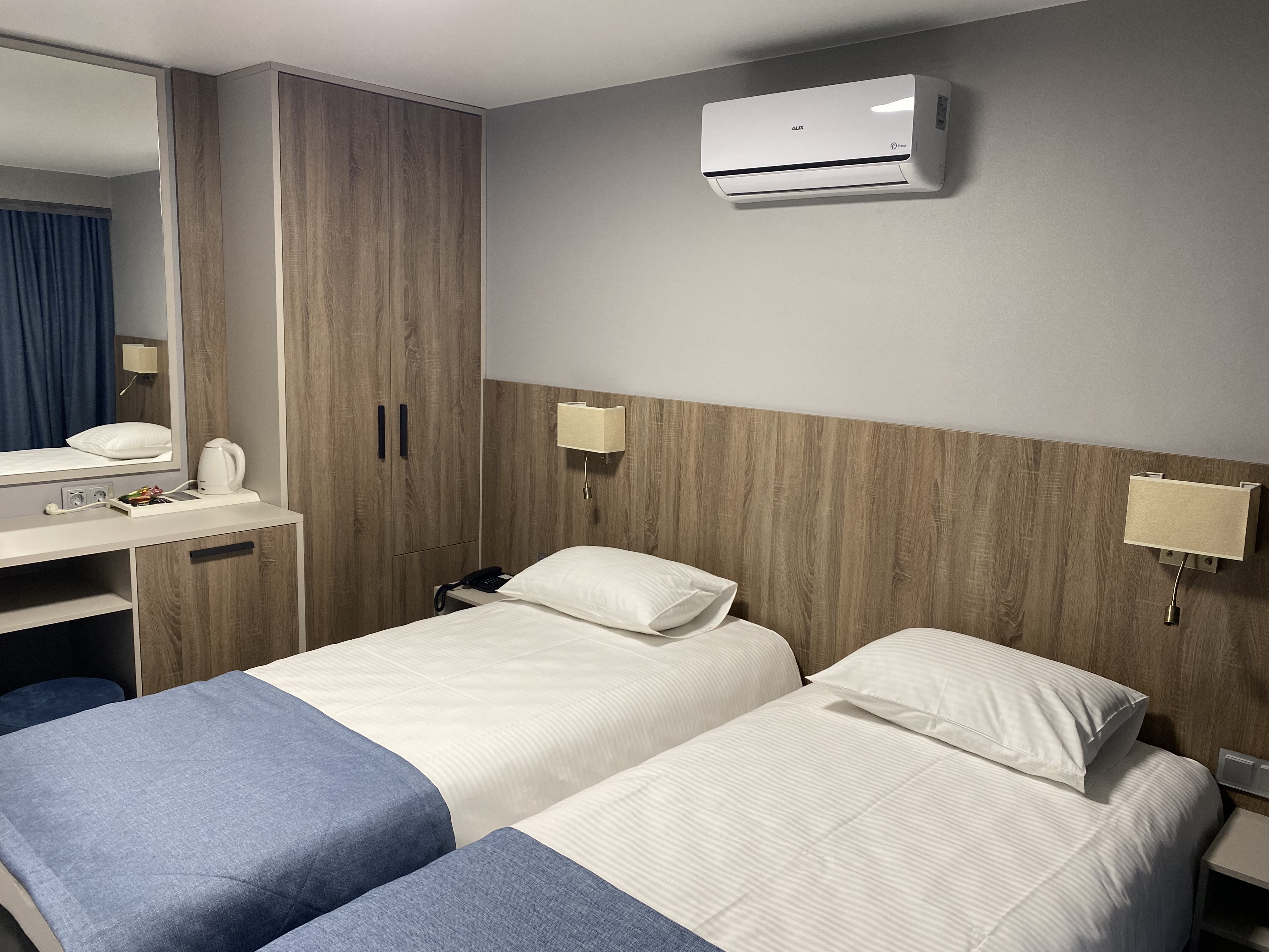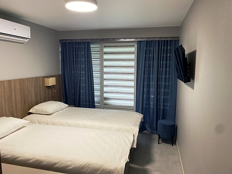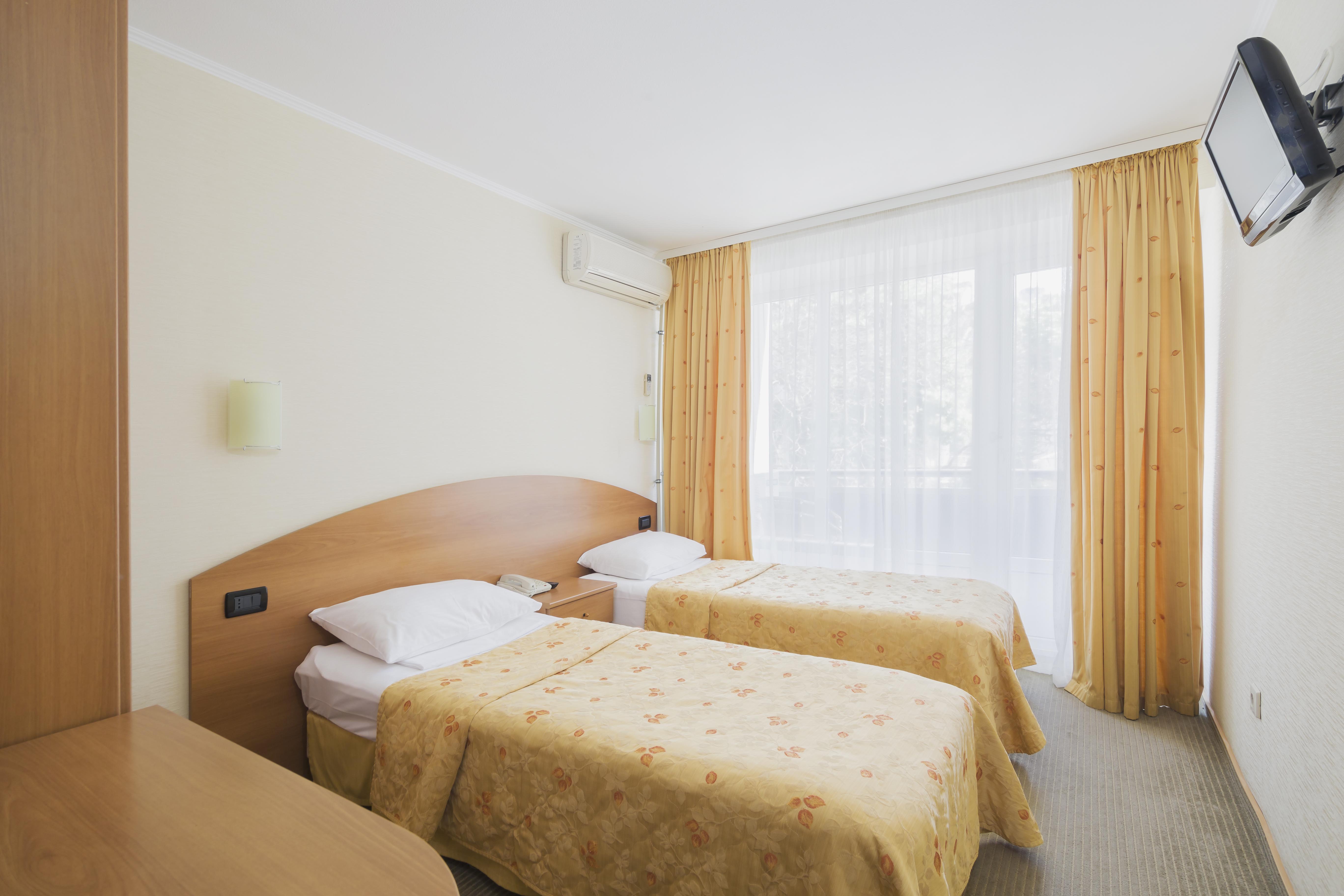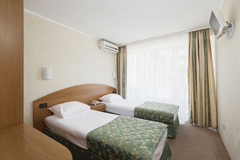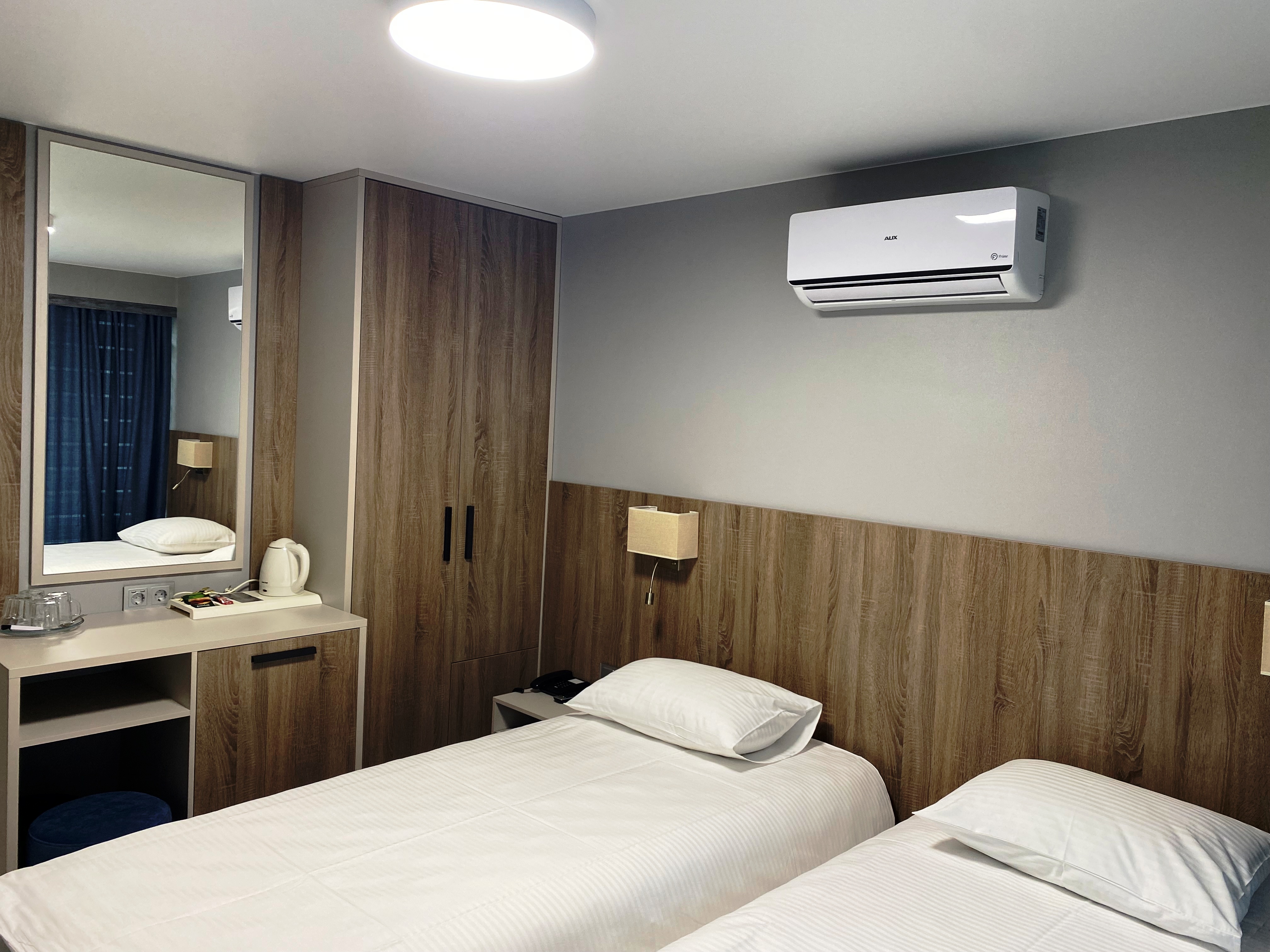 В номере: зеркало, кровати односпальные, прикроватные тумбочки, стол, шкаф, кондиционер, мини-холодильник, телевизор, телефон