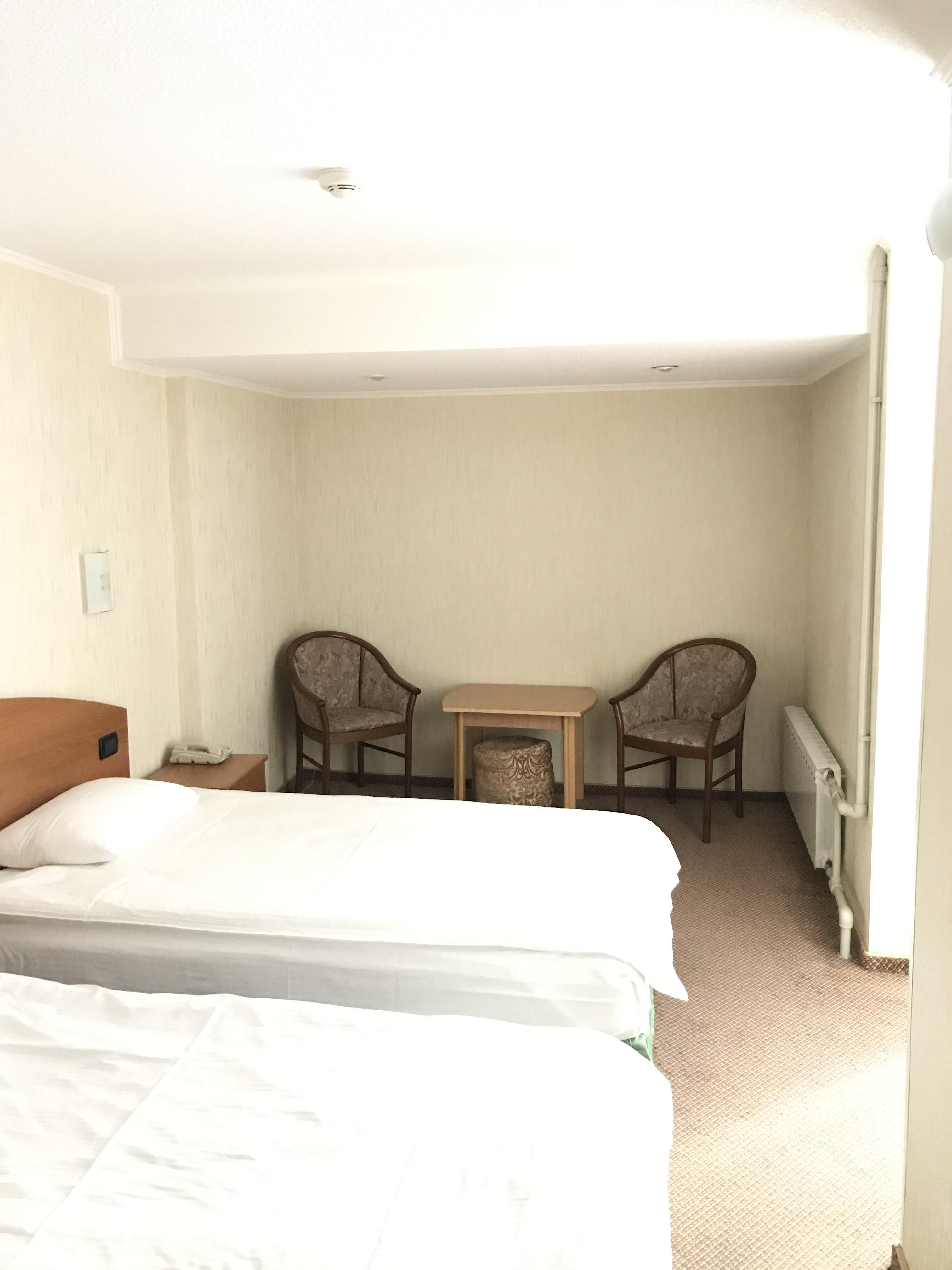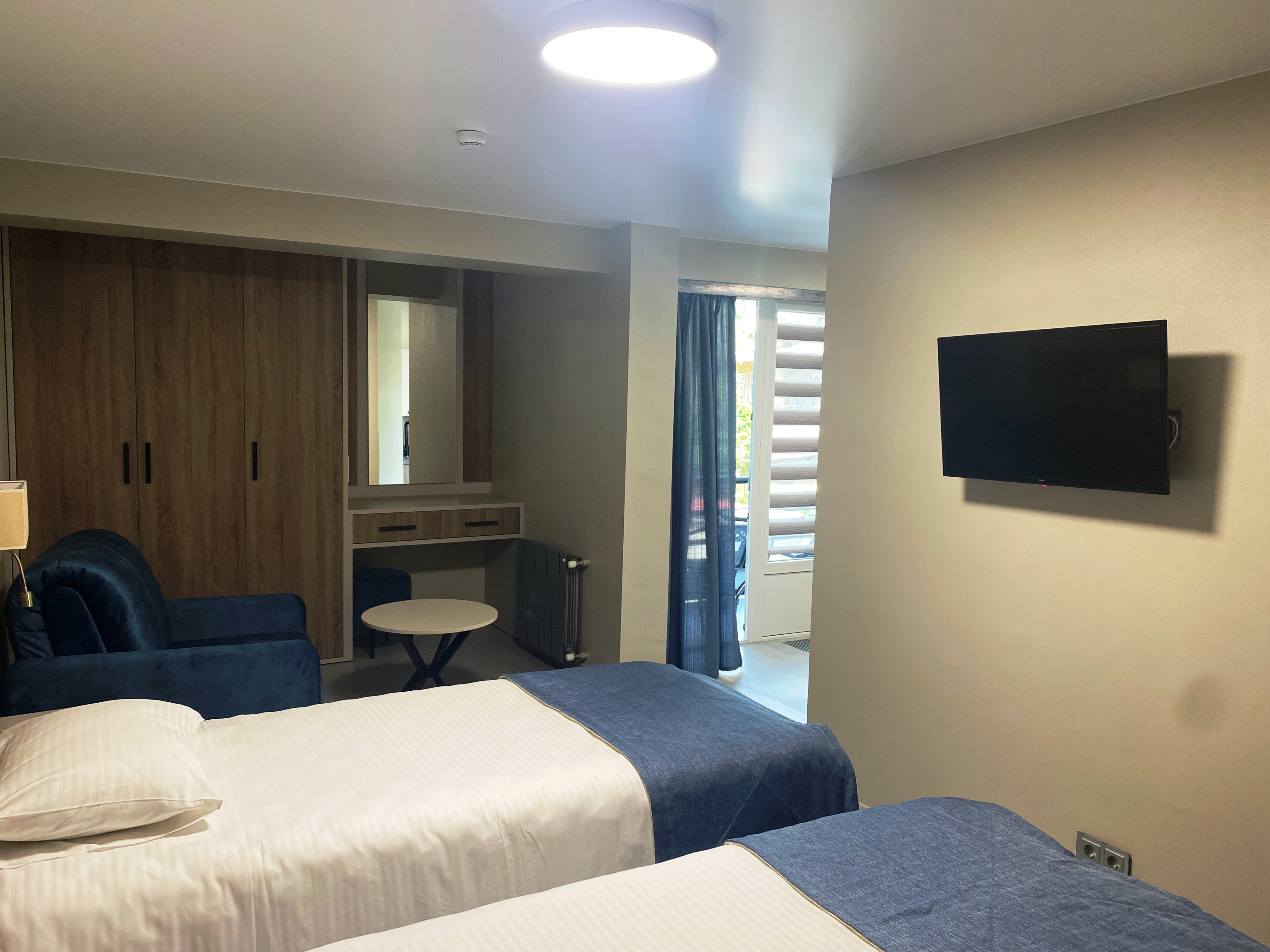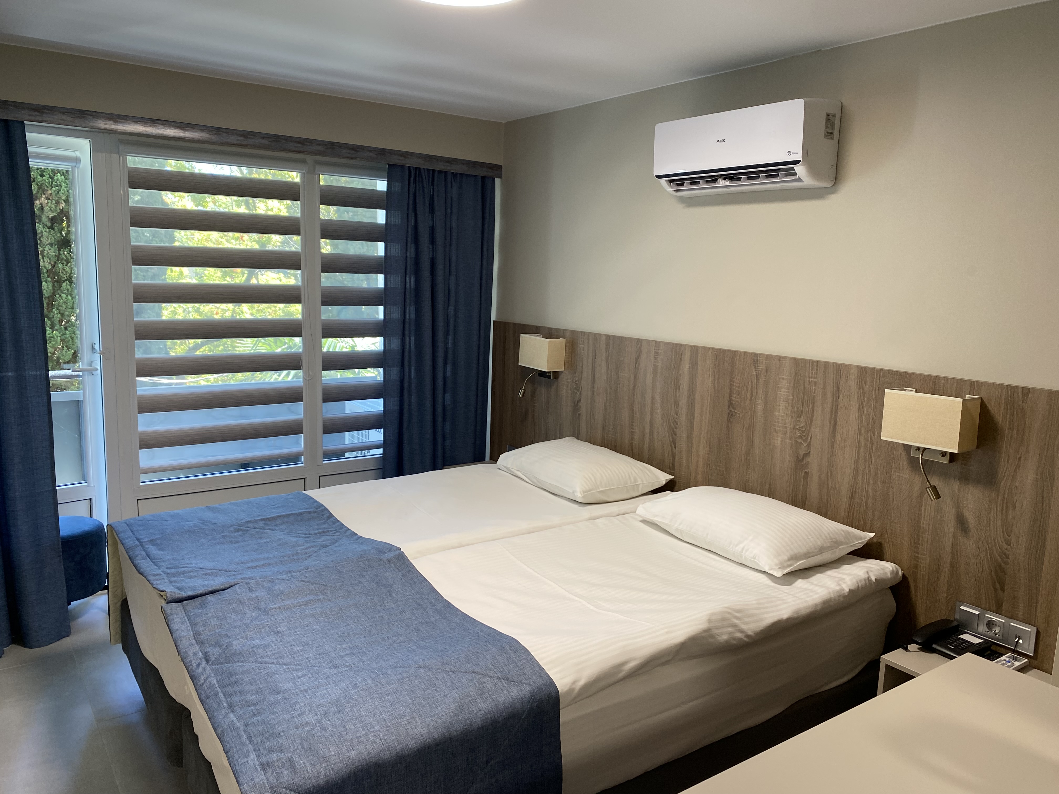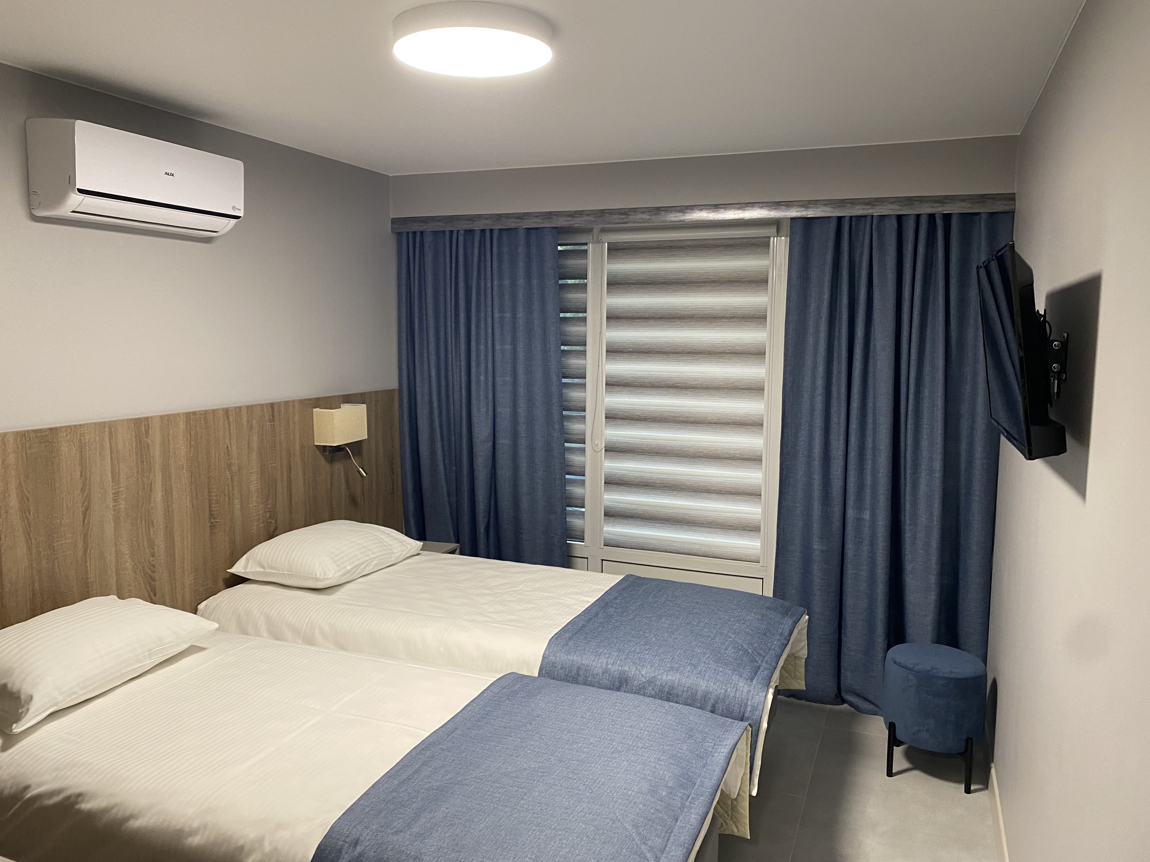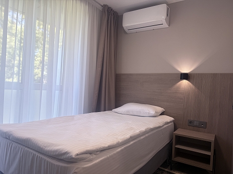 В номере: зеркало, кровати односпальные, прикроватные тумбочки, стол, шкаф, кондиционер, мини-холодильник, телевизор, телефон