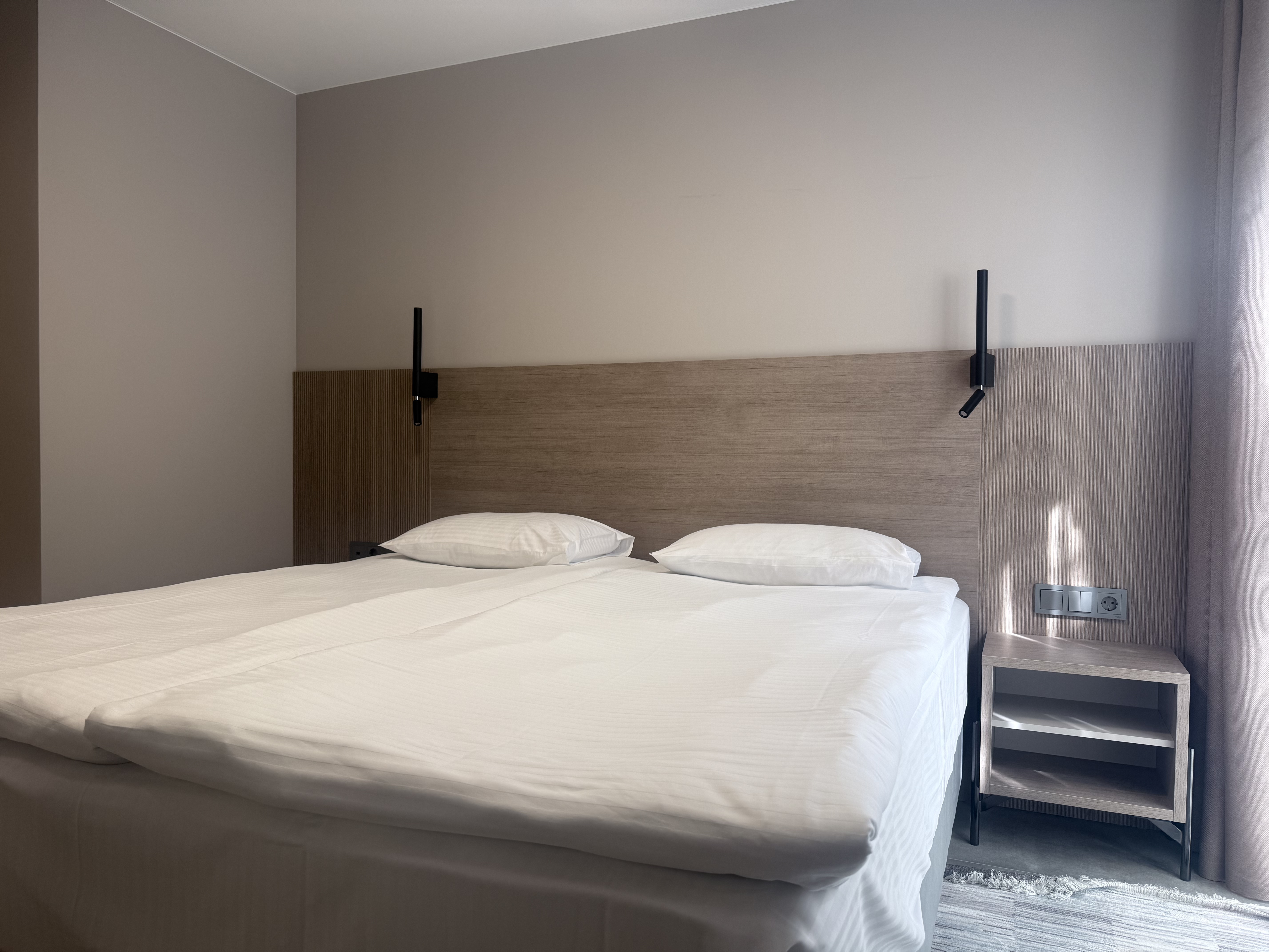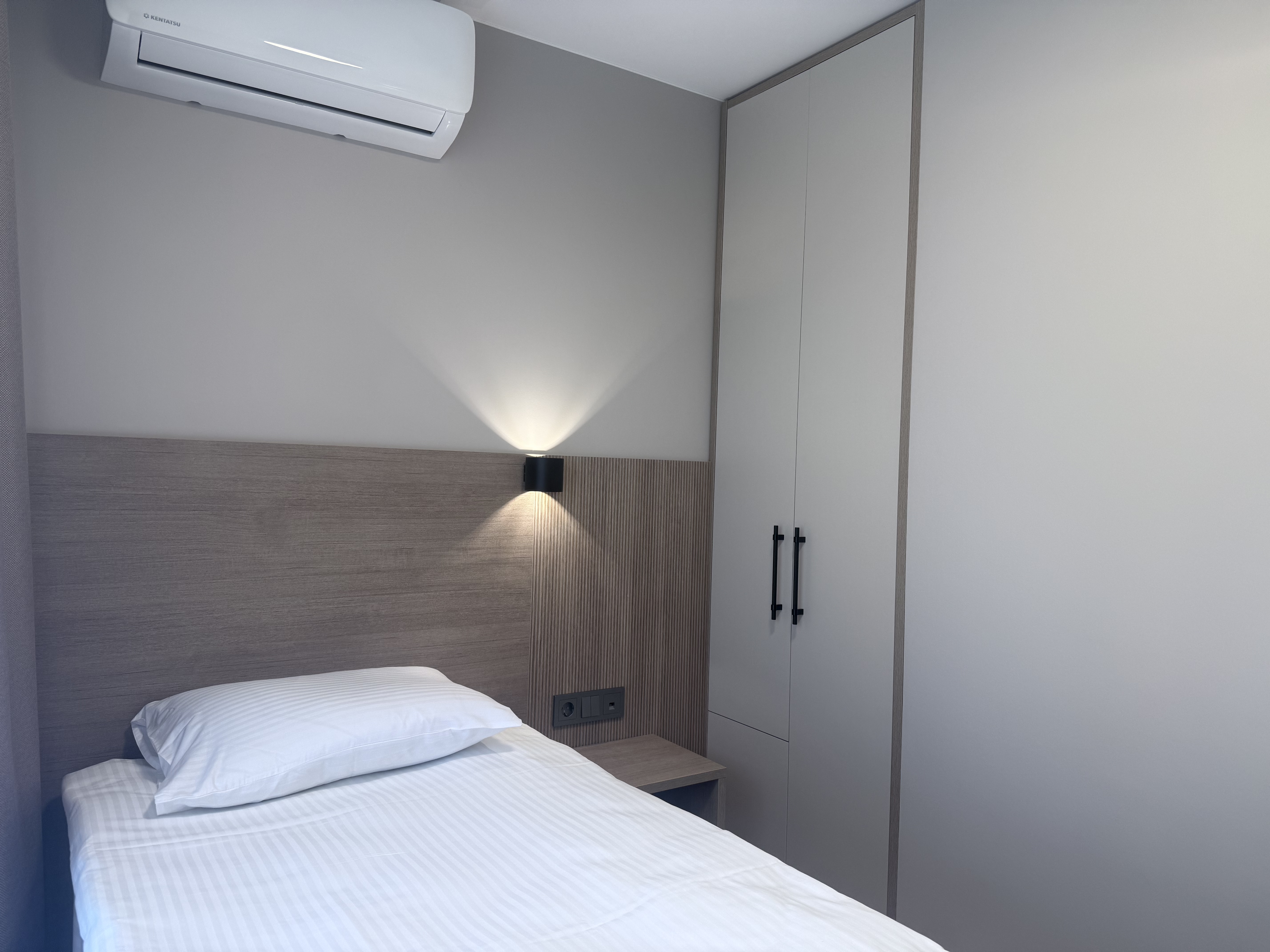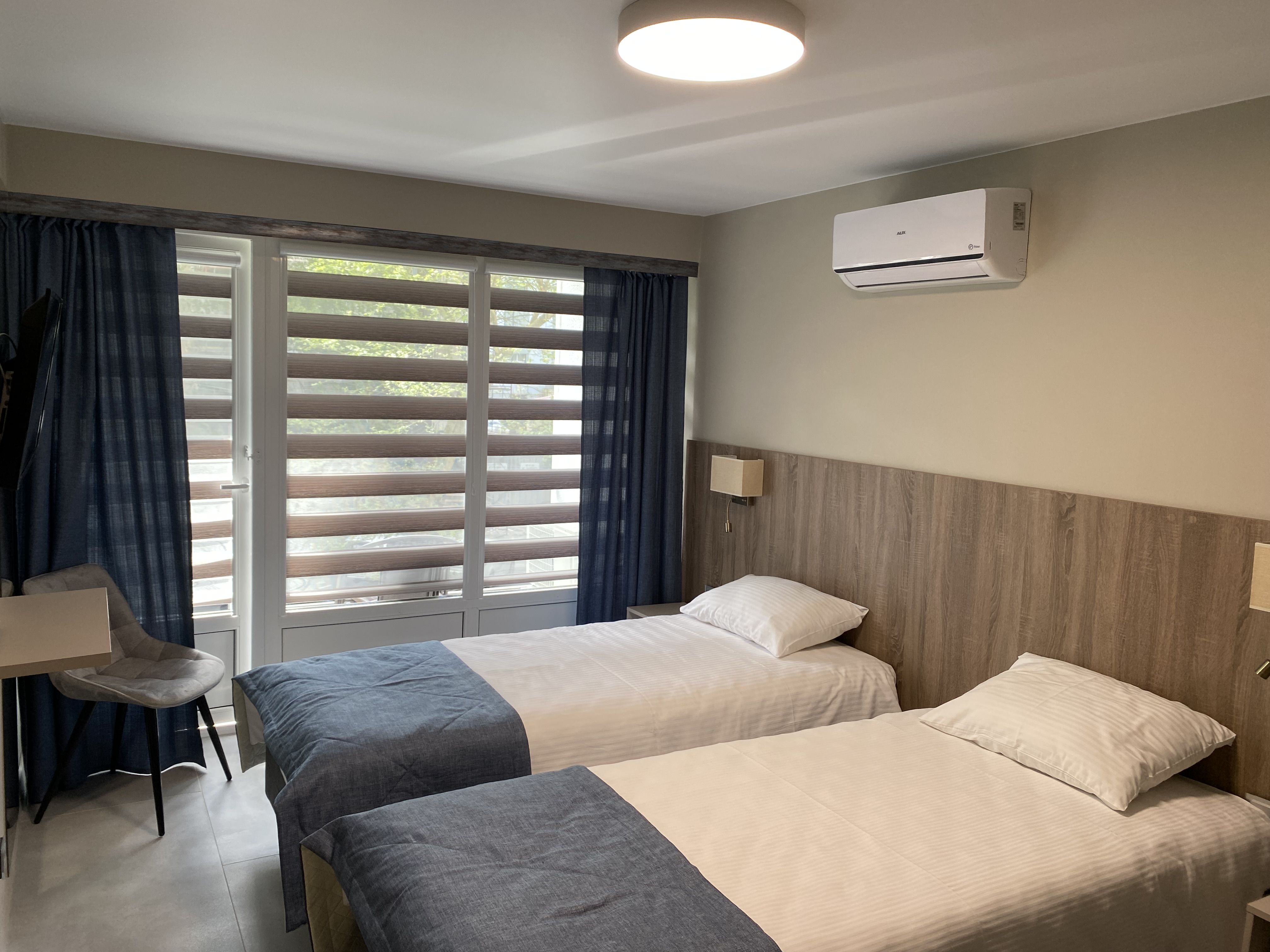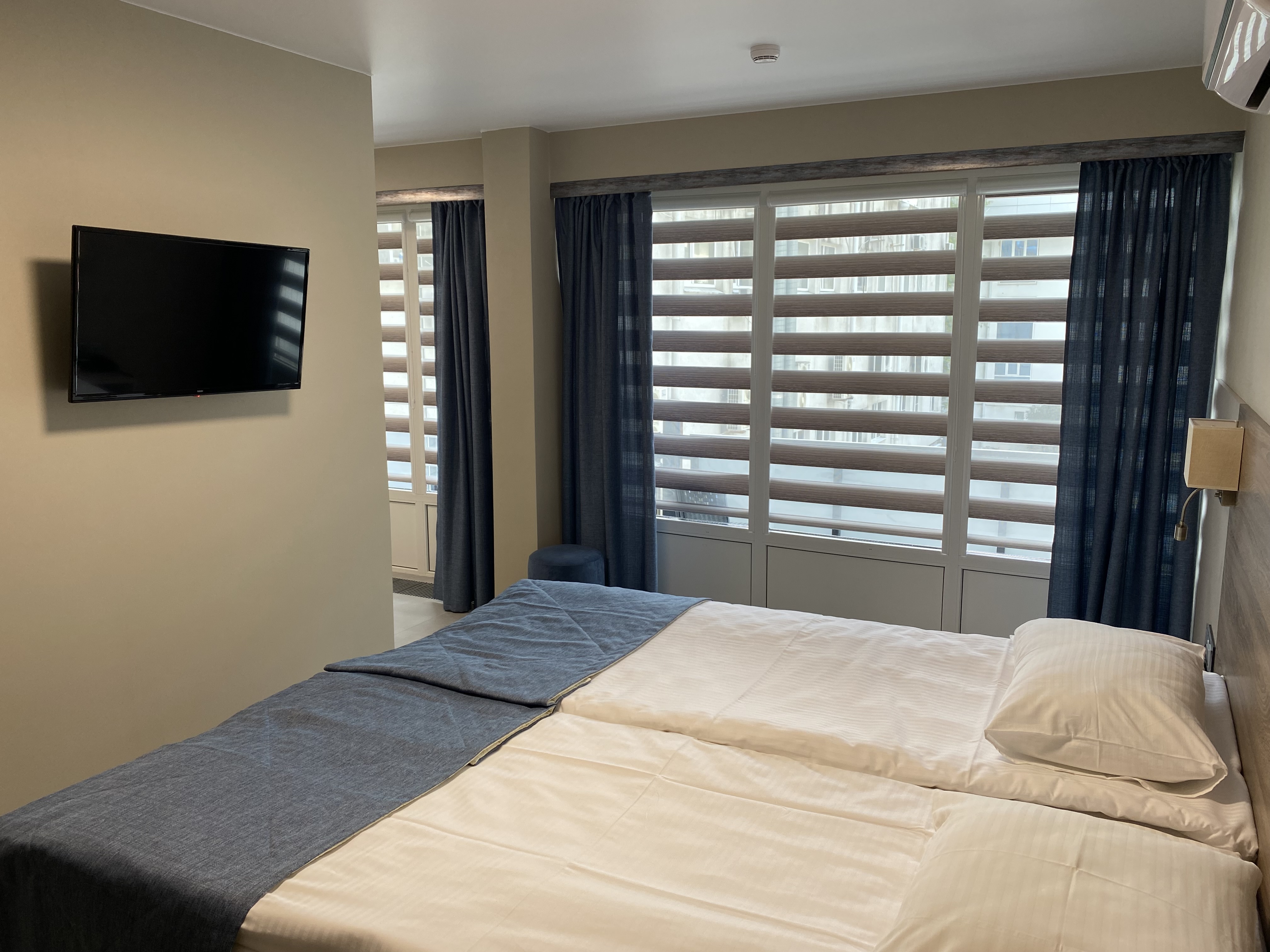 В номере: зеркало, кровати односпальные, прикроватные тумбочки, стол, шкаф, кондиционер, мини-холодильник, телевизор, телефон