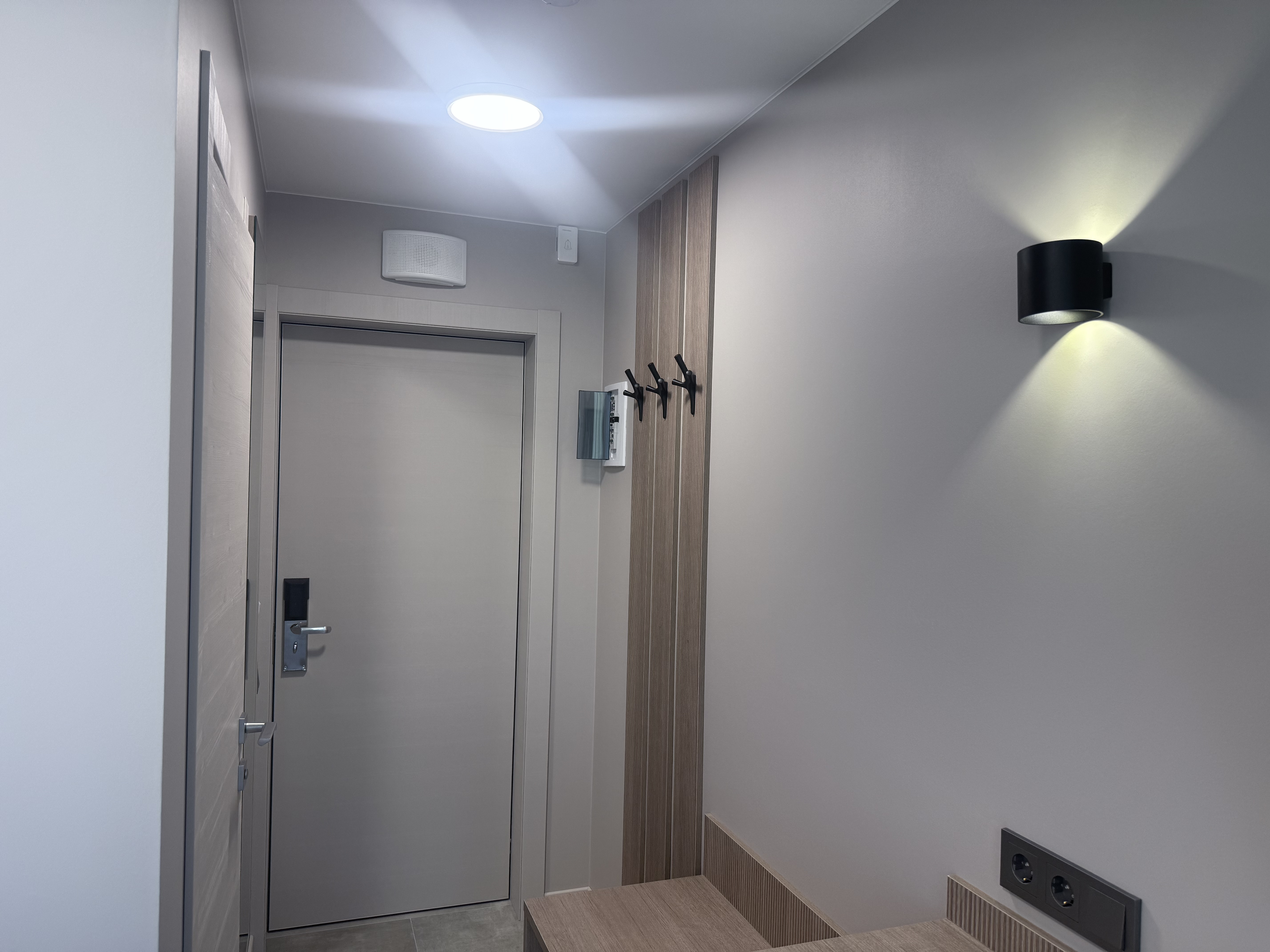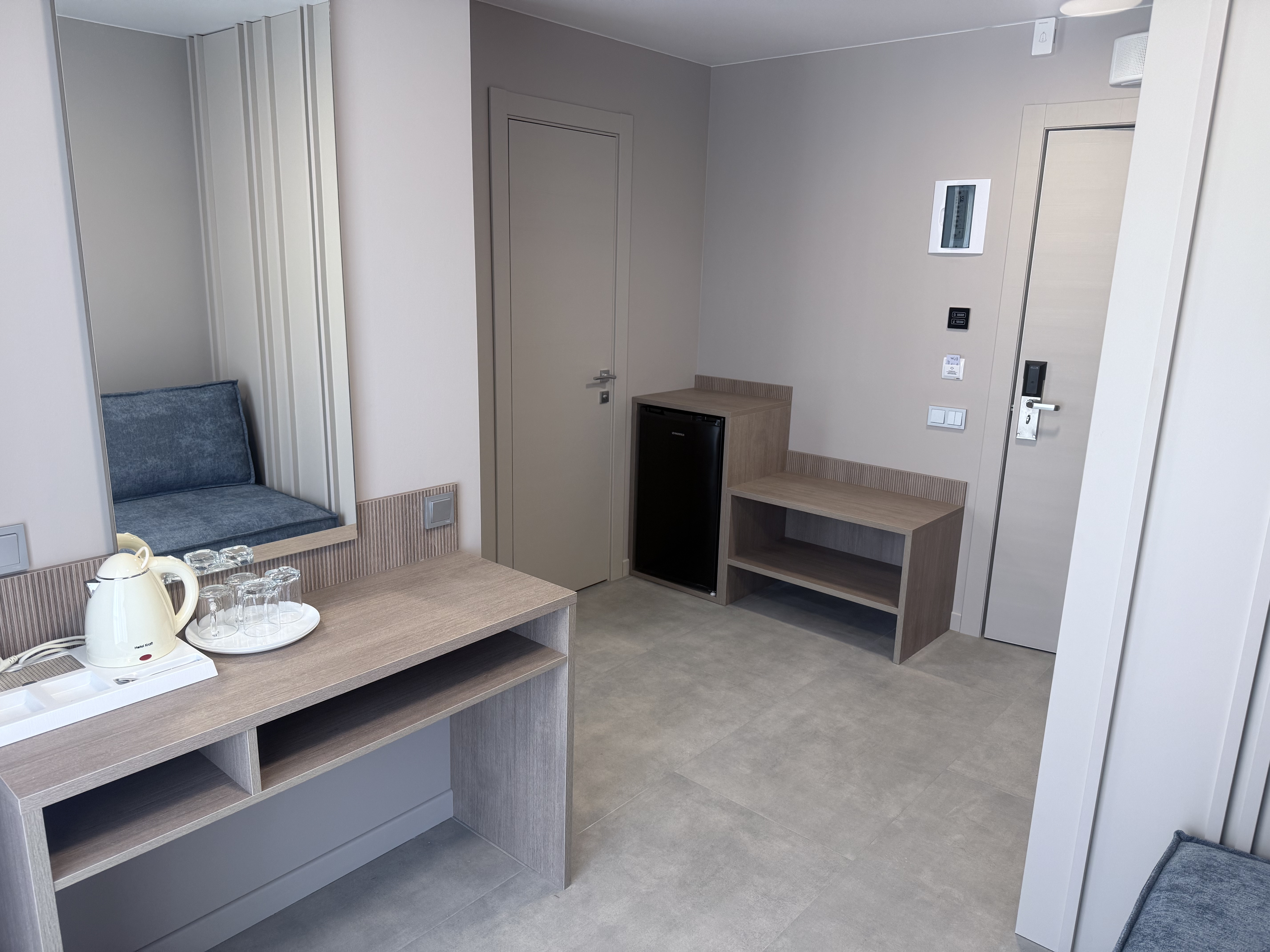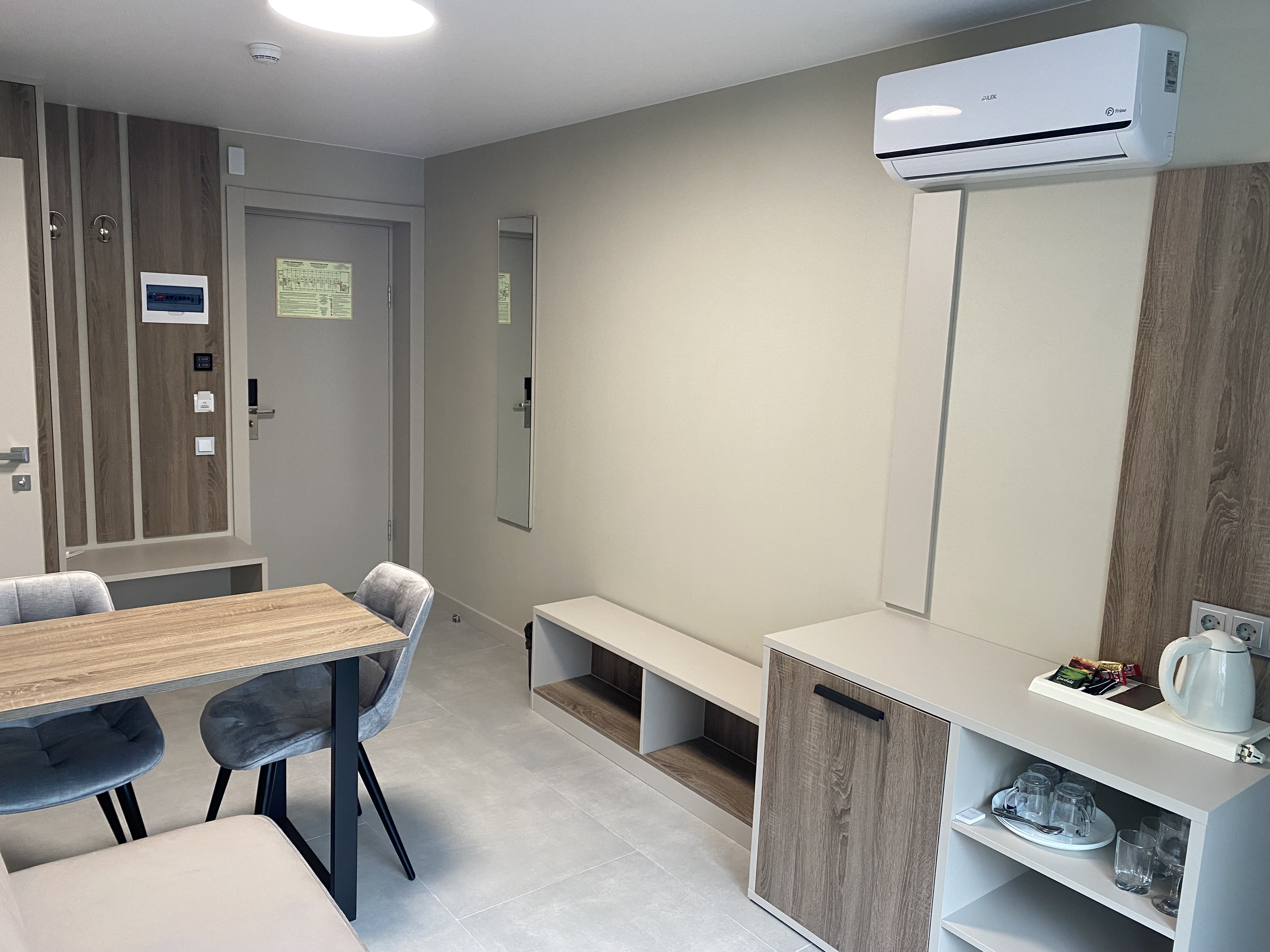 В номере: вешалка, диван раскладной, зеркало, кровать односпальная, прикроватная тумбочка, пуфик, стол, шкаф, кондиционер, сейф, телевизор ЖК, телефон, холодильник, чайная станция