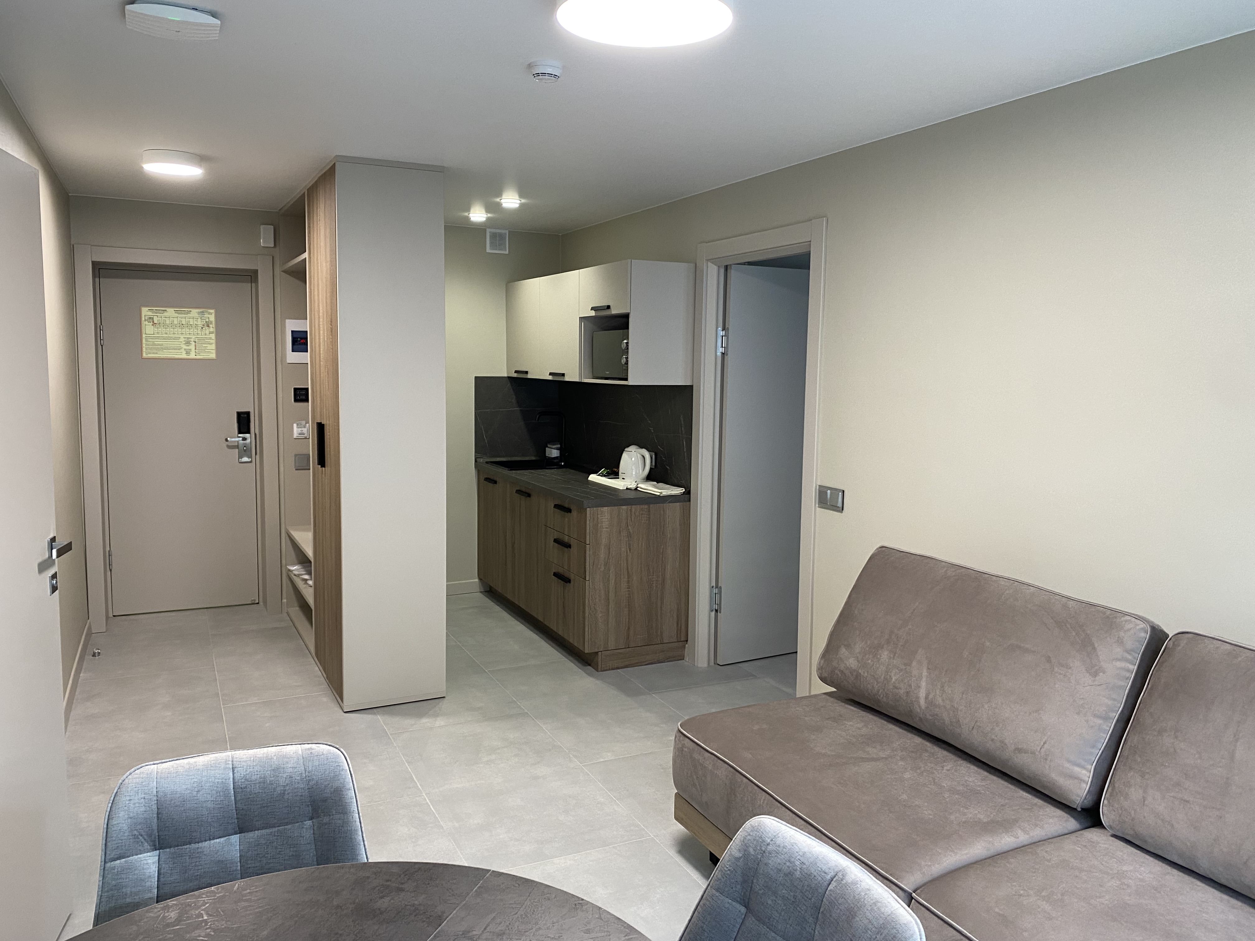 В номере: вешалка, диван, зеркало, кровати односпальные, кровать двуспальная, стол, стулья, шкаф, кондиционер, микроволновая печь, набор посуды, телевизор, холодильник, чайный набор посуды, электрочайник