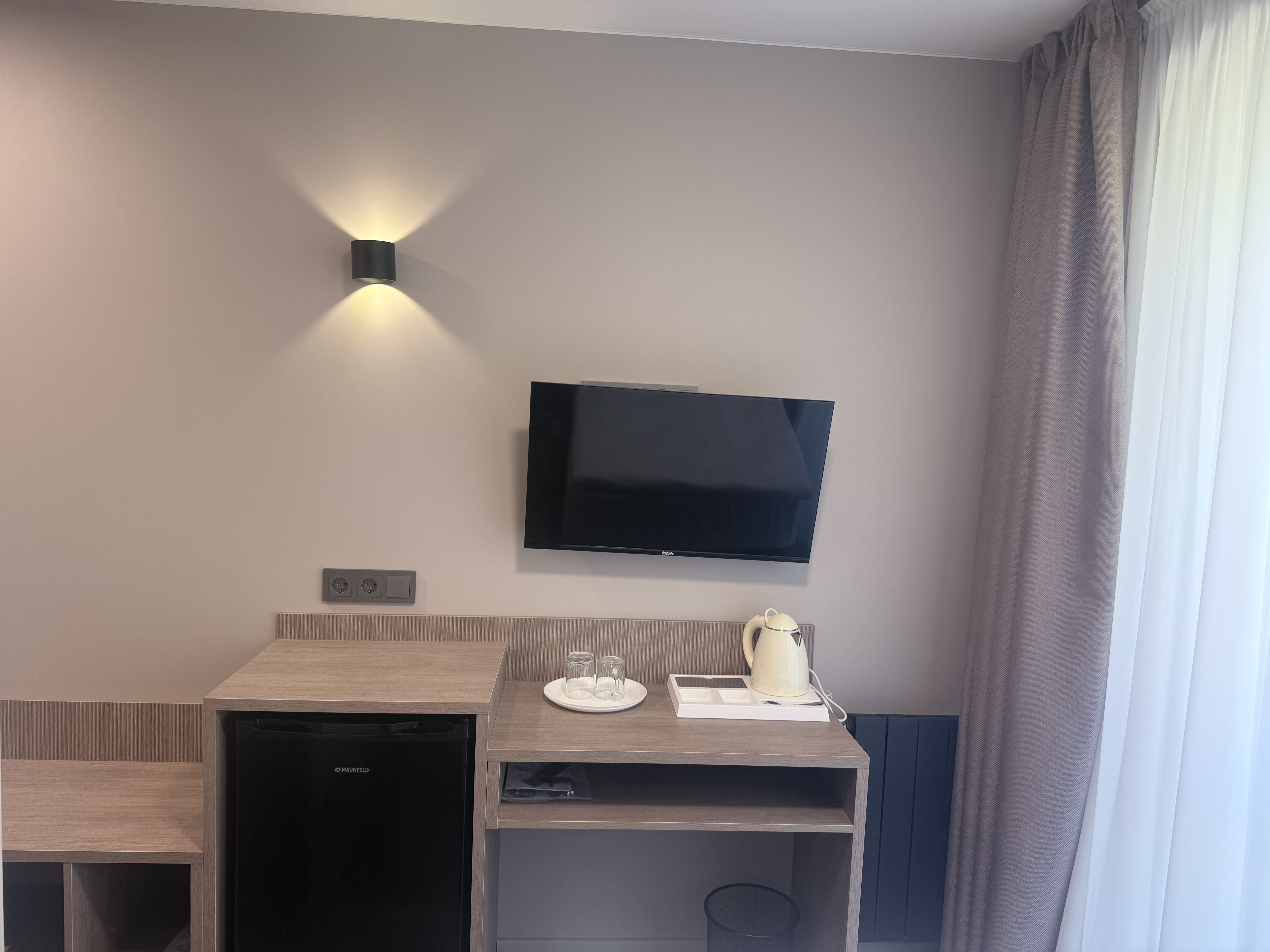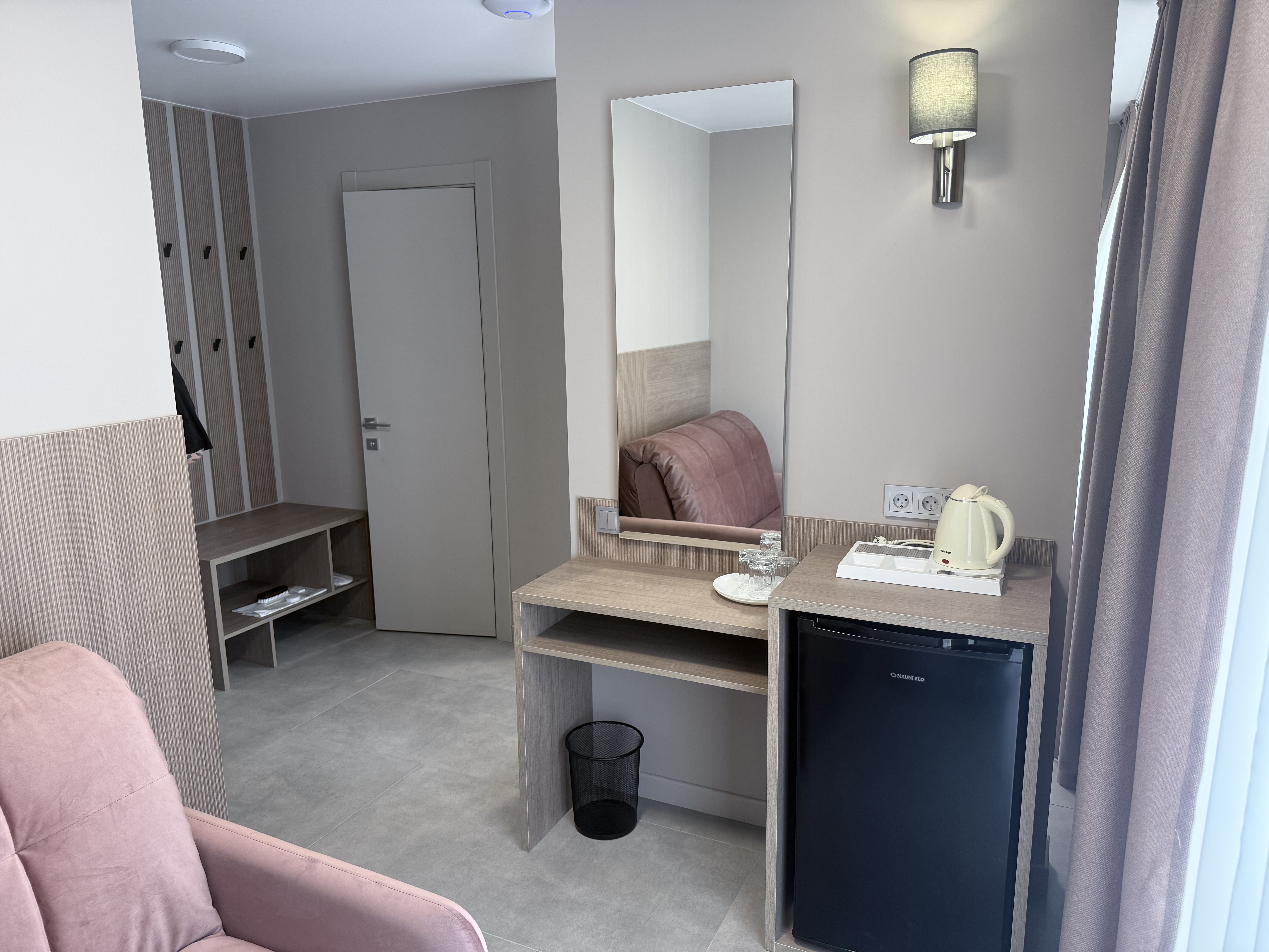 В номере: вешалка, зеркало, кресло-кровать, прикроватная тумбочка, пуфик, стол, шкаф, кондиционер, сейф, телевизор ЖК, телефон, холодильник, чайная станция