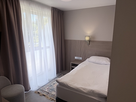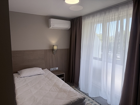 В номере: вешалка, зеркало, кровать односпальная, прикроватная тумбочка, пуфик, стол, шкаф, кондиционер, сейф, телевизор ЖК, телефон, холодильник, чайная станция