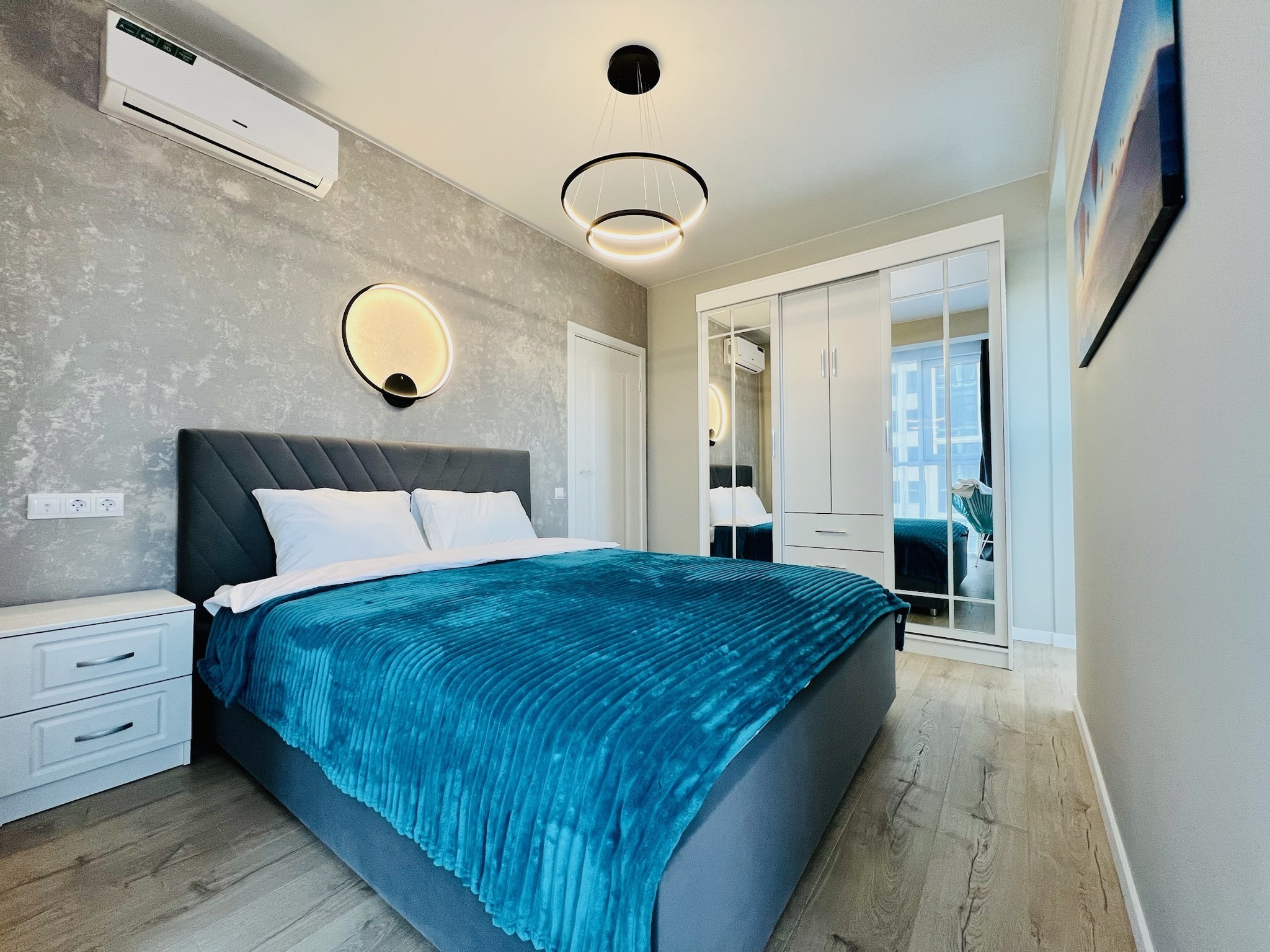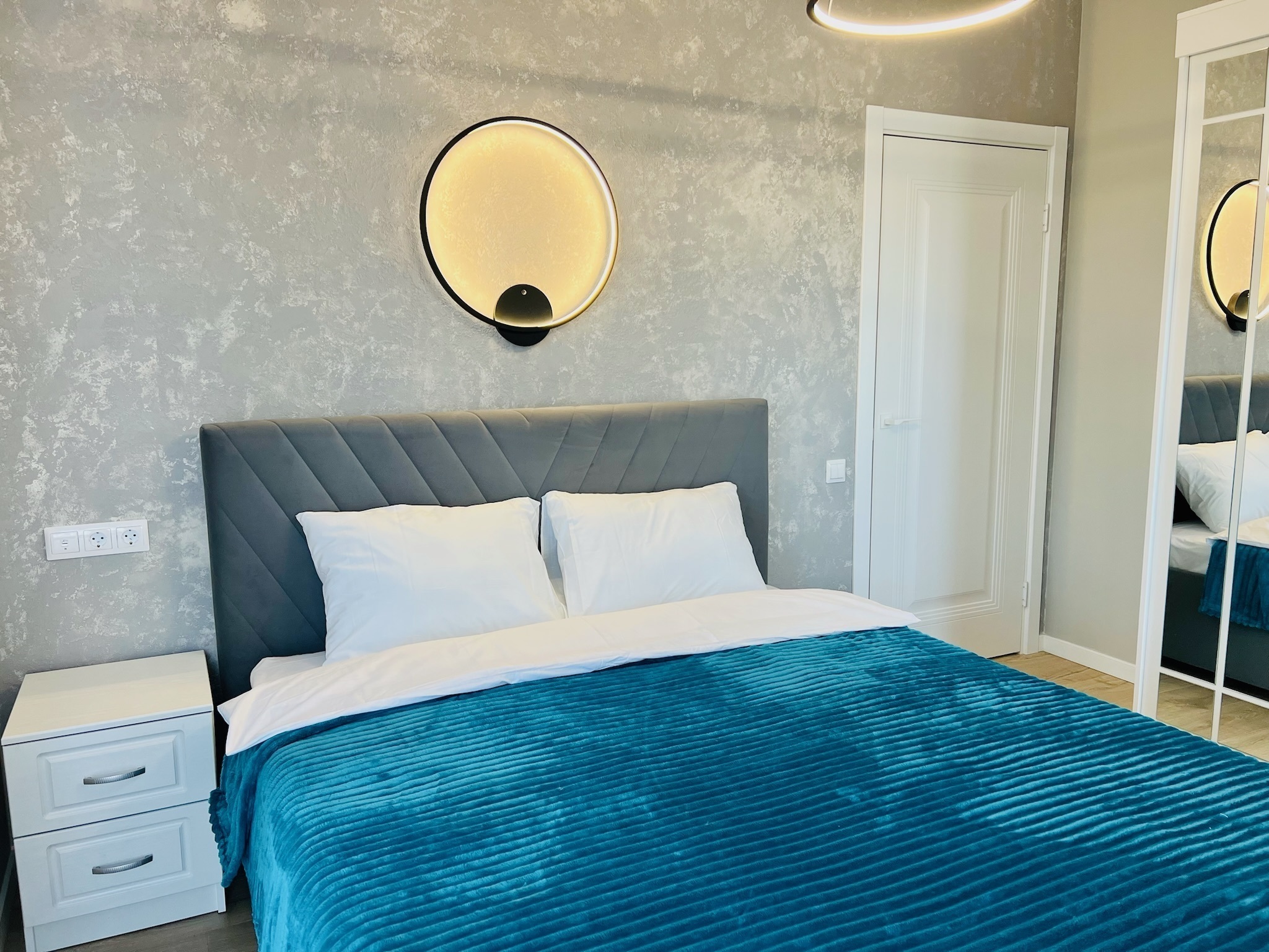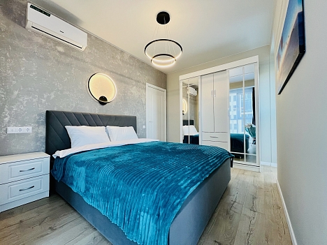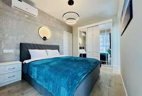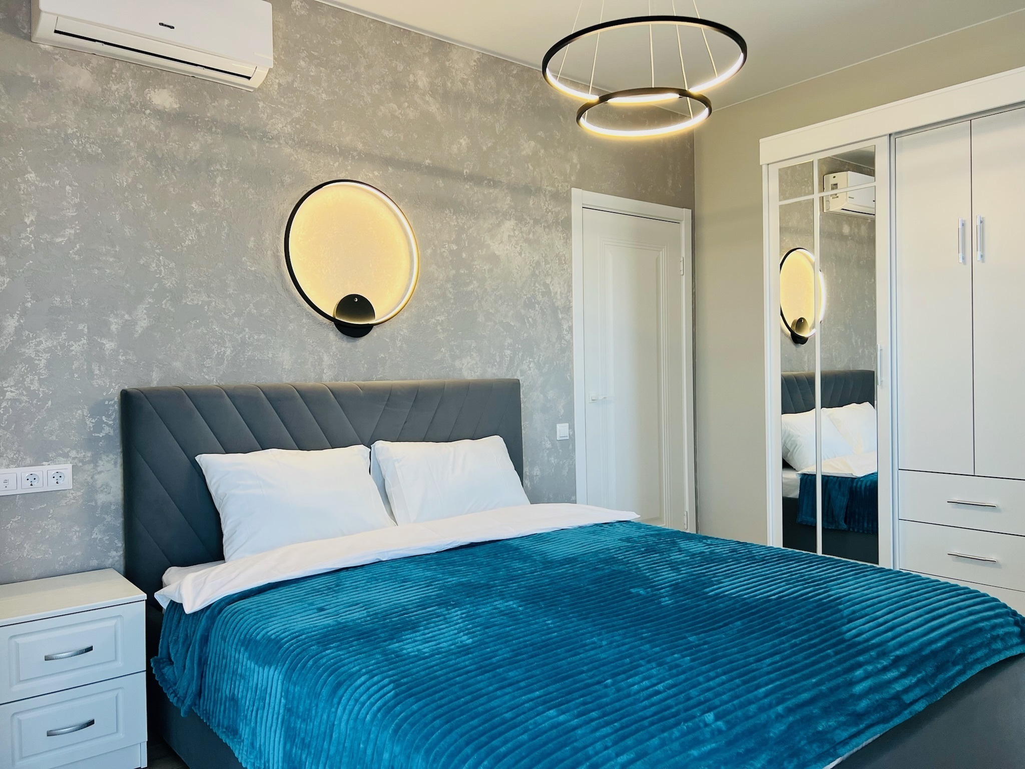 В номере: вешалка, диван, зеркало, кровать двуспальная, прикроватные тумбочки, стол, стулья, тумба, шкаф, гладильная доска, духовой шкаф, кондиционер, микроволновая печь, набор посуды, плита, стиральная машина, телевизор, утюг, холодильник, электрочайник