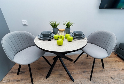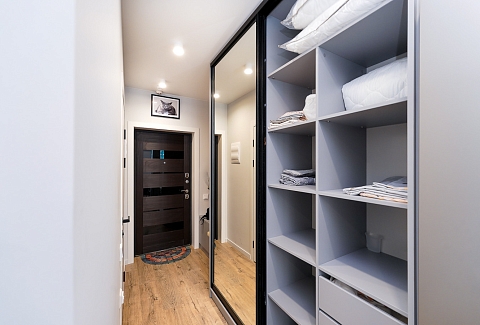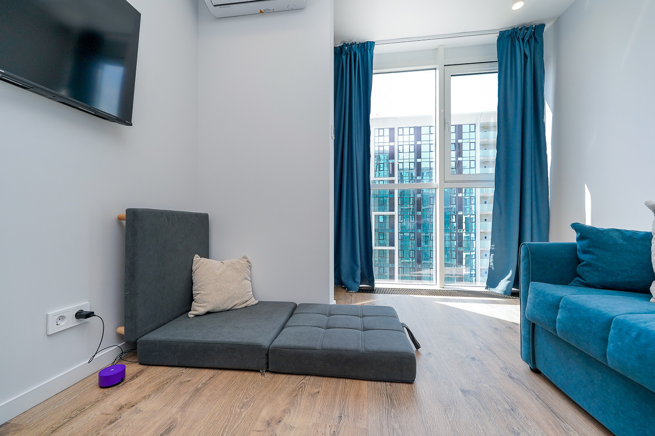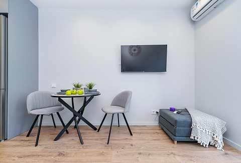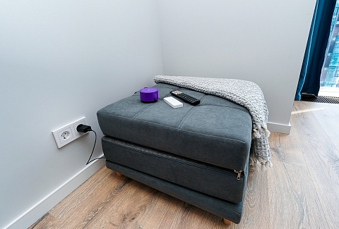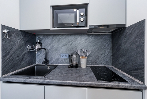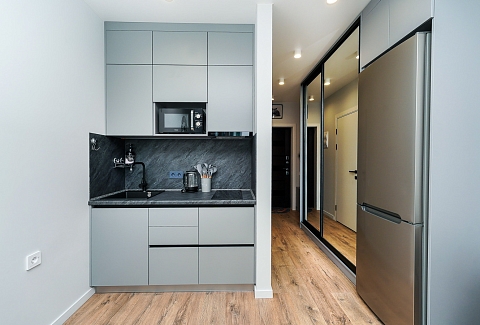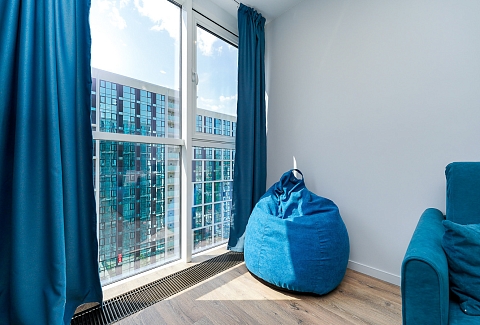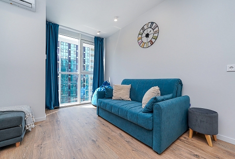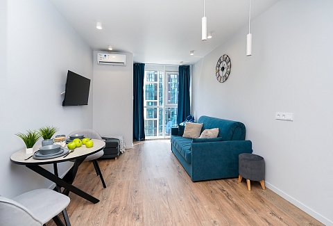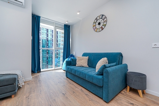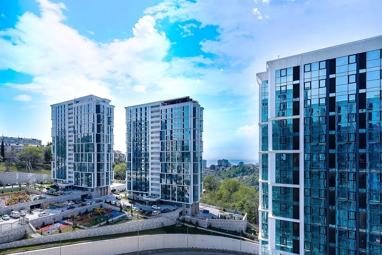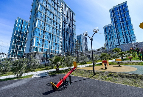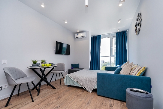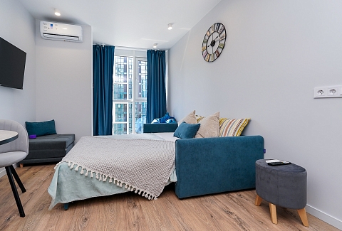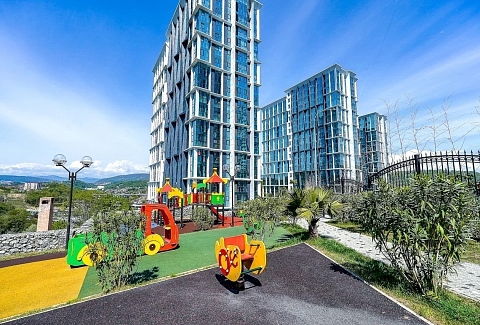 Район удобен для поездок к основным достопримечательностям. Железнодорожный вокзал Сочи находится примерно в 10 минутах на автомобиле, Олимпийский парк и аэропорт Сочи — около 40 минут, Красная Поляна — около часа десяти минут. До городских пляжей с прозрачной водой и до парка «Дендрарий» — всего 7 минут езды.Внутреннее пространство детально продумано. Для сна и отдыха предусмотрены большой двуспальный раскладной диван с ортопедическим матрасом и раскладной пуф-диван. Есть вместительный шкаф для вещей. Большие панорамные окна выходят на Чёрное море. Оборудована отдельная обеденная зона. Кухня выполнена в современном стиле: холодильник, встраиваемая варочная панель, вытяжка, микроволновая печь, чайник, а также полный набор посуды и кухонных принадлежностей.Из техники и электроники предусмотрены ЖК-телевизор с голосовым помощником, быстрый стабильный Wi-Fi, кондиционер, стиральная машина, фен, утюг, гладильная доска и сушилка для белья. Совмещённый санузел оснащён душем, туалетом и большим зеркалом с подсветкой. В стоимость проживания включены постельное бельё, полотенца, разовый гигиенический набор (мыло, гель для душа, шампунь), а также средство для мытья посуды.На территории комплекса предусмотрены бизнес-центр, гастро-корт, супермаркет с собственной кулинарией, буфетом и кофейней, спортивные и детские площадки, отдельные зоны отдыха, мангальная зона, а также открытые террасы с газонной травой, клумбами и живыми насаждениями.