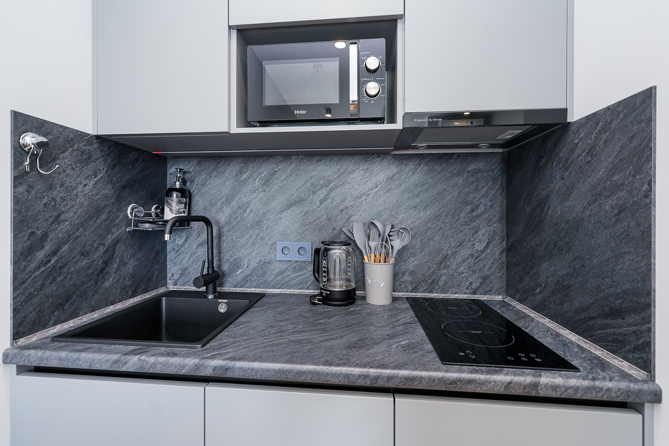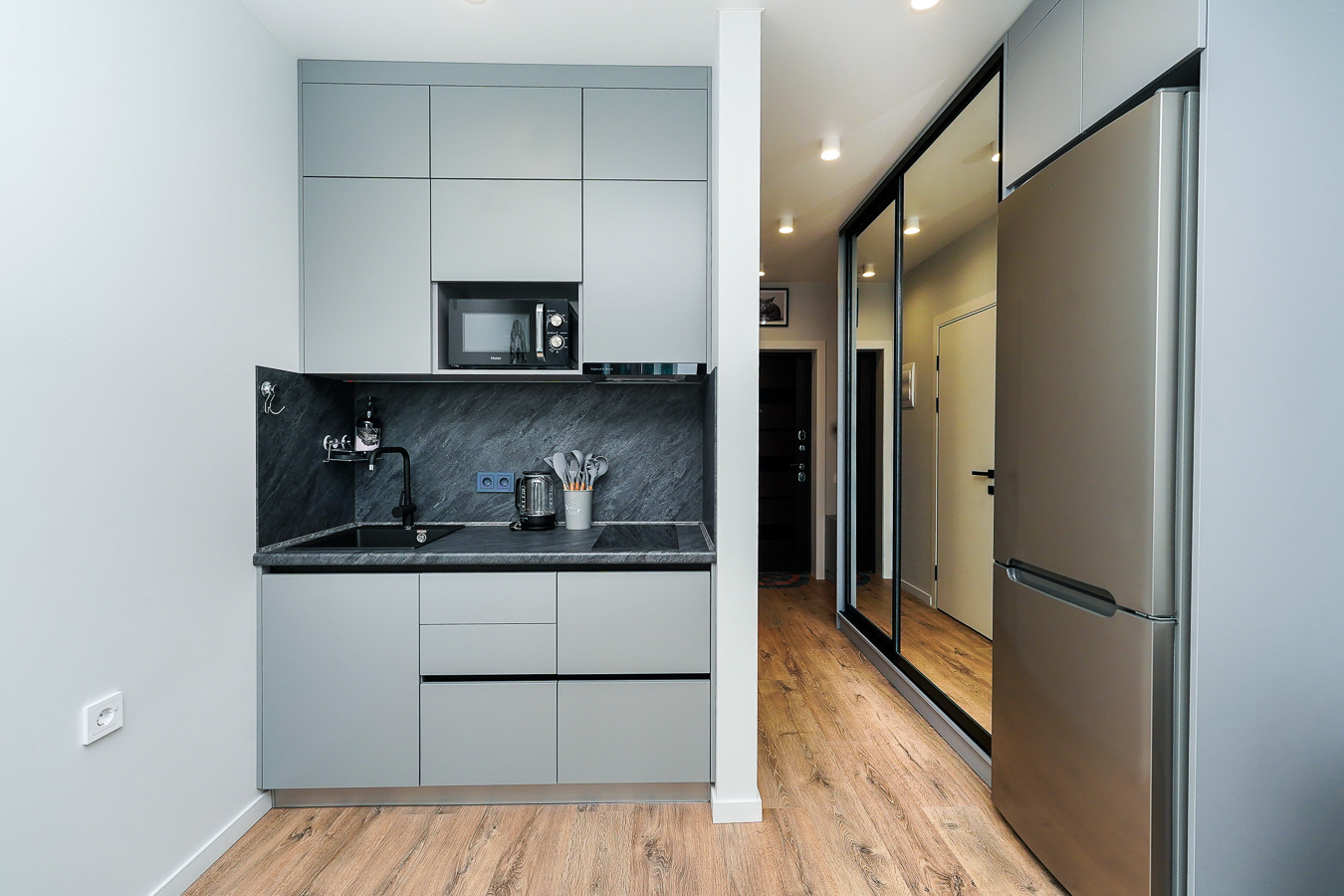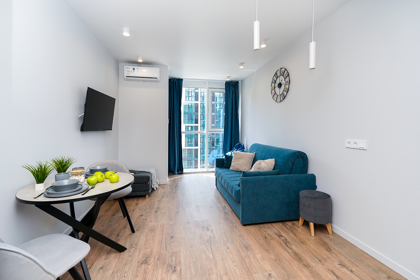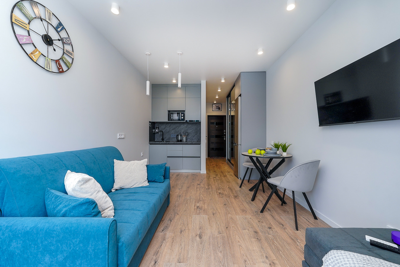 Район удобен для поездок к основным достопримечательностям. Железнодорожный вокзал Сочи находится примерно в 10 минутах на автомобиле, Олимпийский парк и аэропорт Сочи — около 40 минут, Красная Поляна — около часа десяти минут. До городских пляжей с прозрачной водой и до парка «Дендрарий» — всего 7 минут езды.Внутреннее пространство детально продумано. Для сна и отдыха предусмотрены большой двуспальный раскладной диван с ортопедическим матрасом и раскладной пуф-диван. Есть вместительный шкаф для вещей. Большие панорамные окна выходят на Чёрное море. Оборудована отдельная обеденная зона. Кухня выполнена в современном стиле: холодильник, встраиваемая варочная панель, вытяжка, микроволновая печь, чайник, а также полный набор посуды и кухонных принадлежностей.Из техники и электроники предусмотрены ЖК-телевизор с голосовым помощником, быстрый стабильный Wi-Fi, кондиционер, стиральная машина, фен, утюг, гладильная доска и сушилка для белья. Совмещённый санузел оснащён душем, туалетом и большим зеркалом с подсветкой. В стоимость проживания включены постельное бельё, полотенца, разовый гигиенический набор (мыло, гель для душа, шампунь), а также средство для мытья посуды.На территории комплекса предусмотрены бизнес-центр, гастро-корт, супермаркет с собственной кулинарией, буфетом и кофейней, спортивные и детские площадки, отдельные зоны отдыха, мангальная зона, а также открытые террасы с газонной травой, клумбами и живыми насаждениями.