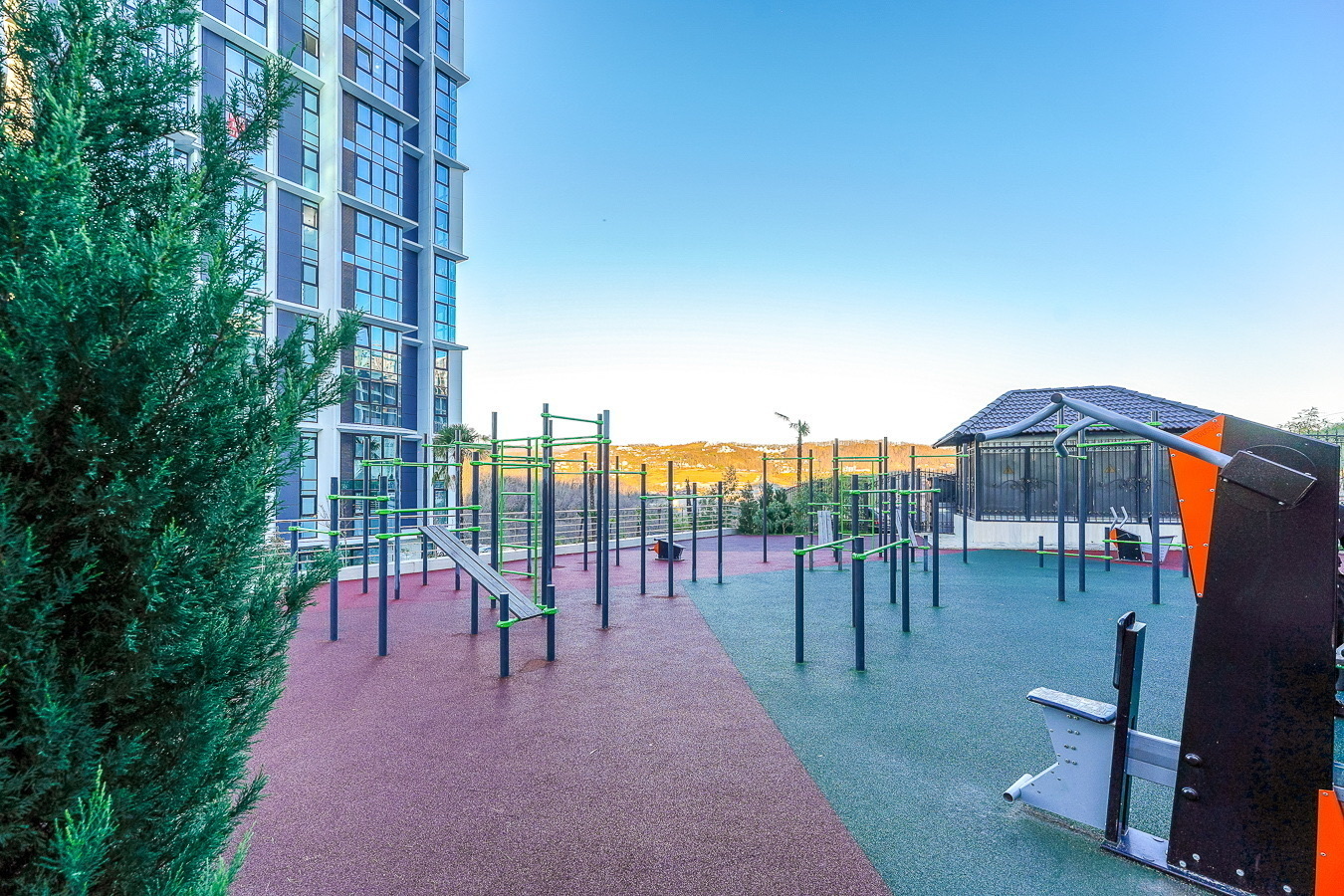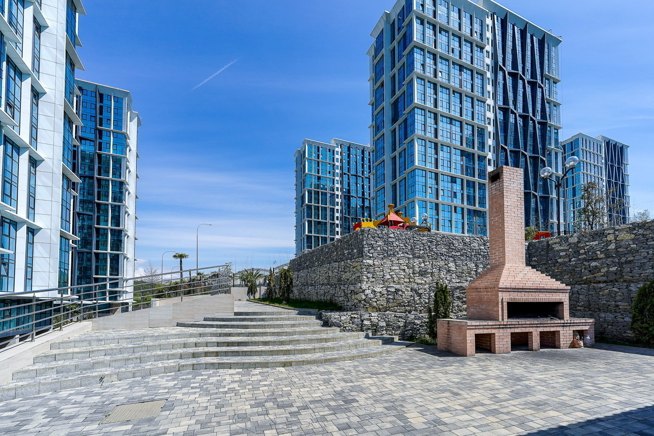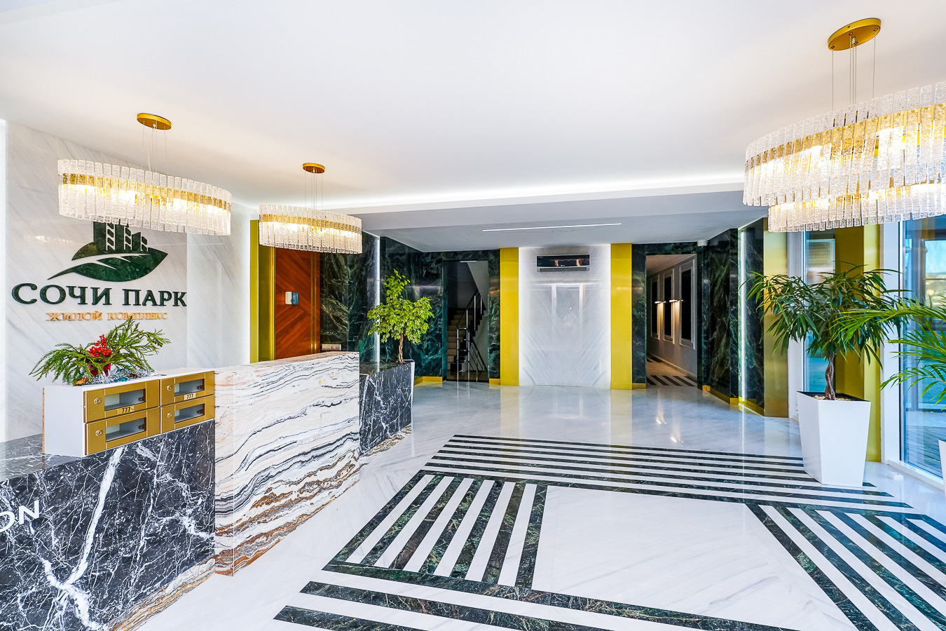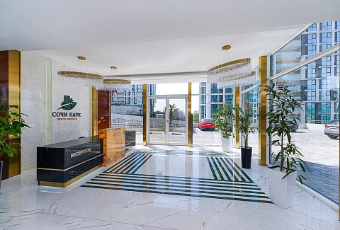 Это пространство расположено в жилом комплексе бизнес-класса «Сочи-парк», в новом районе Сочи. Из окон открываются великолепные пейзажи в обе стороны — на море, горы и окрестности города. Апартаменты оснащены системой «умный дом»: с помощью голосового помощника можно управлять телевизором, электрочайником и карнизом со шторами.