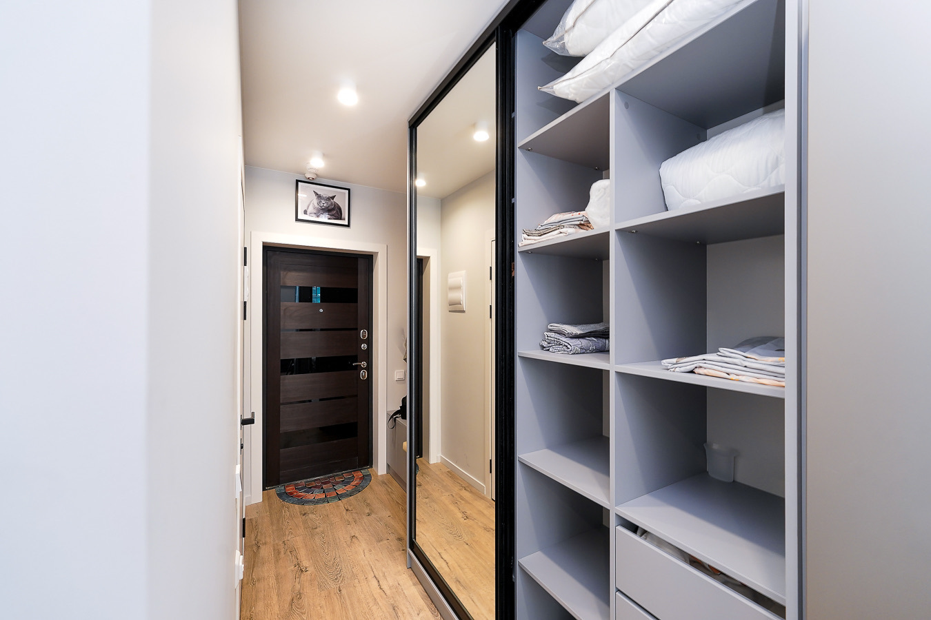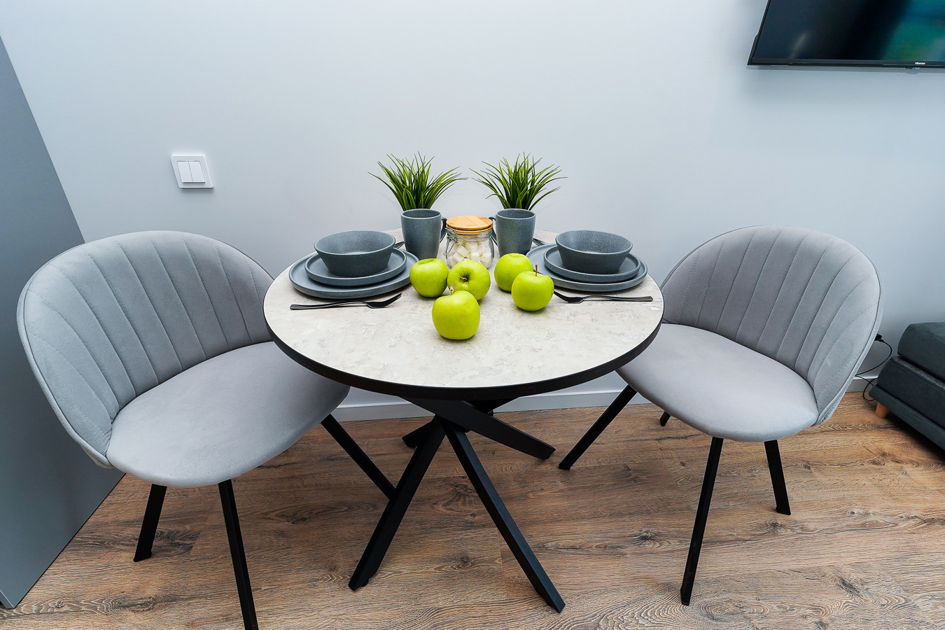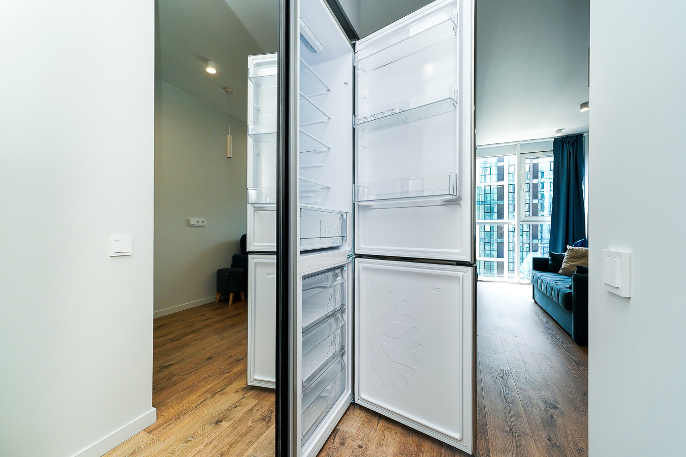 Это пространство расположено в жилом комплексе бизнес-класса «Сочи-парк», в новом районе Сочи. Из окон открываются великолепные пейзажи в обе стороны — на море, горы и окрестности города. Апартаменты оснащены системой «умный дом»: с помощью голосового помощника можно управлять телевизором, электрочайником и карнизом со шторами.