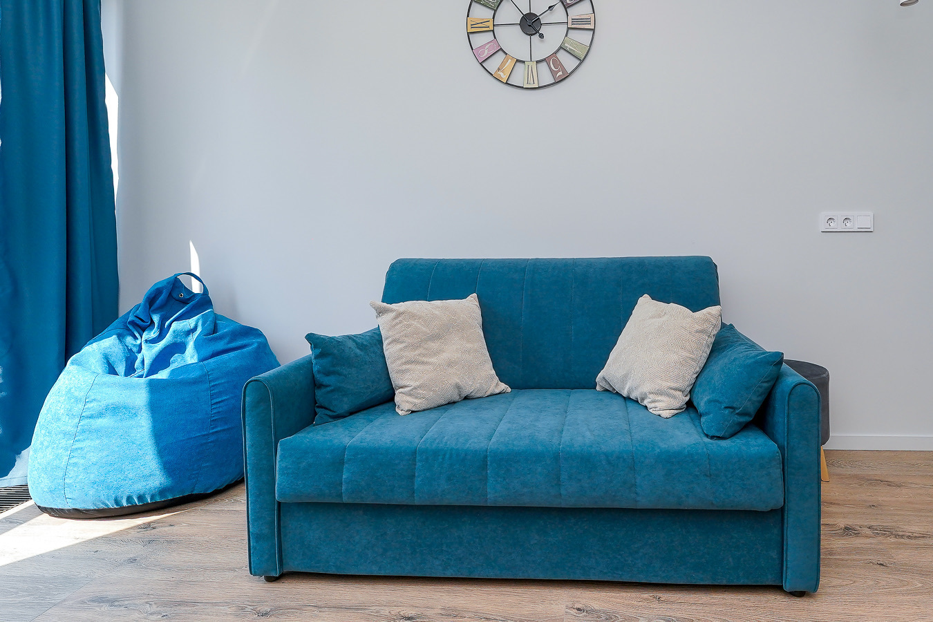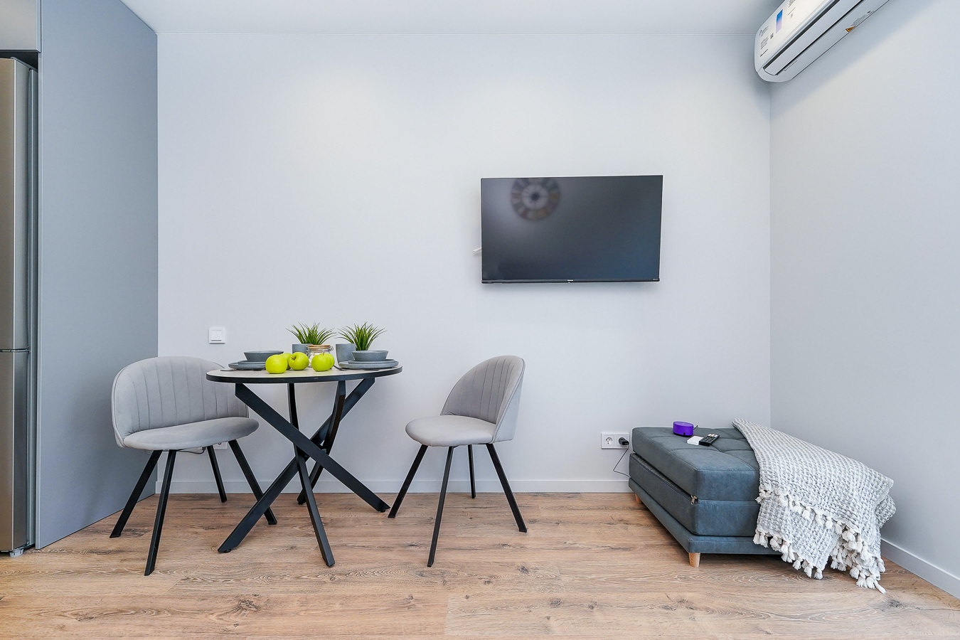 В номере: вешалка, диван, зеркало, пуфик, стол, стулья, тумба, шкаф, гладильная доска, кондиционер, микроволновая печь, набор посуды, плита, стиральная машина, телевизор, утюг, холодильник, электрочайник