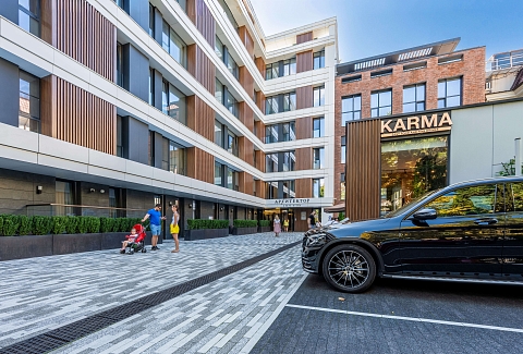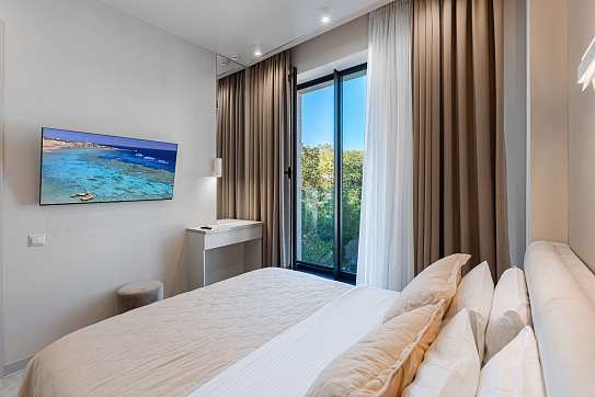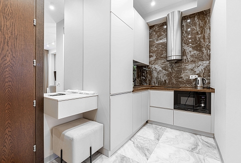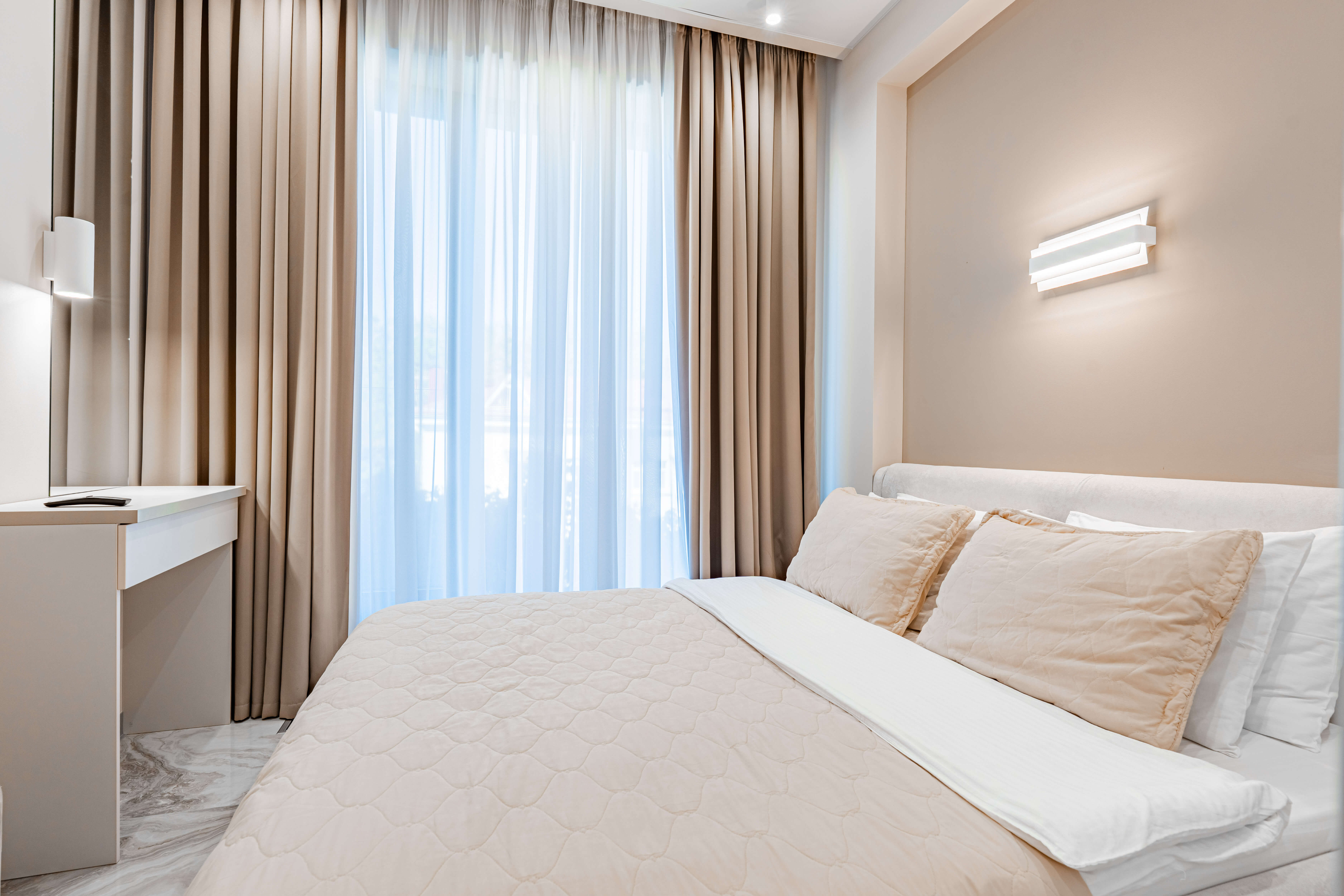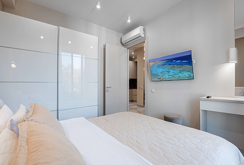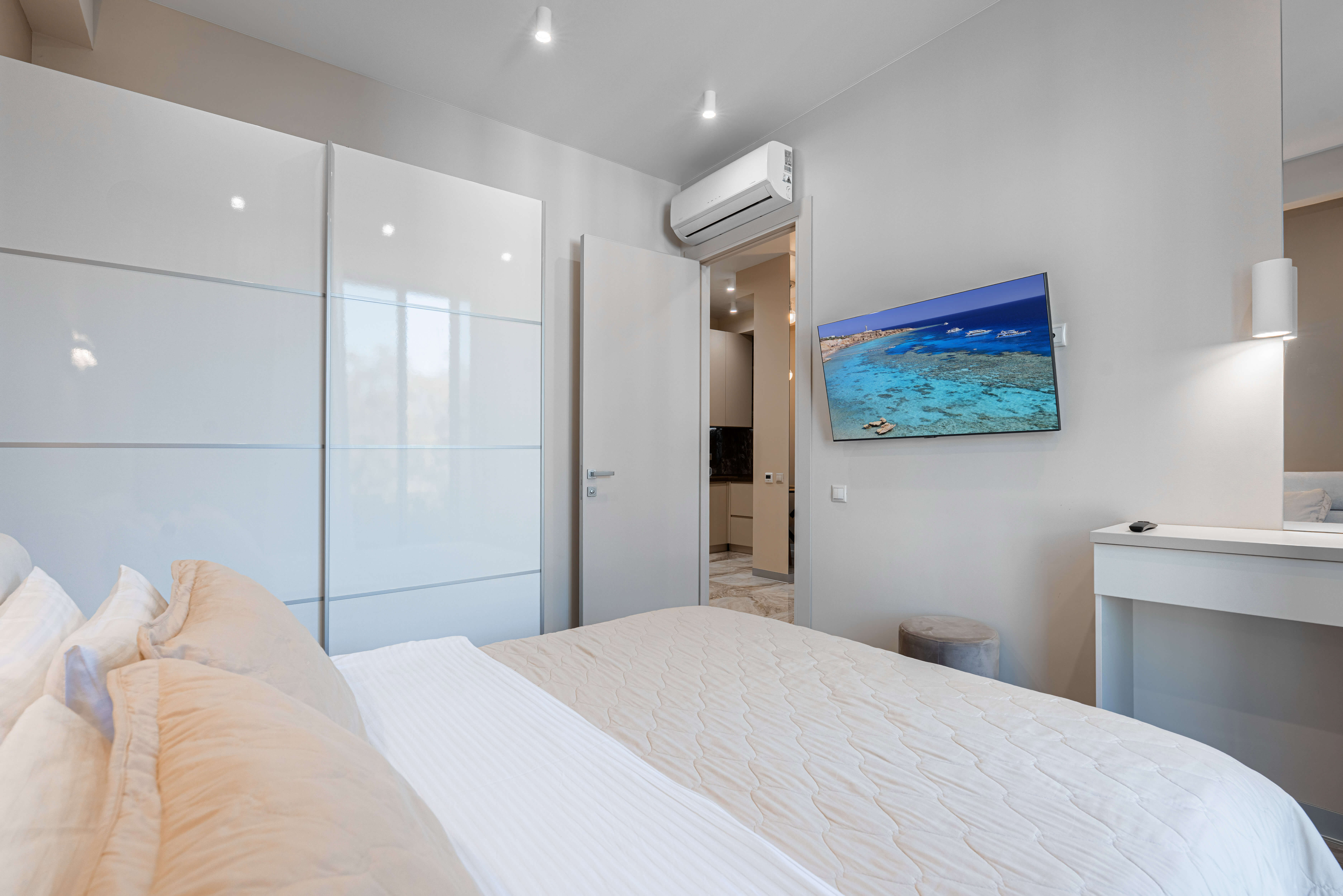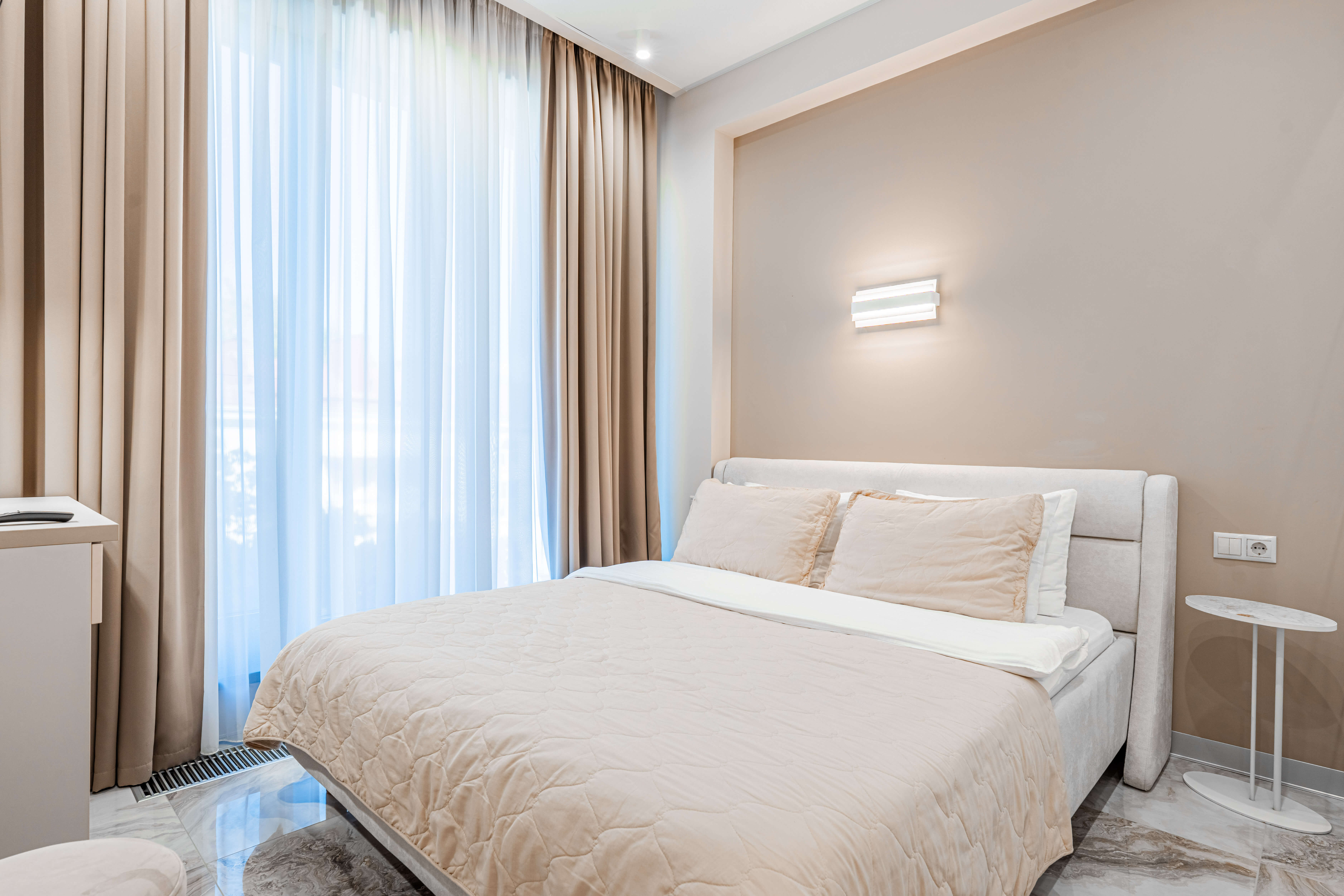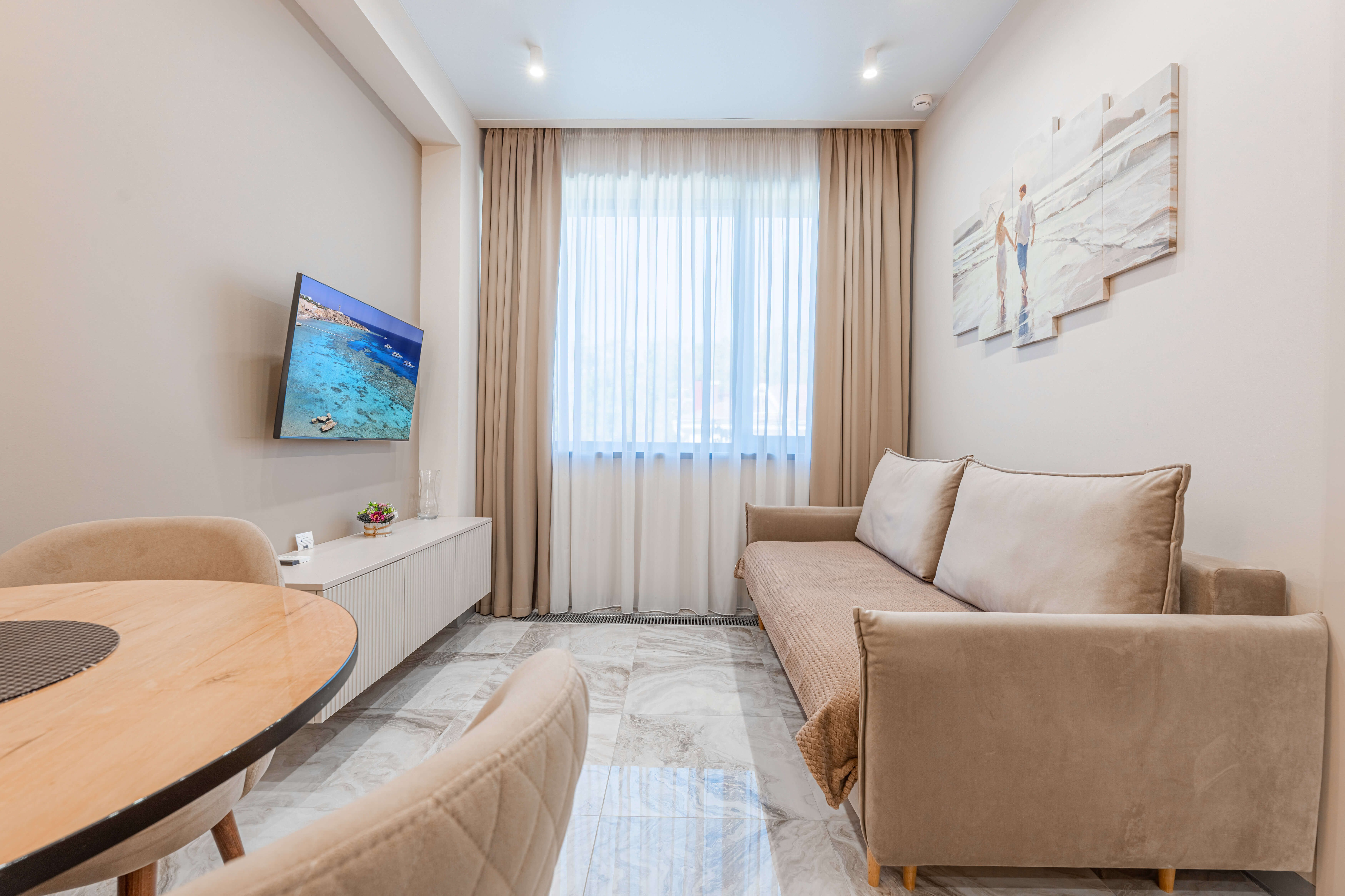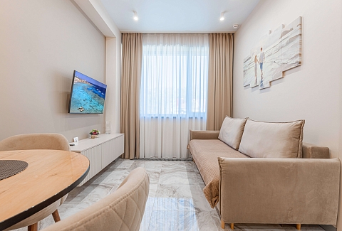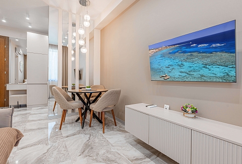 Апартаменты выполнены в светлых тонах, с новым ремонтом и мраморным полом. Полностью меблирована, с современной мебелью и техникой. Для гостей предоставлена удобная кровать с качественным матрасом, встроенные системы хранения, есть кондиционер для комфортного сна.
