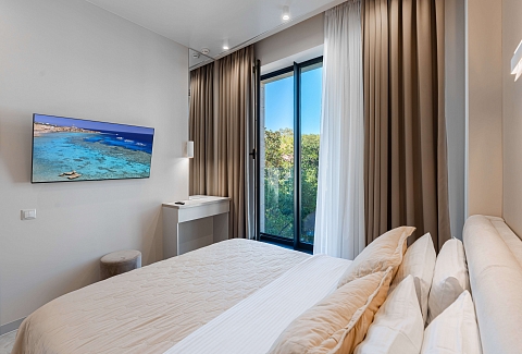 В номере: вешалка, диван раскладной, зеркало, кровать двуспальная, пуфик, стол обеденный, стулья, тумба, шкаф, гладильная доска, духовой шкаф, кондиционер, микроволновая печь, набор посуды, плита электрическая, стиральная машина, телевизор, утюг, электрическая простынь с подогревом