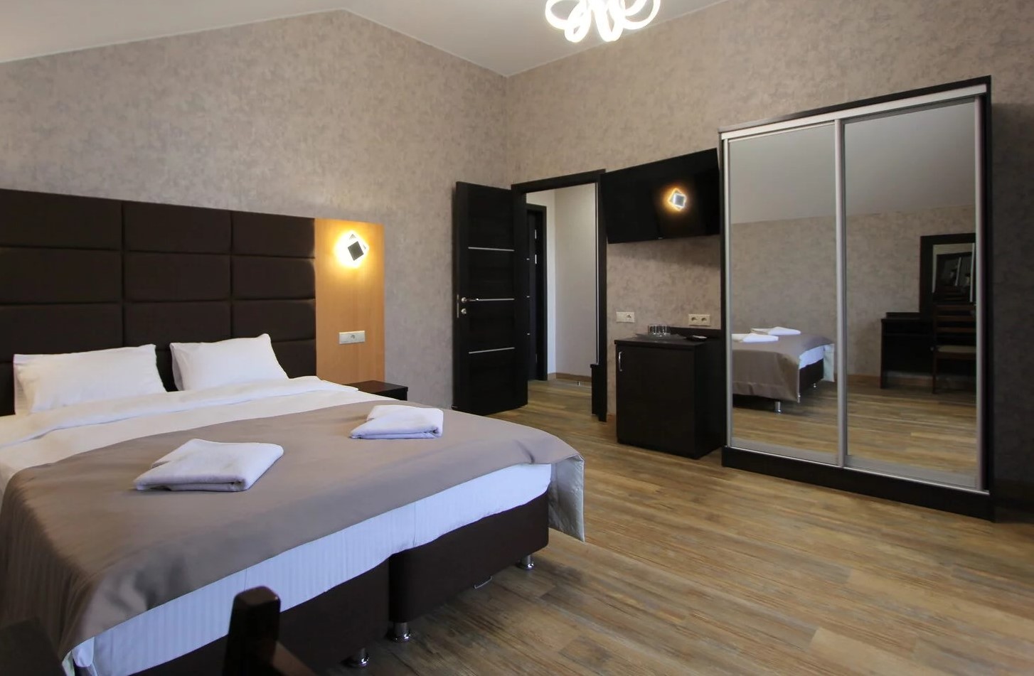 В номере: вешалка, зеркало, кровать двуспальная, кровать односпальная, прикроватные тумбочки, стол, стулья, шкаф, мини-холодильник, сплит-система, телевизор