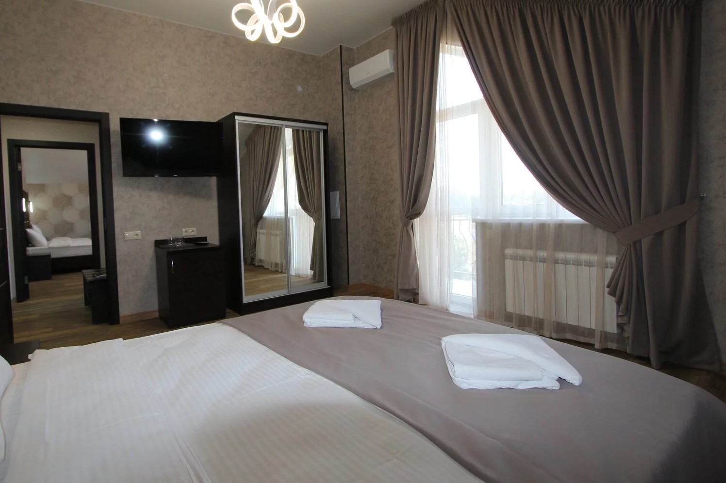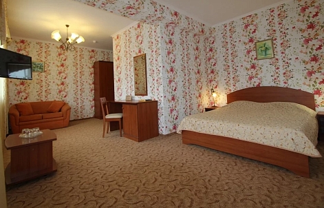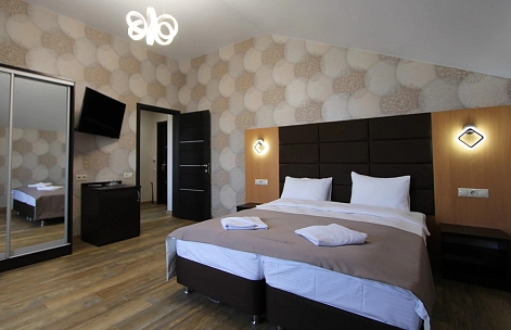 В номере: вешалка, диван, зеркало, кровать двуспальная, прикроватные тумбочки, стол, стулья, шкаф, мини-холодильник, сплит-система, телевизор