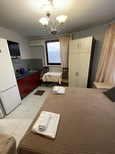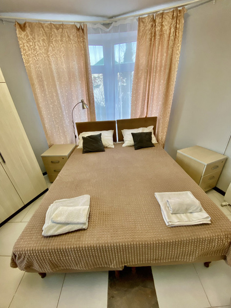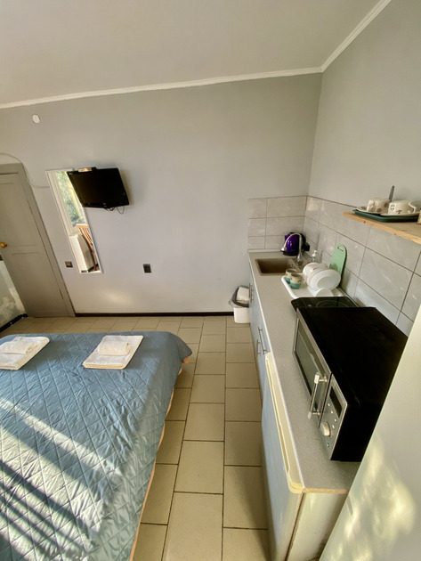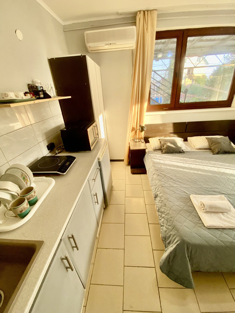 В номере: вешалка, зеркало, кровать двуспальная, прикроватные тумбочки, стол, столик журнальный, стулья, кондиционер, микроволновая печь, мини-холодильник, набор посуды, плита электрическая, телевизор ЖК, холодильник, электрочайник