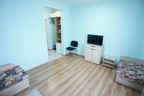 В номере: гардеробная, диван, кровати односпальные, прикроватные тумбочки, стулья, тумба под телевизор, кондиционер, мини-холодильник, пляжные полотенца, телевизор ЖК